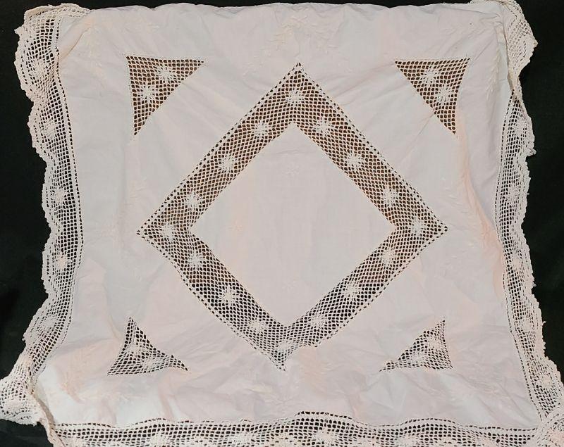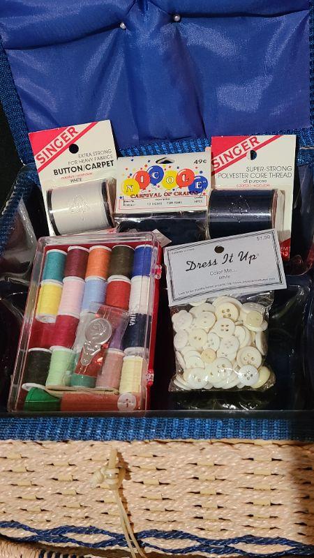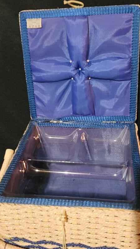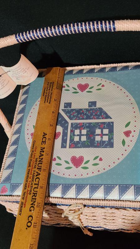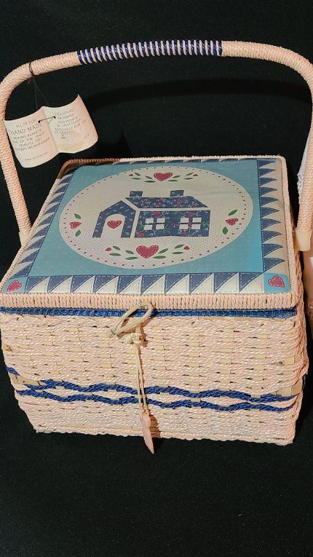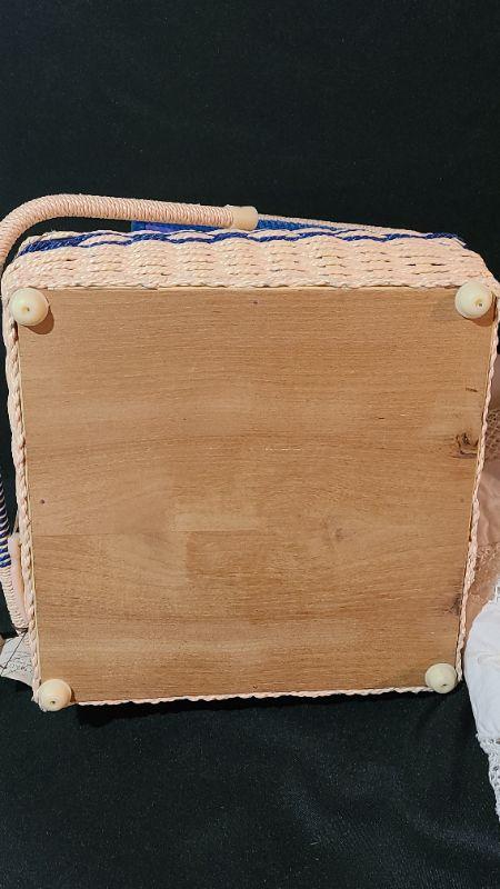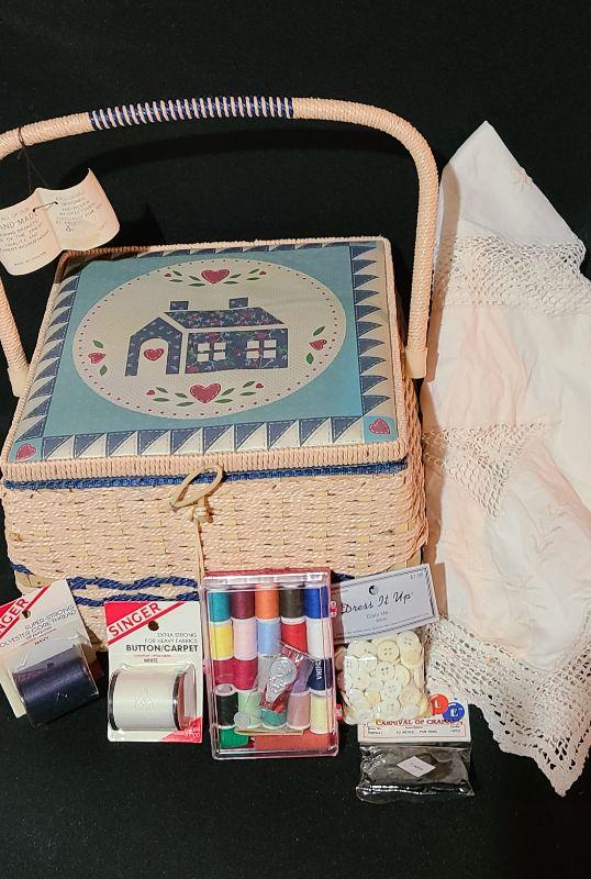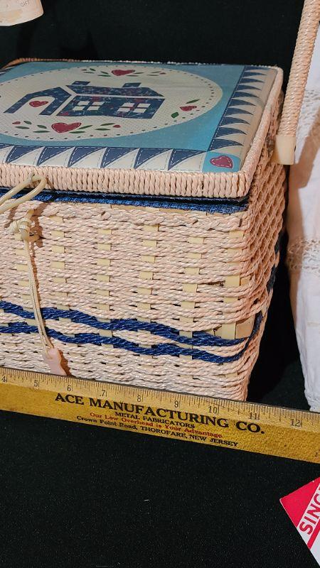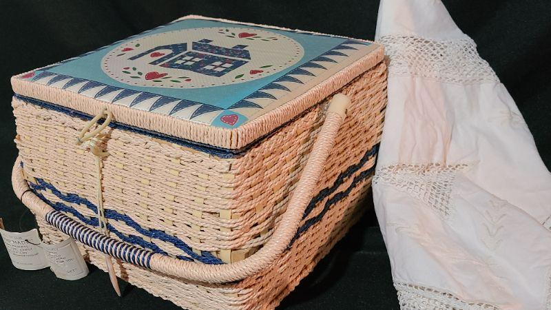 Brand new Azar Industries Sewing Box and Square Table Cover. Table doilie is 29x29 inches, sewing basket is 10x10x8.