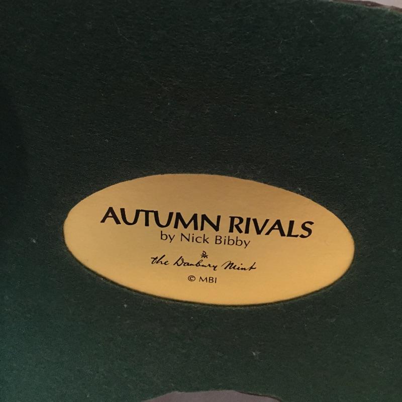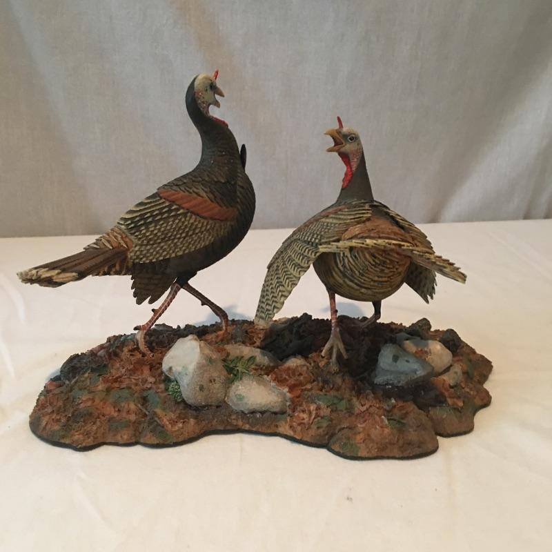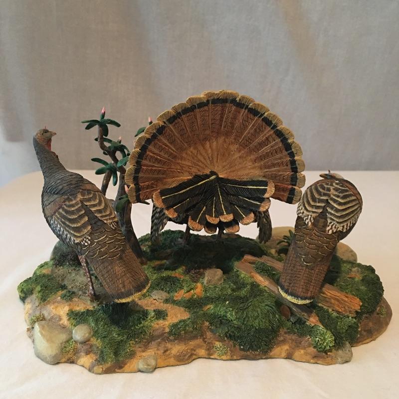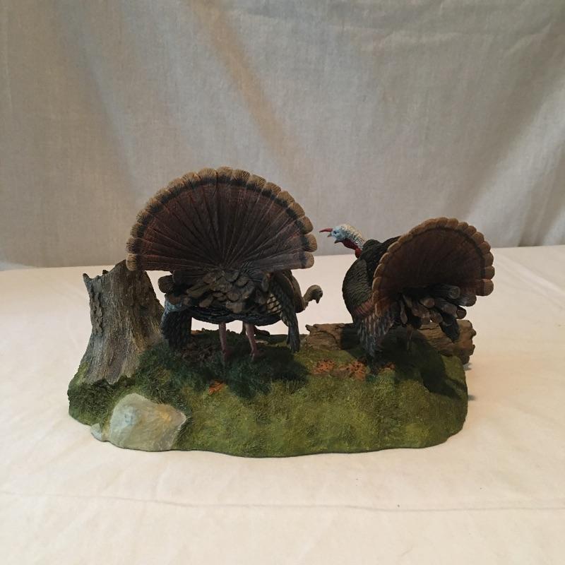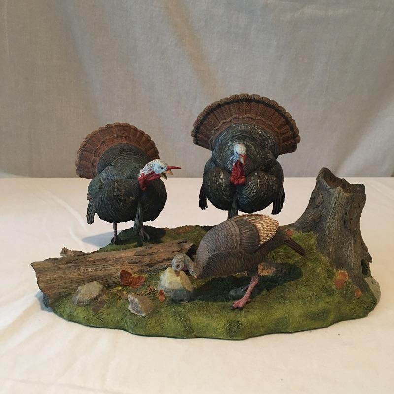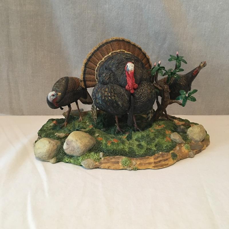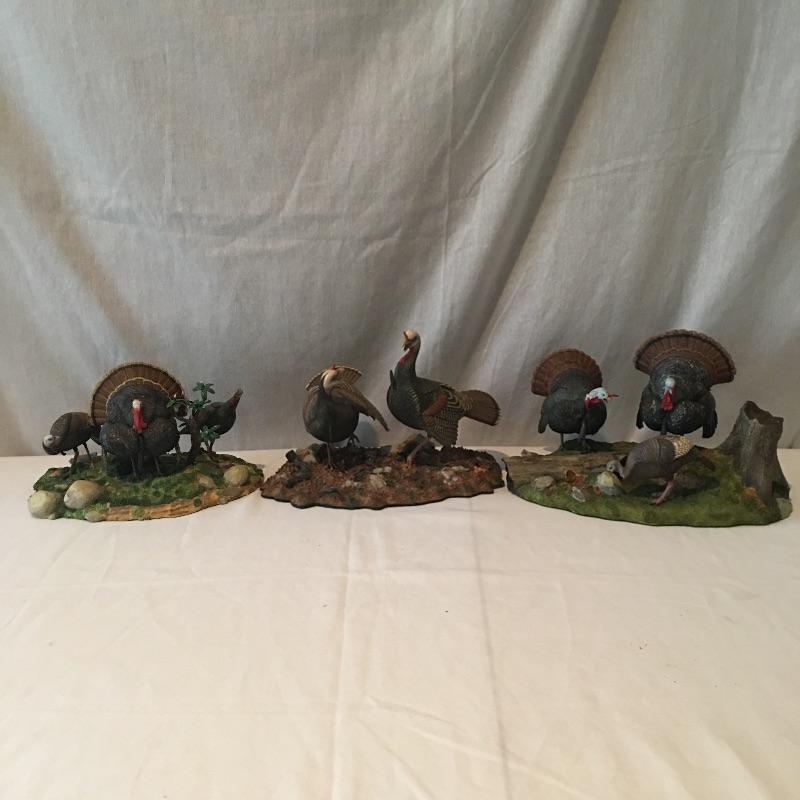 Collectible The Danbury Mint figurines. These three turkeys were designed by Nick Bibby and are titled Wily Jakes, Autumn Rivals and Full Strut. Largest piece measure 7” x 12” x 6.25”. No chips found.