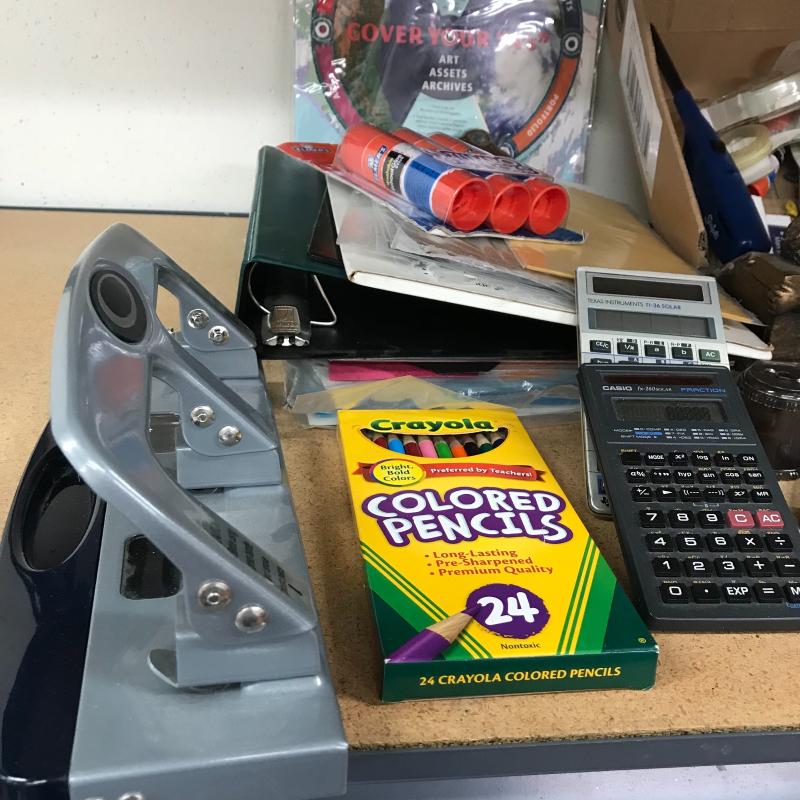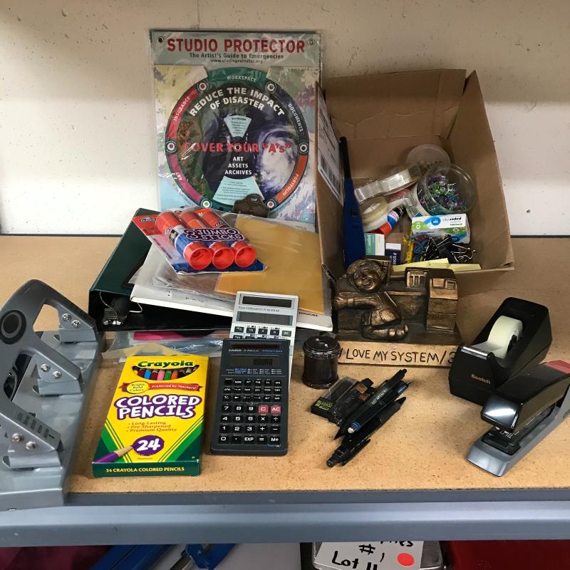 Lot includes two deluxe calculators, hole punch, tape dispenser, stapler, mechanical pencils, and more. Lot is available for local pick up in Asheville, NC only.