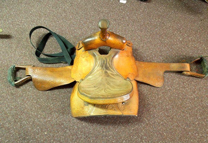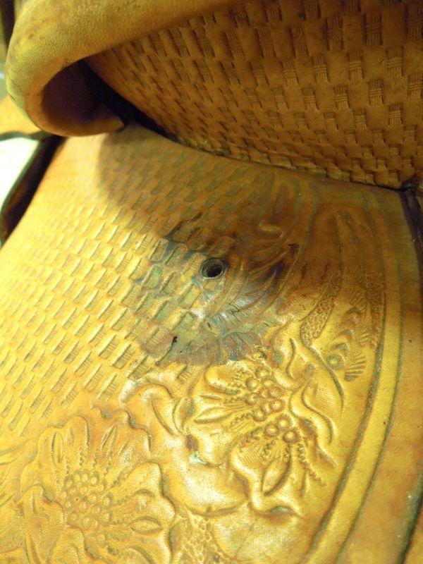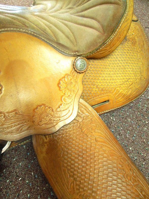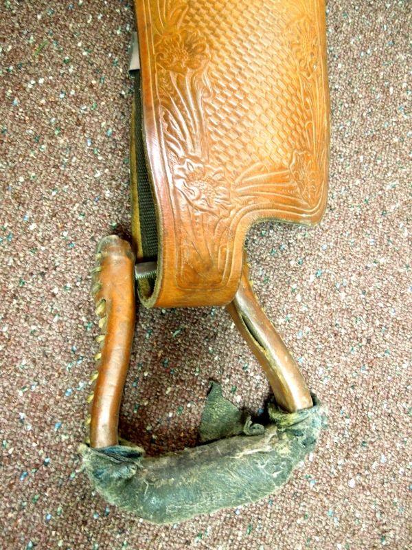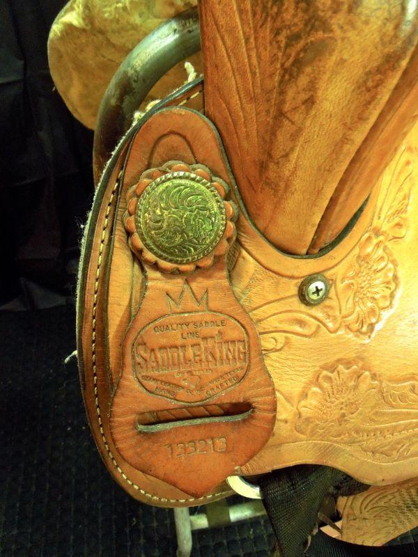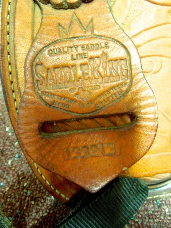 Handsome brown hand-tooled floral pattern leather saddle as made in Texas by Ozark Saddle King Leather Company. This saddle features two tones of brown leatherwith fenders gorgeously embossed in a hand tooled floral pattern, 13" seat, 4" leather covered horn, and stirrups with no-slip leather tread. Latigo holders tooled and also bears the text "Saddle King of Texas". Nylon cinch.