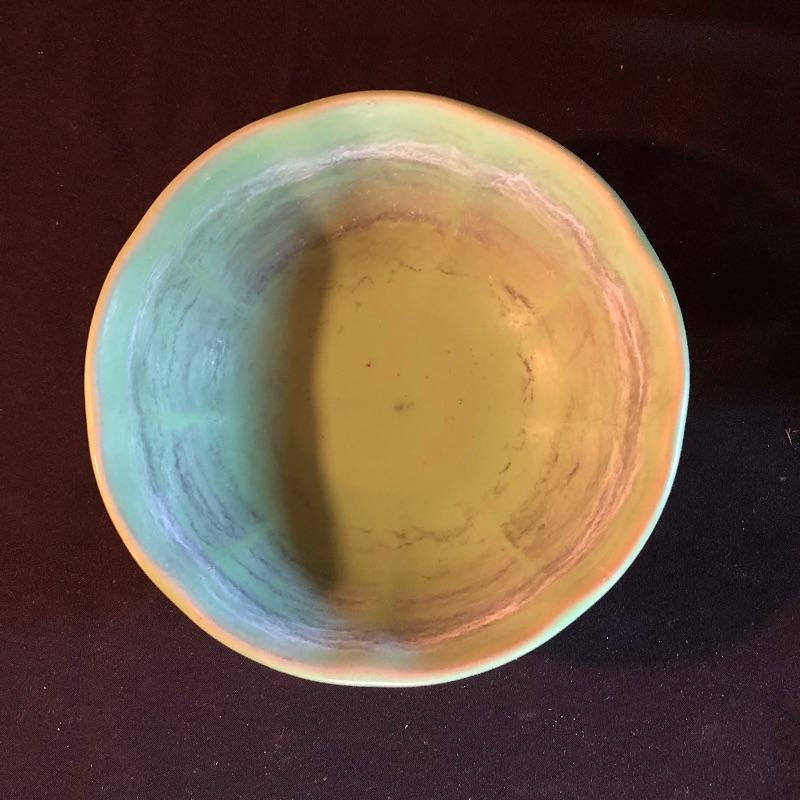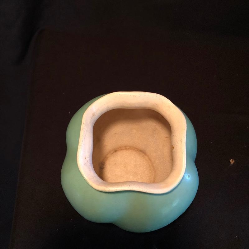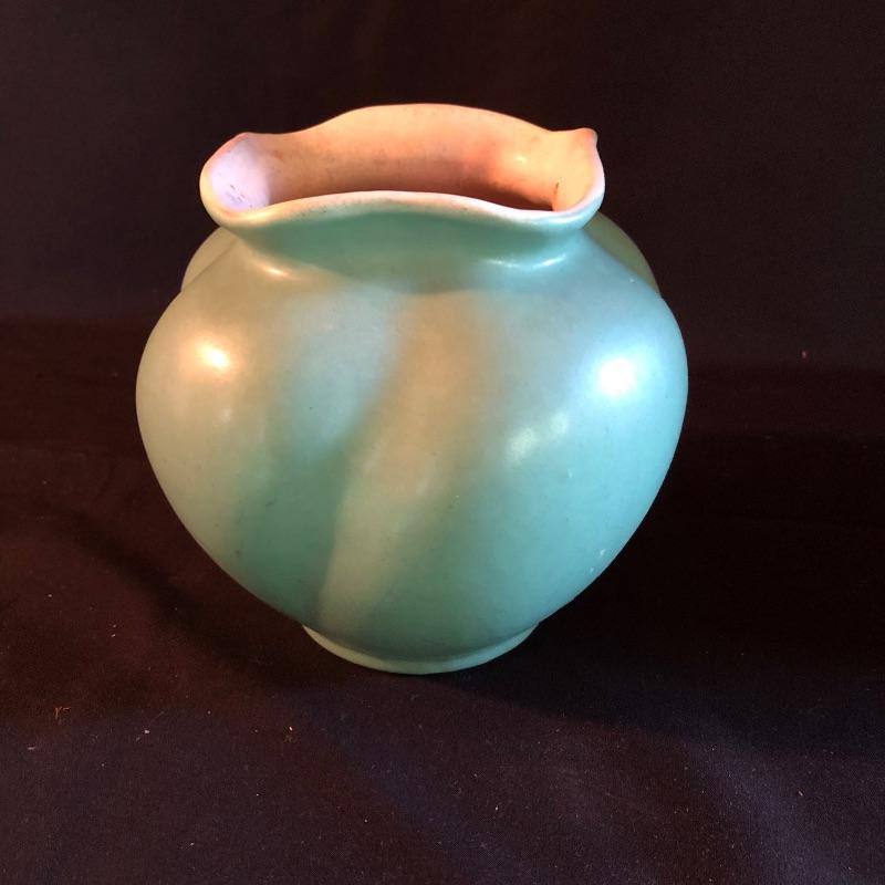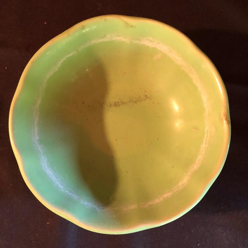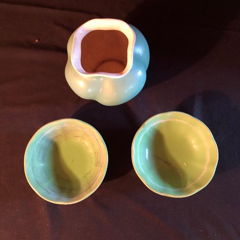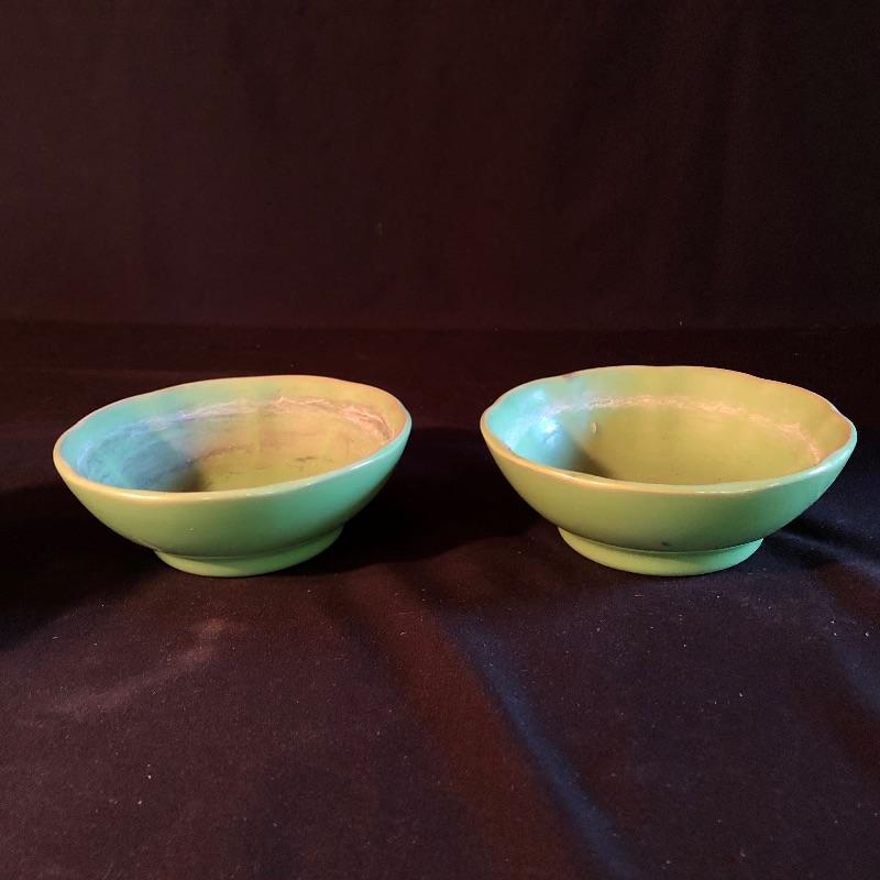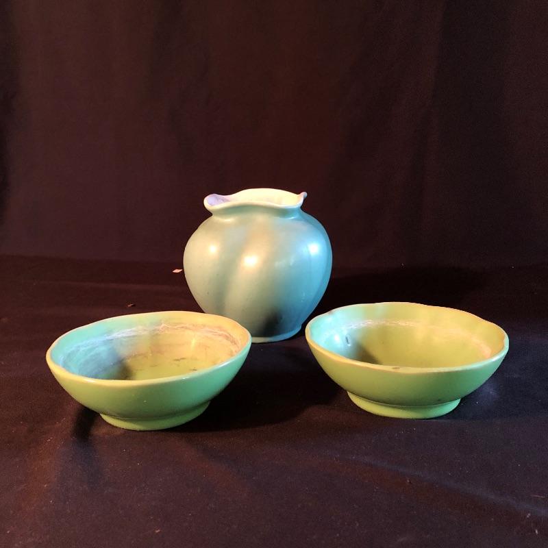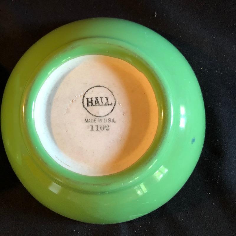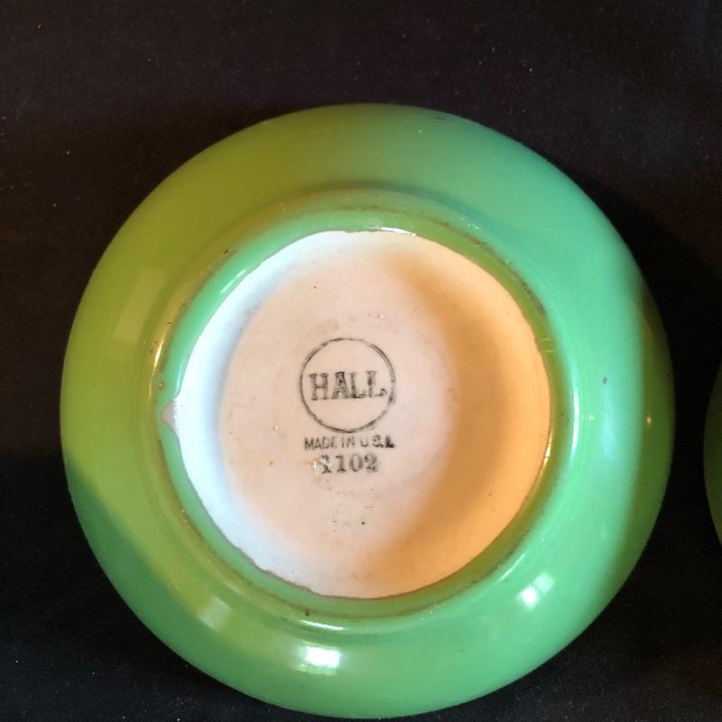 This lot includes a pair of light green ceramic Hall bowls and a turquoise vase. The bowls are thick material and have rings of wear (as seen in pictures). No chips or scratches in the bowls or the vase. The vase is a ceramic material and also has some slight signs of wear. The vase measures about 6in x 6in. The bowls measure 2in x 6in. Shipping available.