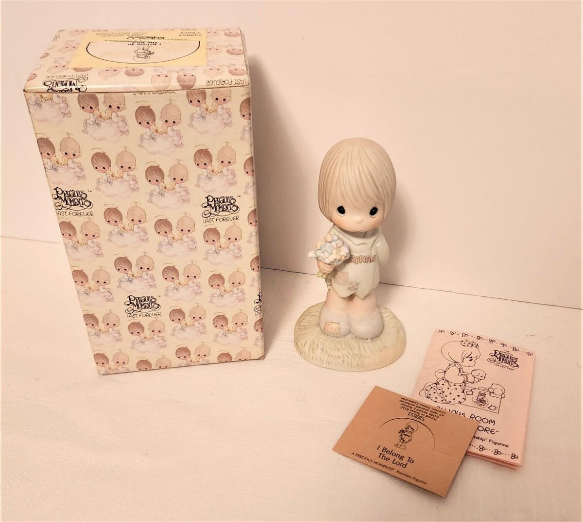 Precious Moments figurine from 1988 "I belong to the Lord", design #520853, original price $25.00, comes with box and paperwork. Good condition, 5" tall.