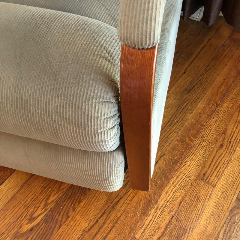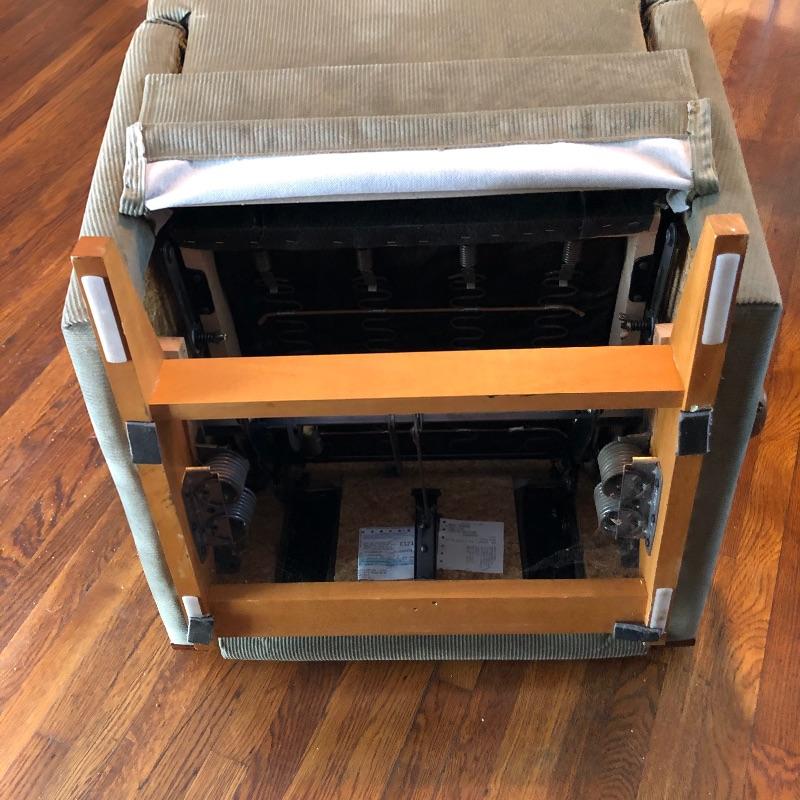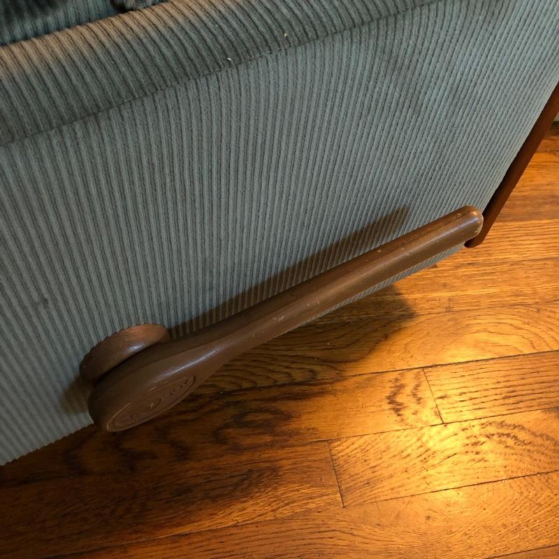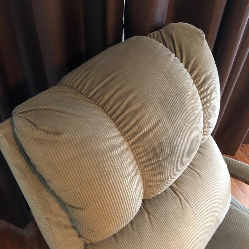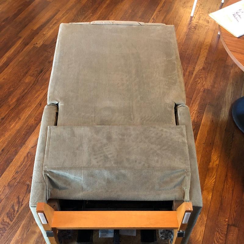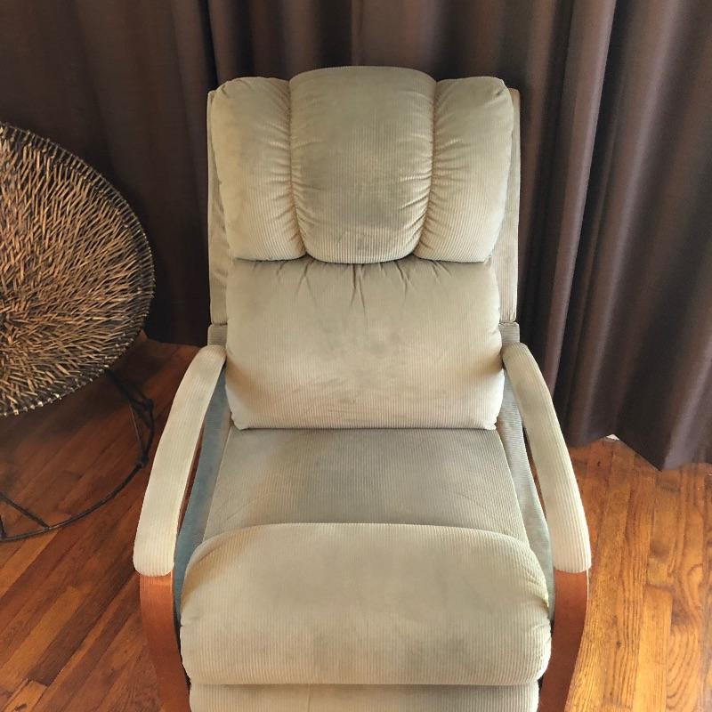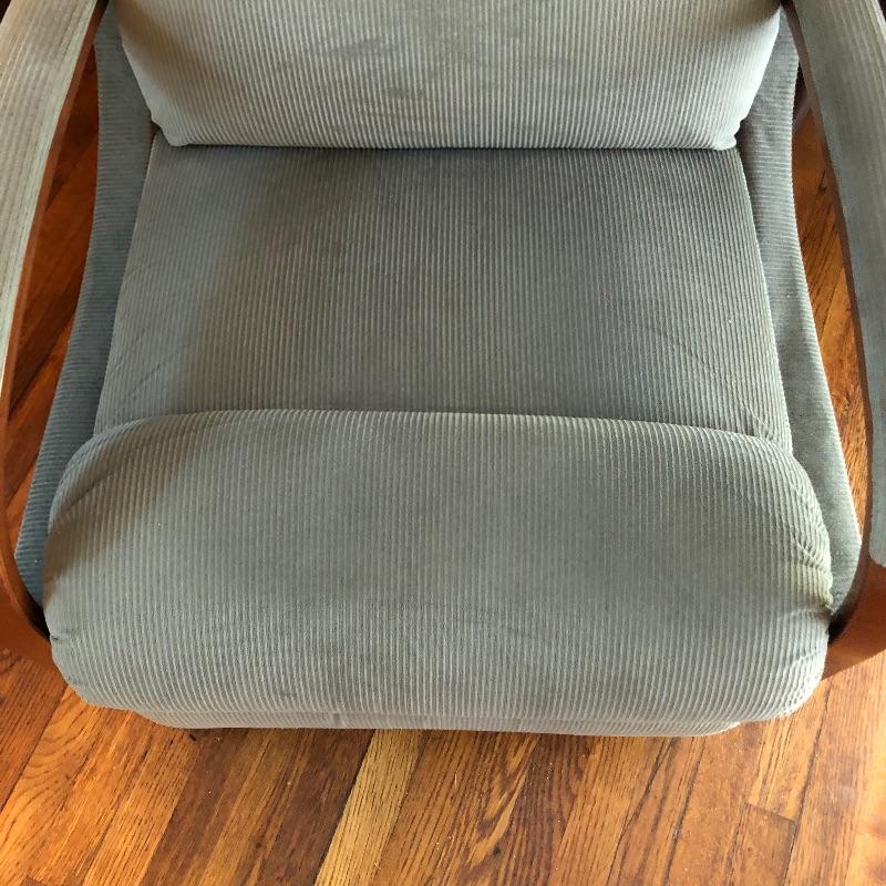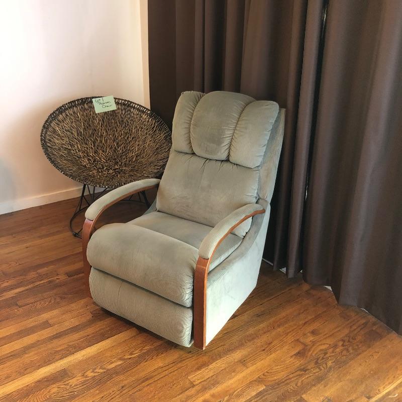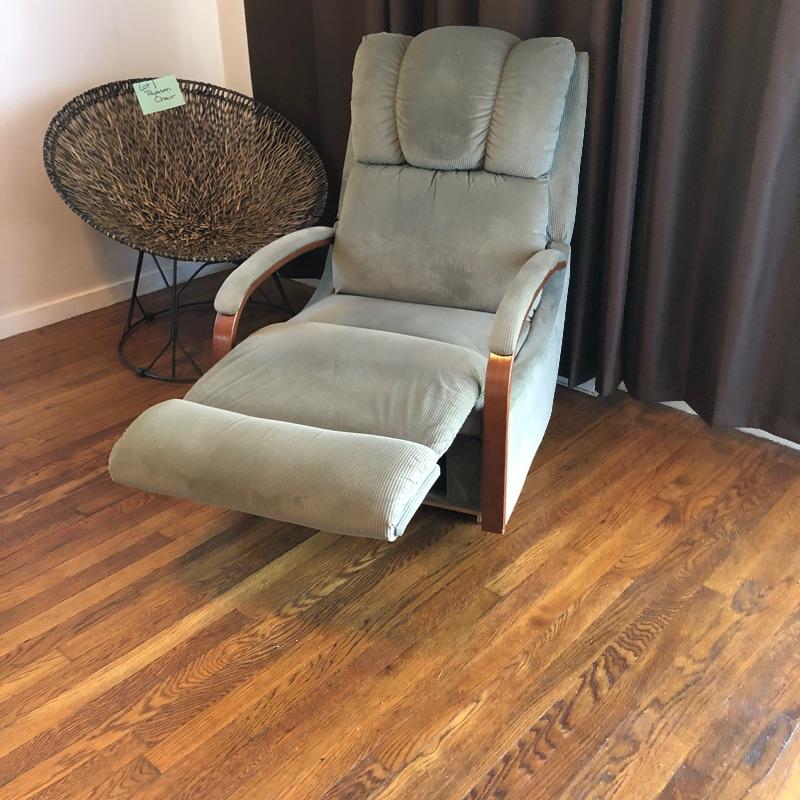 This mint green color corduroy fabric recliner and rocker is very comfortable and super clean and well cared for. Manual operation, this recliner measures 25” diameter x 28” wide x 38” tall. The round chair in background of photo is lot #1 in this auction and not included in this lot.