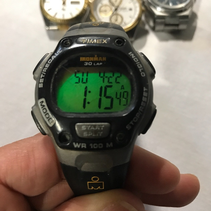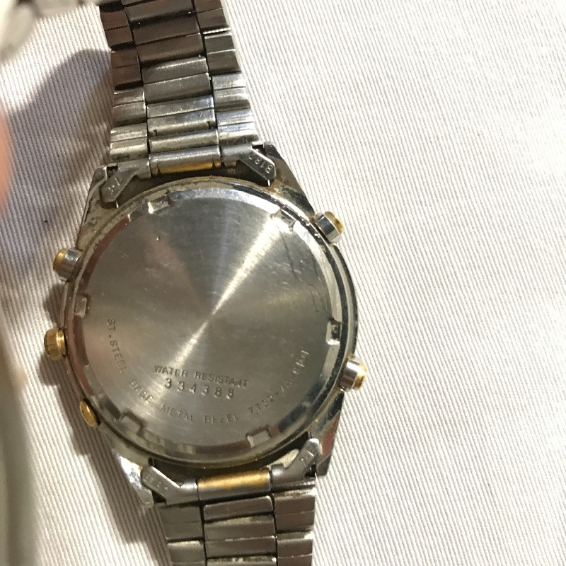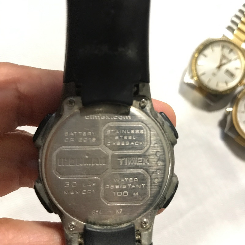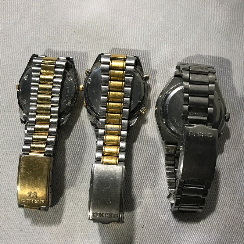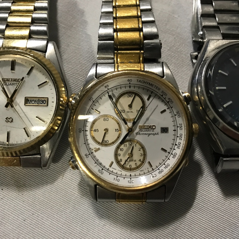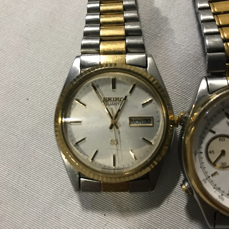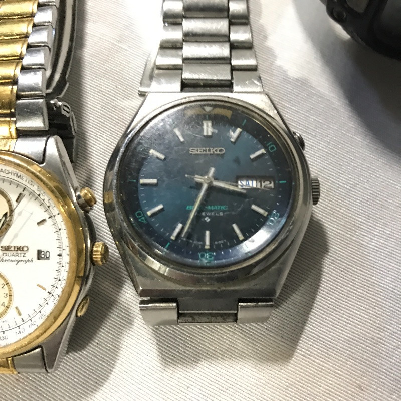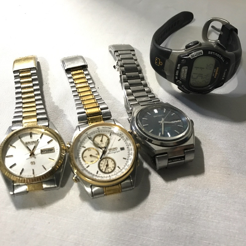 Four water resistant men’s watches include a Seiko Quartz Chronograph watch with Tachymeter, 17 Jewels Bell-Matic Seiko with blue face (has scratches on glass), a Seiko SQ two tone watch and a Timex Ironman Sport Watch. Some watches do not run, they most likely need batteries.