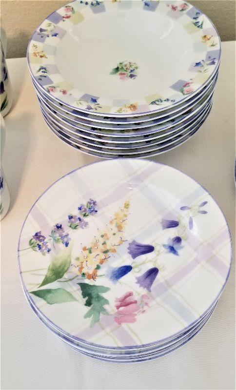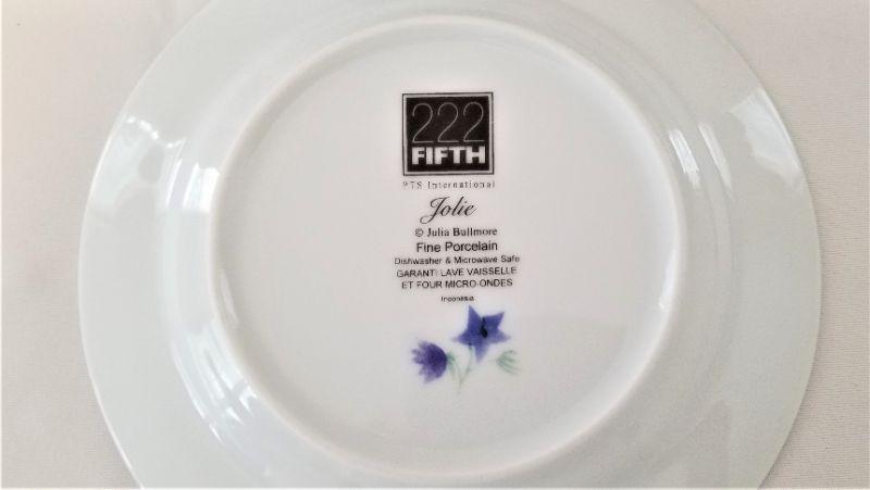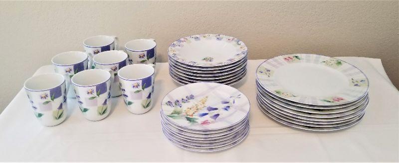 You get all you see here - 8 dinner plates (10.75" across), 8 salad plates, 8 mugs, 8 soup bowls. Good condition - a great set of everyday dishes that you can put in the dishwasher or microwave. Marked "Fine Porcelain" by 222 Fifth in the "Jolie" pattern.