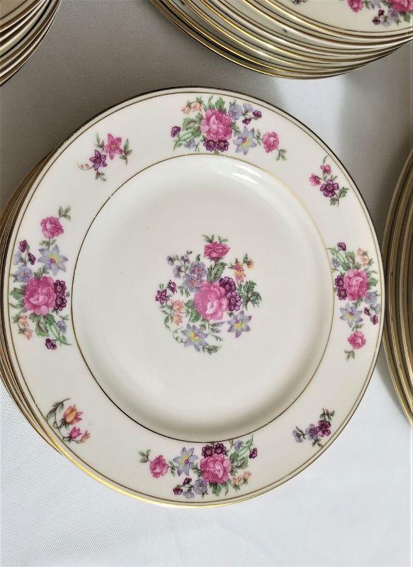 Nice vintage set here - Theodore Haviland china in the "Arlington" pattern. You get all you see here: 8 dinner plates (10.5" across), 6 bread/butter plates, 8 Soup bowls, Creamer/sugar, 7 Salad plates, 7 saucers, 8 demitasse cups, 8 tea cups. Good condition. Note: these are not dishwasher or microwave save. Gently used.