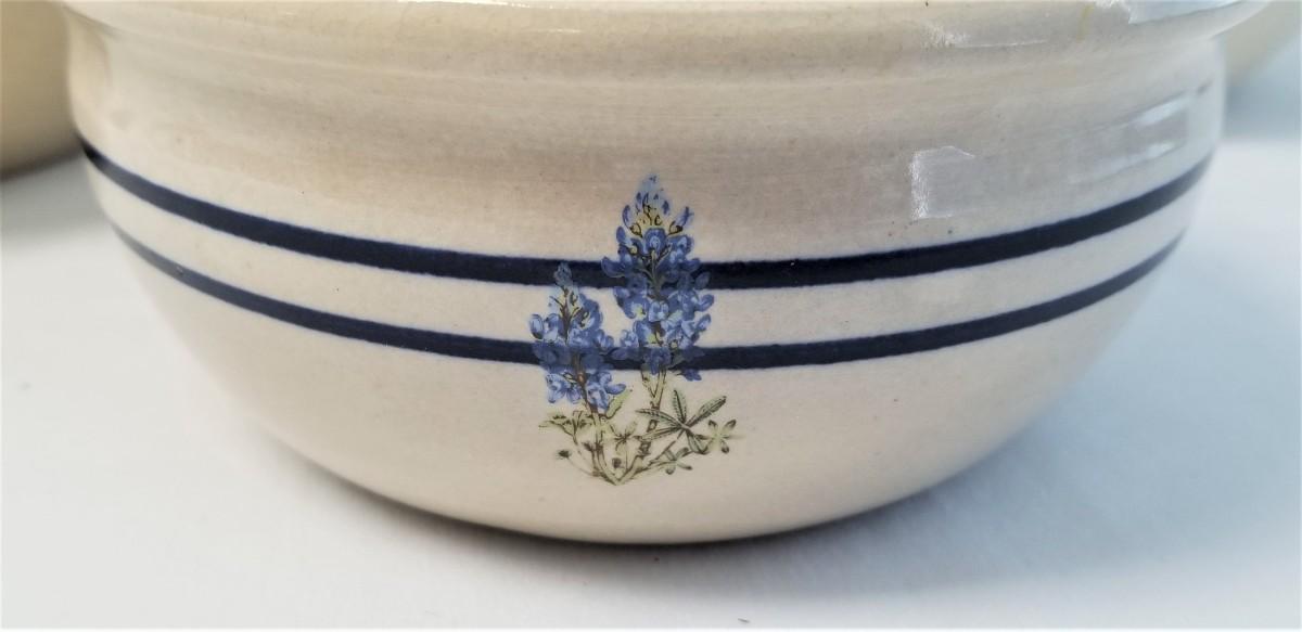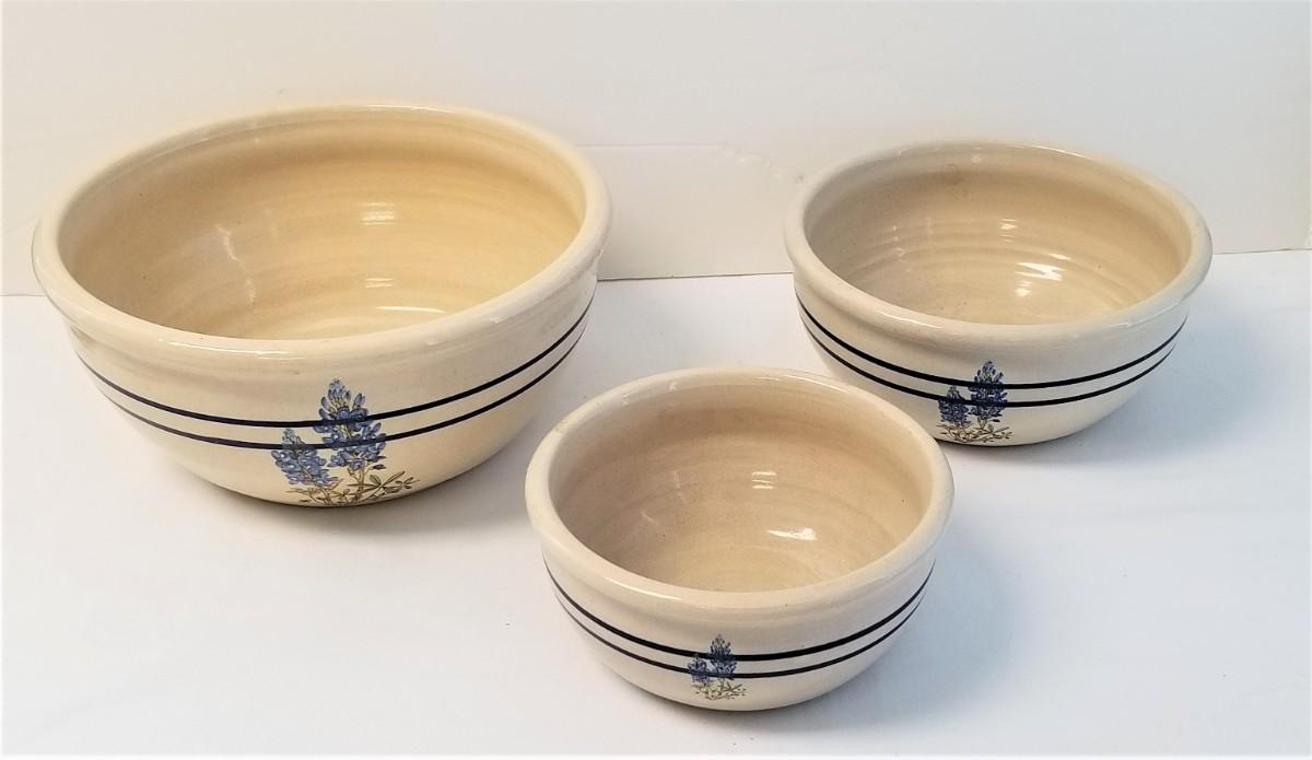 Set of three collectible Casey Pottery (Marshall, Texas) graduated mixing bowls with a Bluebonnet (Texas State Flower) motif. All in good condition. The largest is 10" across, 4.5" deep, next is 8" across, 3.25" deep, and the smallest is 6.5" across, and 3" deep.
