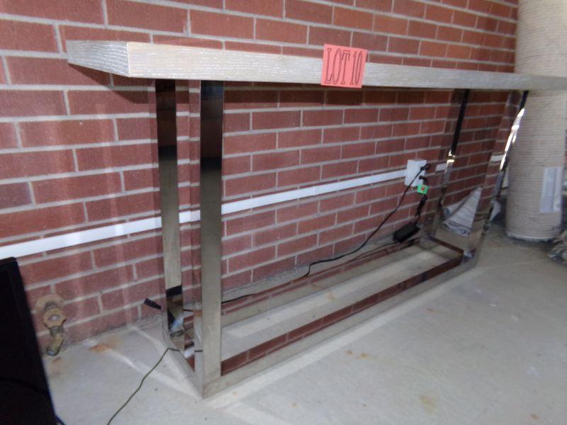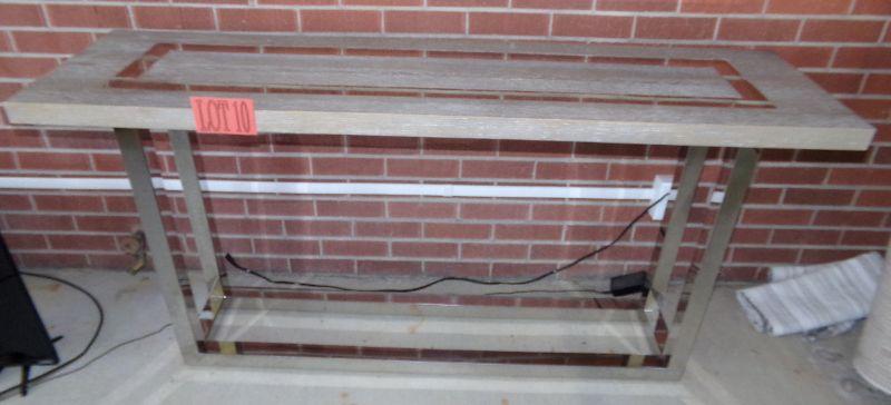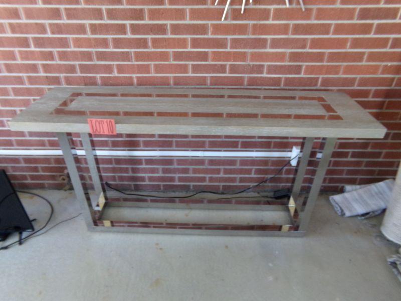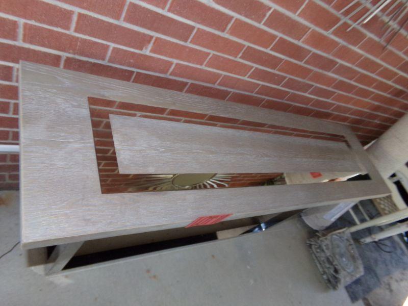 Faux wood top with mirror inlaid, metal frame. 2 corners are lightly bumped (see pics) Measures 60" wide 16" deep 30" tall