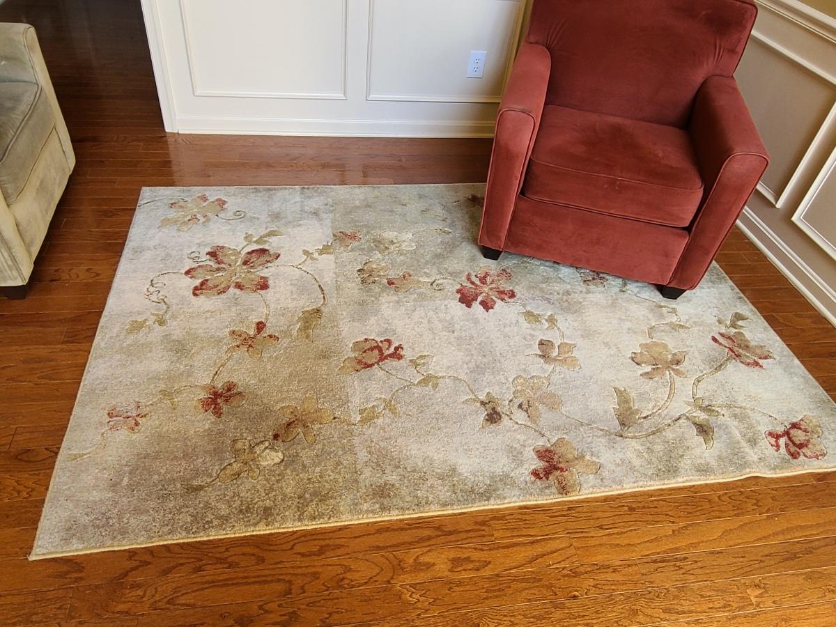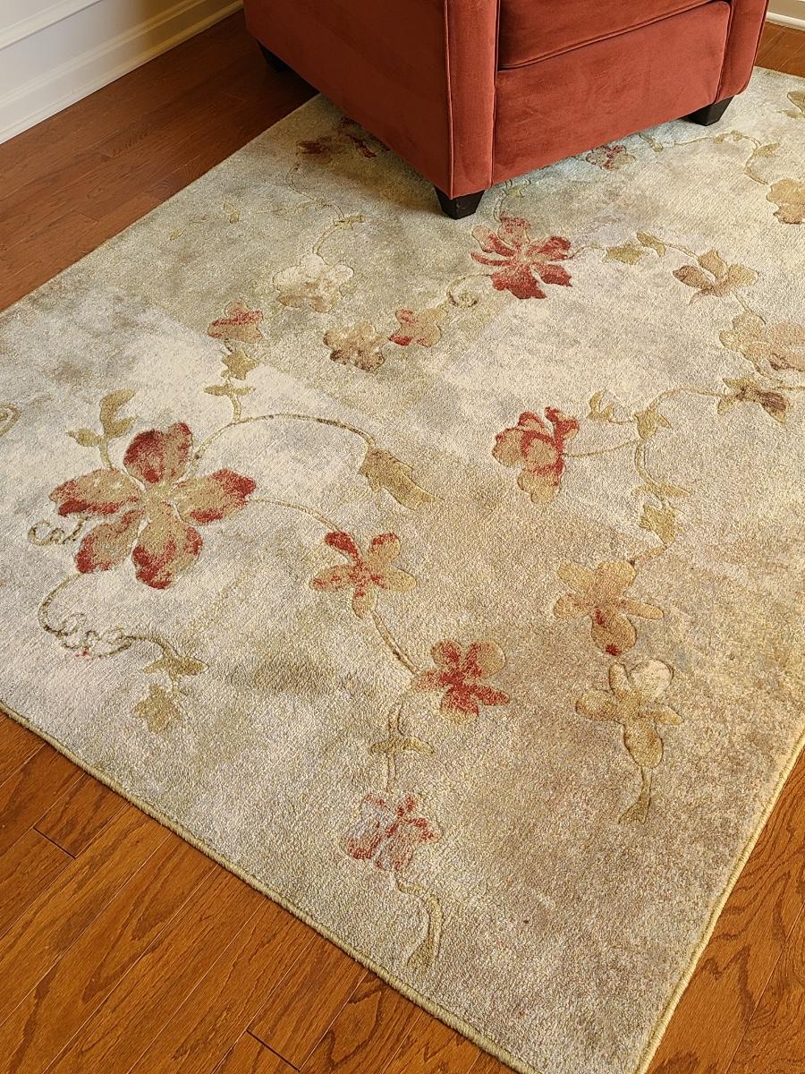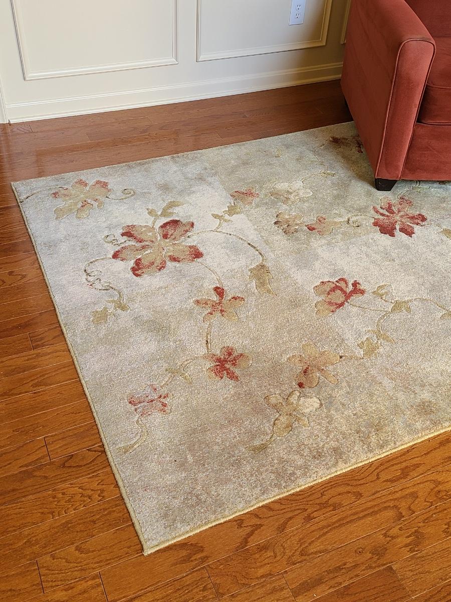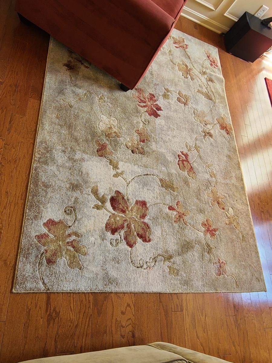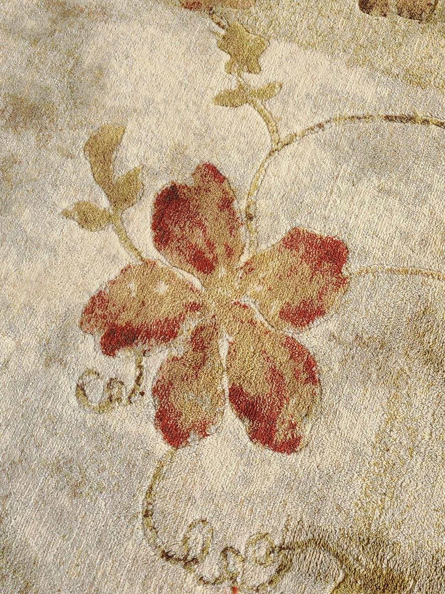 This still looks new, it shows as different colors in different lights. Soft rust red, sage, creams, and beiges hues with floral leaf accents. The pictures show condition, measurements if taken, and what is included in the lot. Due to the large amount that we photograph and the time frame, we are not always able to take measurements. All items unless noted, are pre-owned and have been used. If you purchased furniture, you must bring help. We do not allow one person to carry large furniture out on their own. Bring help, tools and a truck for the safety of our client’s homes, and your personal safety. Any damages that result to the property including walls, and floors due to moving of the furniture will be charged to the buyer. Company policy. Thank you.