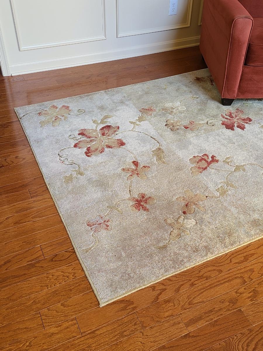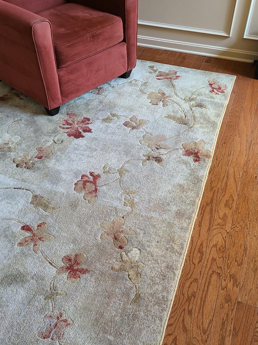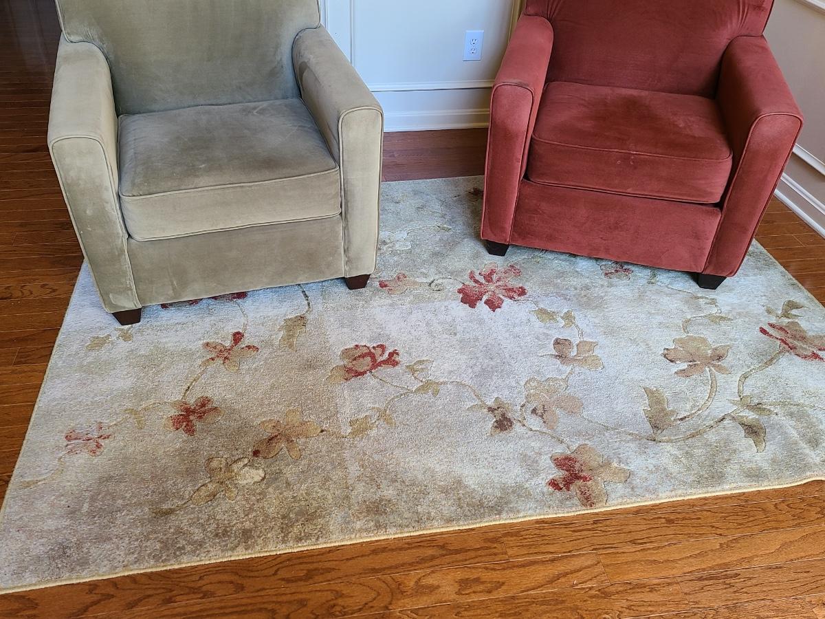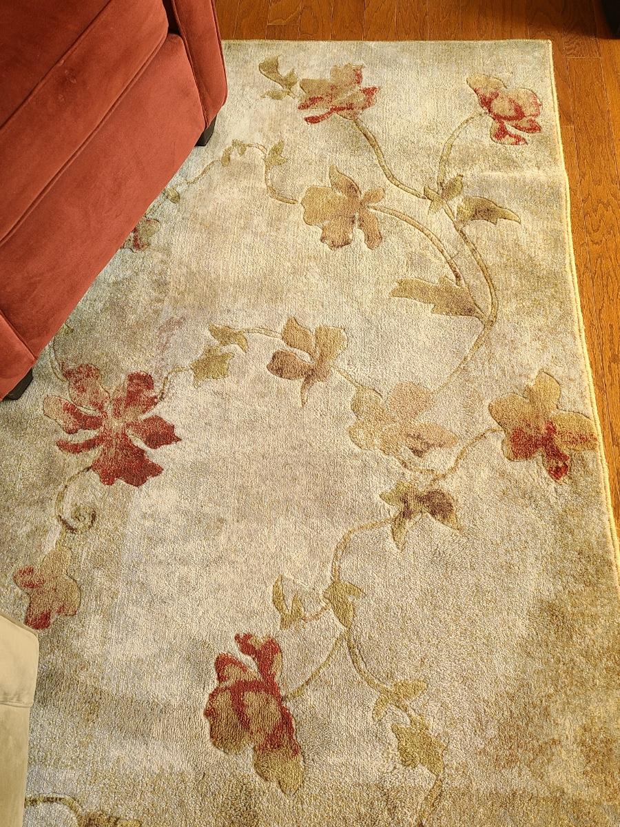 This still looks new, it shows as different colors in different lights. Soft rust red, sage, creams, and beiges hues with floral leaf accents. The pictures show condition, measurements if taken, and what is included in the lot. Due to the large amount that we photograph and the time frame, we are not always able to take measurements. All items unless noted, are pre-owned and have been used. If you purchased furniture, you must bring help. We do not allow one person to carry large furniture out on their own. Bring help, tools and a truck for the safety of our client’s homes, and your personal safety. Any damages that result to the property including walls, and floors due to moving of the furniture will be charged to the buyer. Company policy. Thank you.