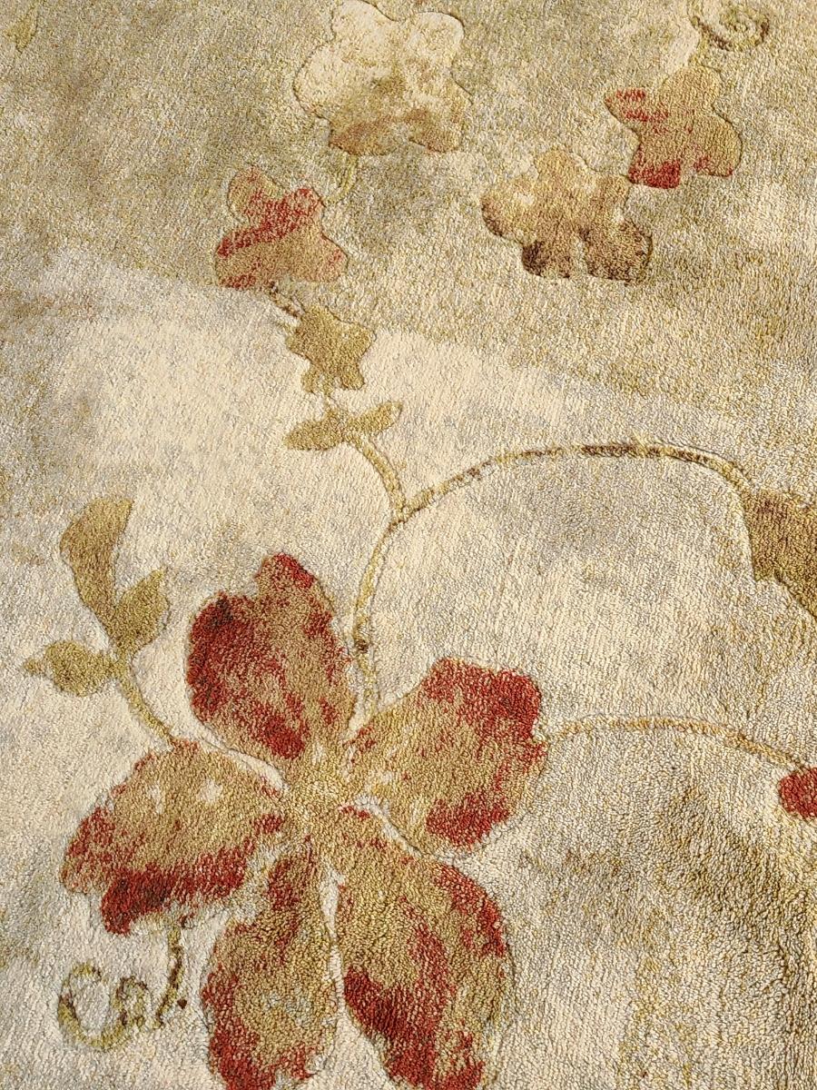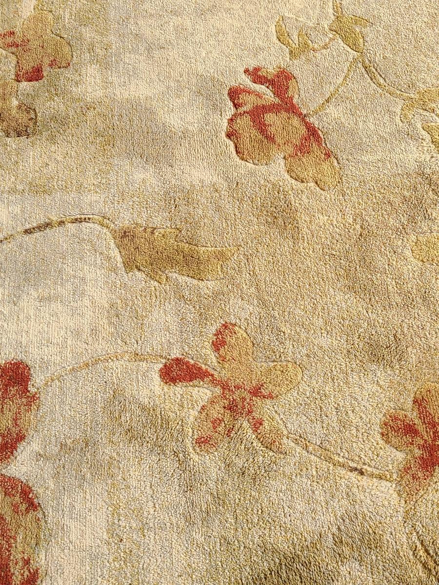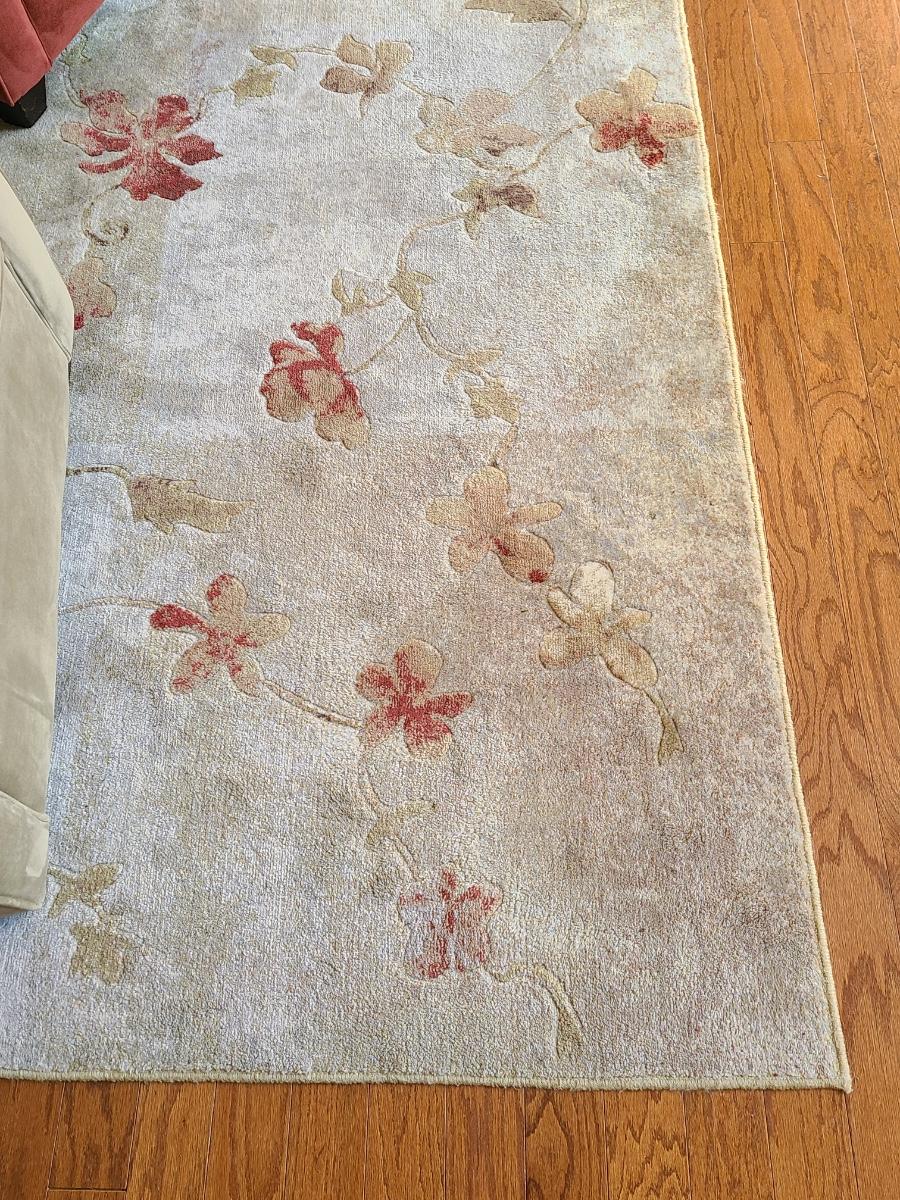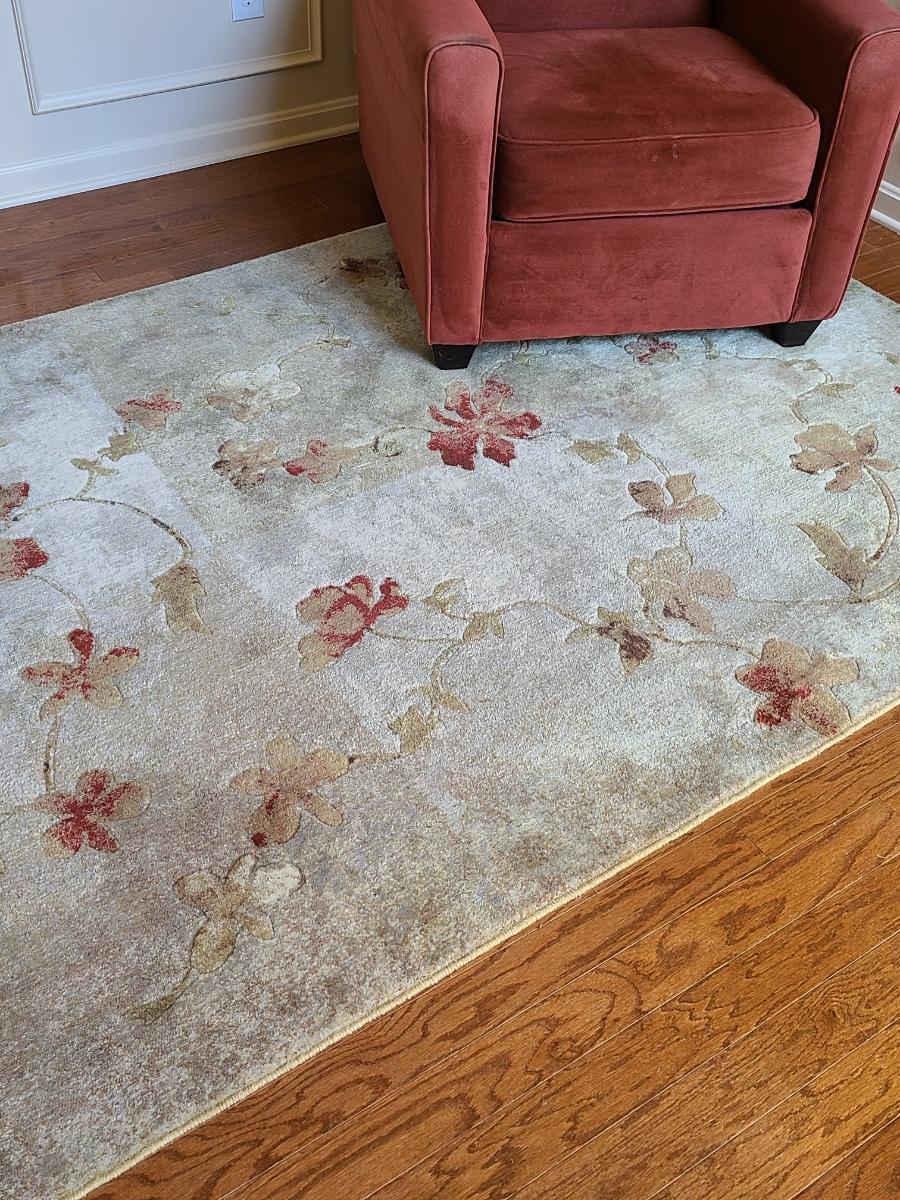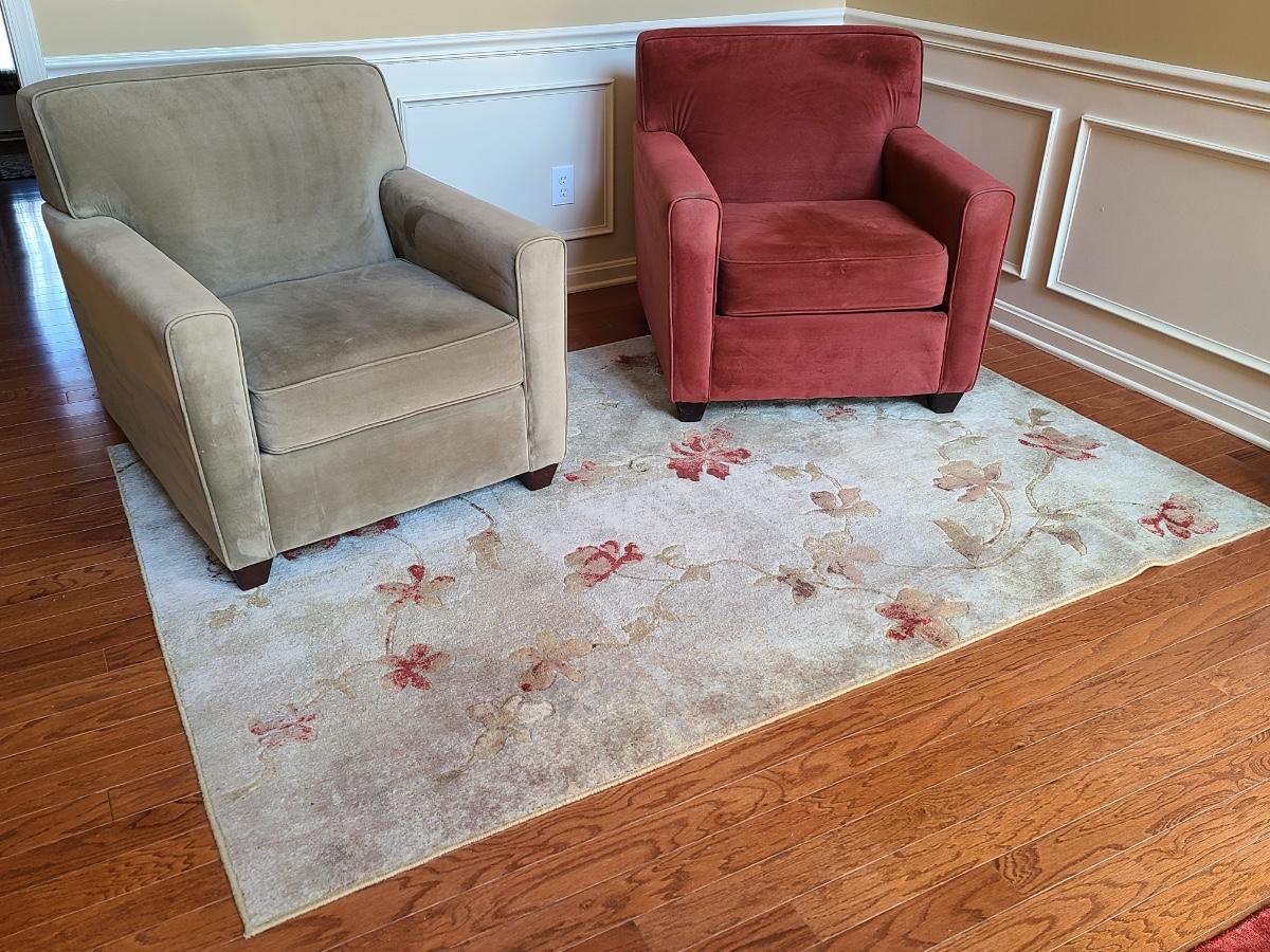 This still looks new, it shows as different colors in different lights. Soft rust red, sage, creams, and beiges hues with floral leaf accents. The pictures show condition, measurements if taken, and what is included in the lot. Due to the large amount that we photograph and the time frame, we are not always able to take measurements. All items unless noted, are pre-owned and have been used. If you purchased furniture, you must bring help. We do not allow one person to carry large furniture out on their own. Bring help, tools and a truck for the safety of our client’s homes, and your personal safety. Any damages that result to the property including walls, and floors due to moving of the furniture will be charged to the buyer. Company policy. Thank you.