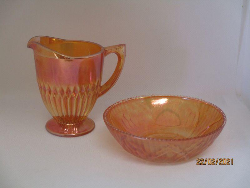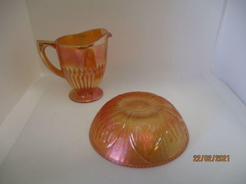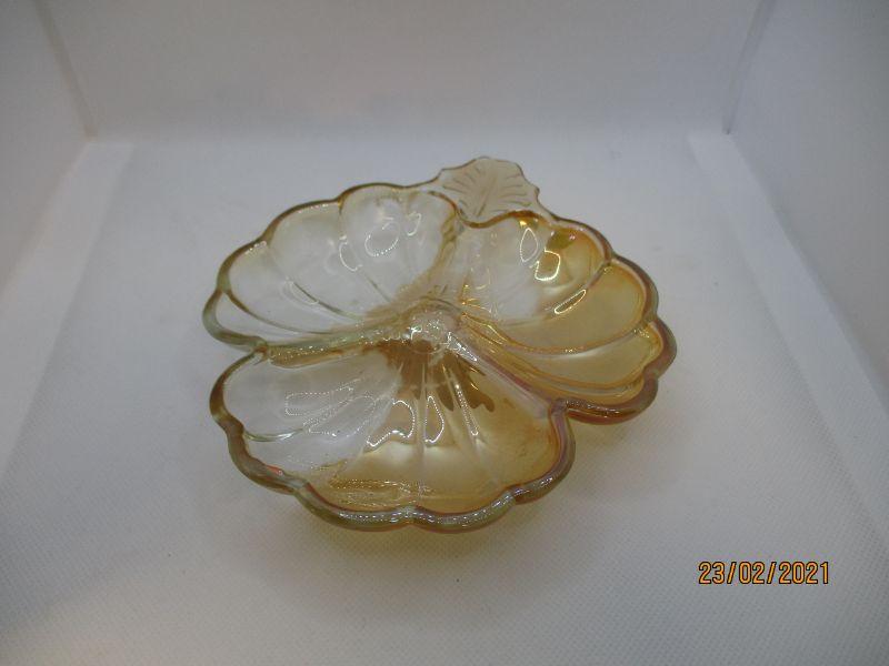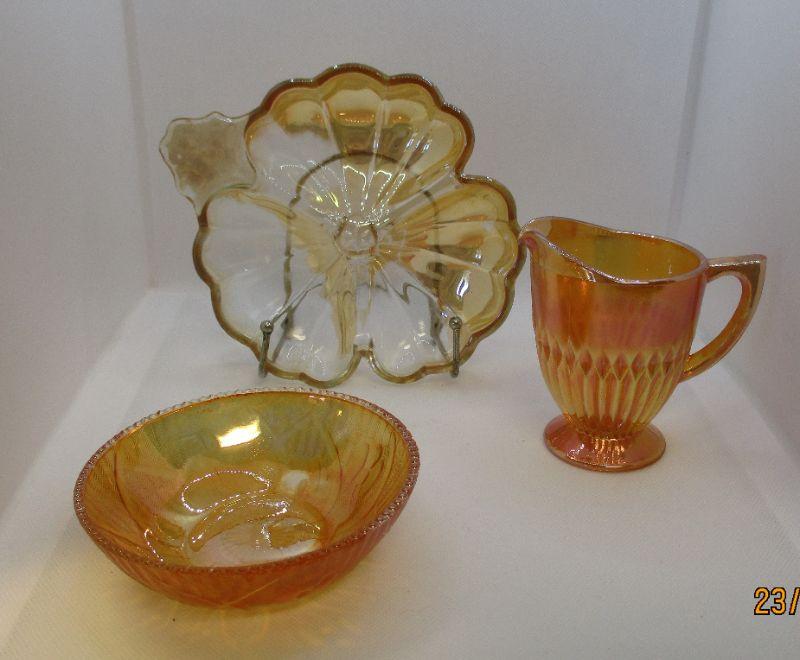 The creamer is 3.75" tall and I don't know the pattern. While there isn't any damage, the marigold/iridescent color isn't sprayed on evenly around the middle. The dessert bowl is 4.5" in diameter and is the Iris pattern by Jeannette. The three part dish is Doric by Jeannette and it has significant color loss, but is free from chips and cracks.