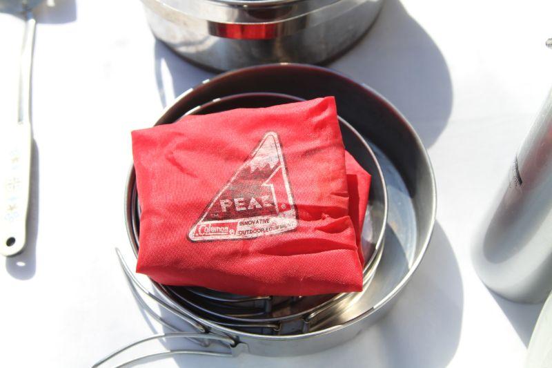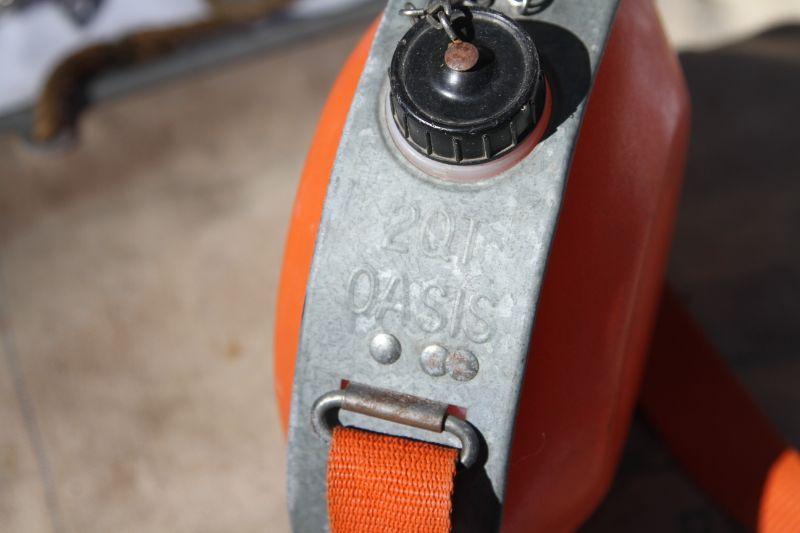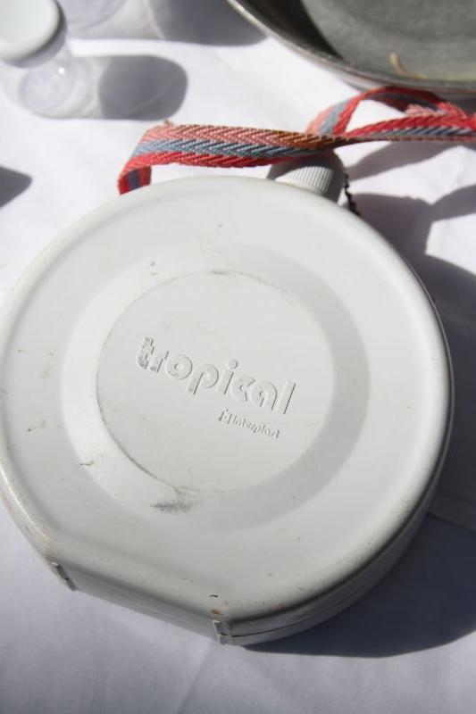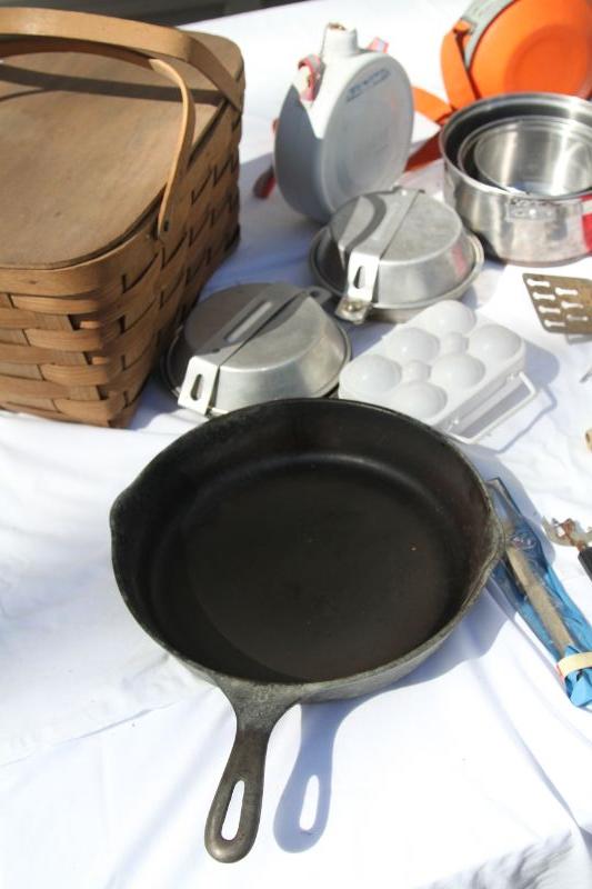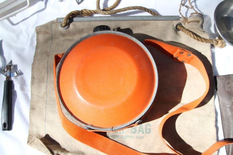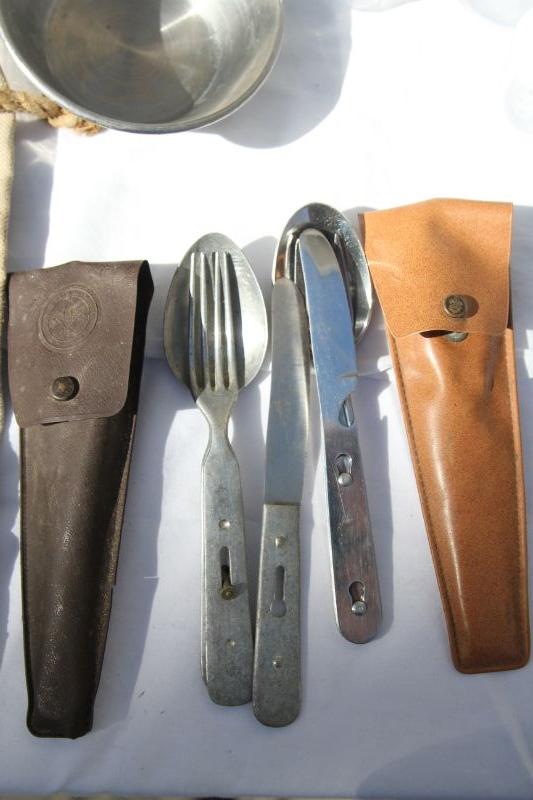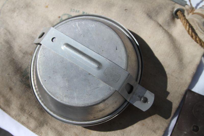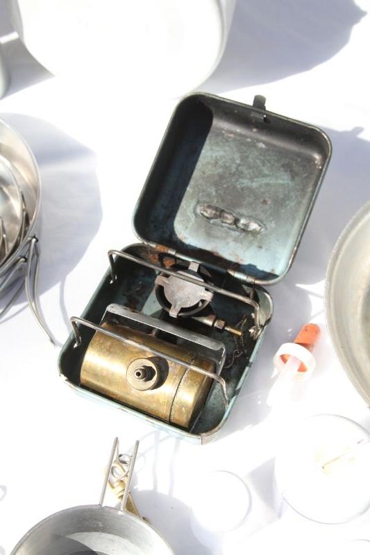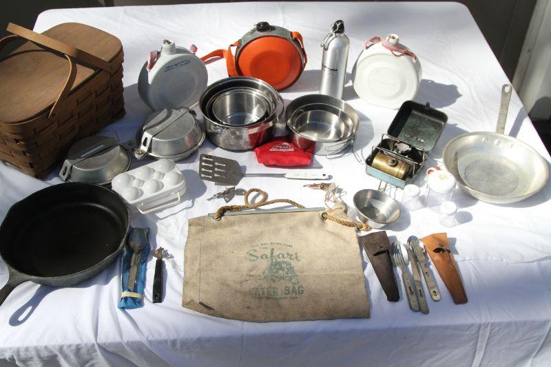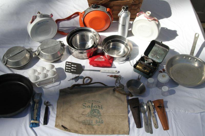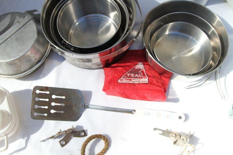 2 aluminum mess kits (one girlscout); a cast iron skillet; spatula; 3 sets of of metal utensils in cases(2 boyscout); a Coleman Peak cookware set; 2 Tropical Interplast Canteens; an orange Oasis canteen with strap; a water bottle; stainless frying pan; 3 spice containers; 3 manual can openers; an Optimus backpacking stove in metal case (untested); "The Safari" cloth water bag; a woven wood slat picknic basket.