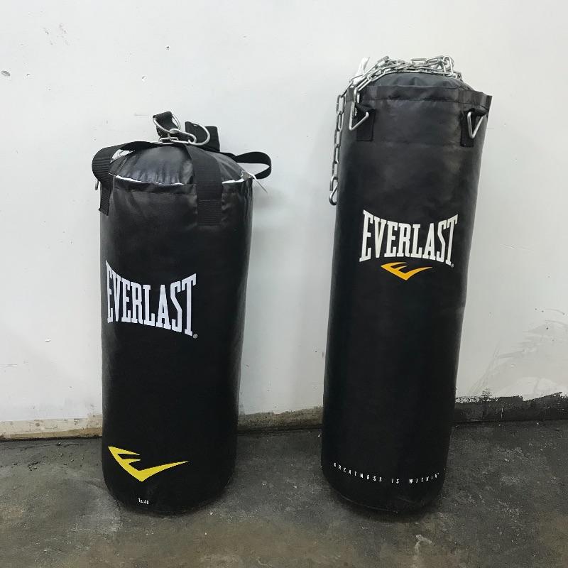 Two great training bags by Everlast. One, Ta:40 measures approximately 12”d x 29”. The taller bag is heavier, but actual weight on each bag was not located. Taller bag is marked Ta:25 and measures approximately 10” x 36”. Both training bags need a little cleaning, but are in great shape and ready to be hung. See photos. No shipping.