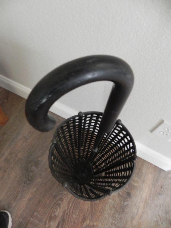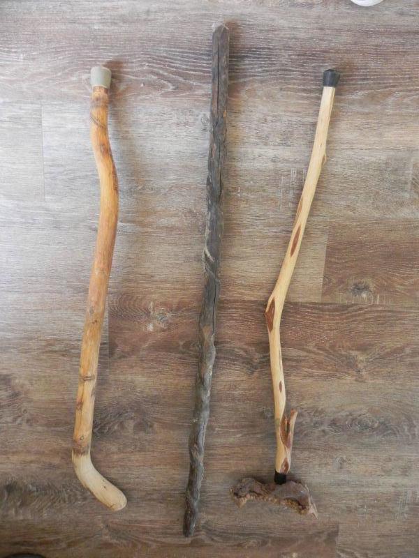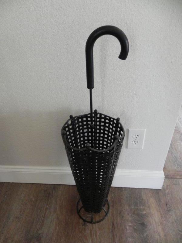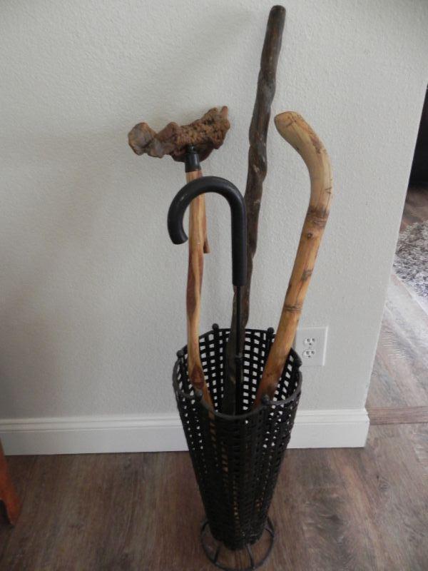 BLACK IRON UMBRELLA/CANE HOLDER, MEASURES 9X21", 3 WOOD WALKING STICKS WITH CARVED HANDLE