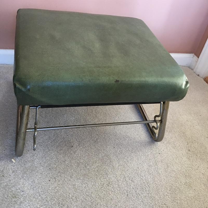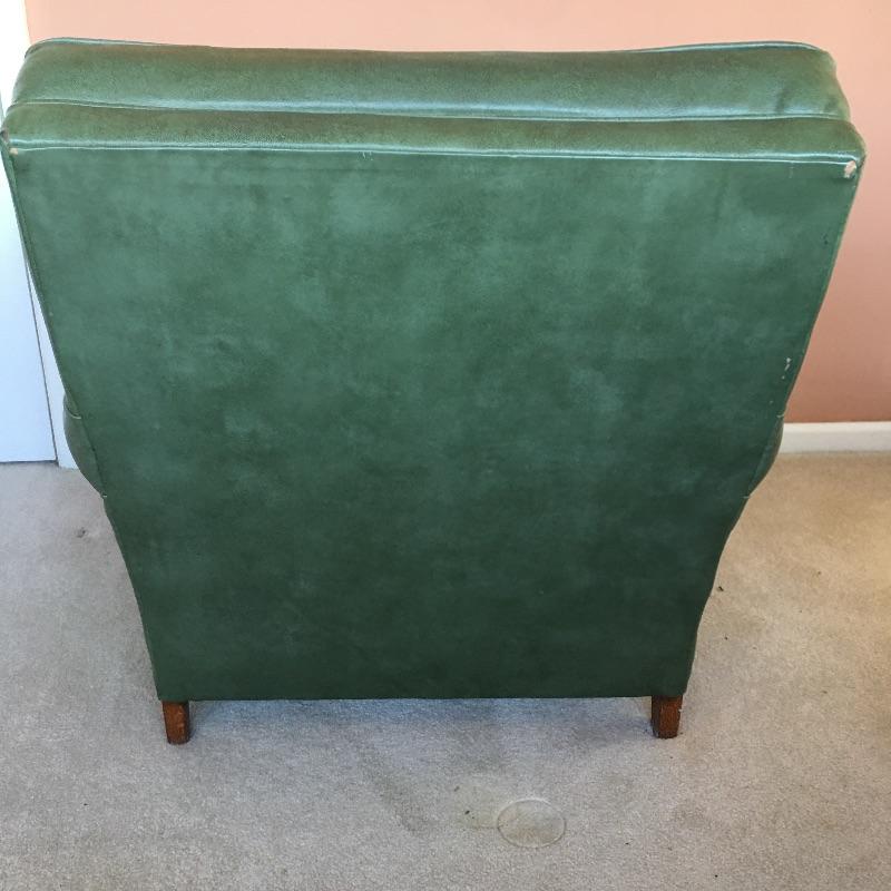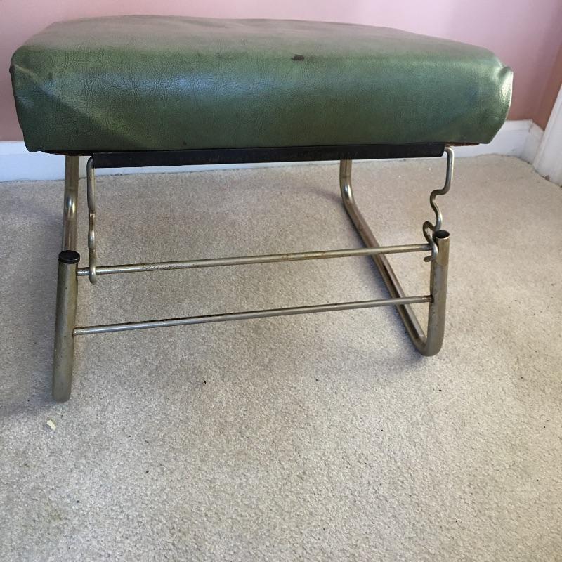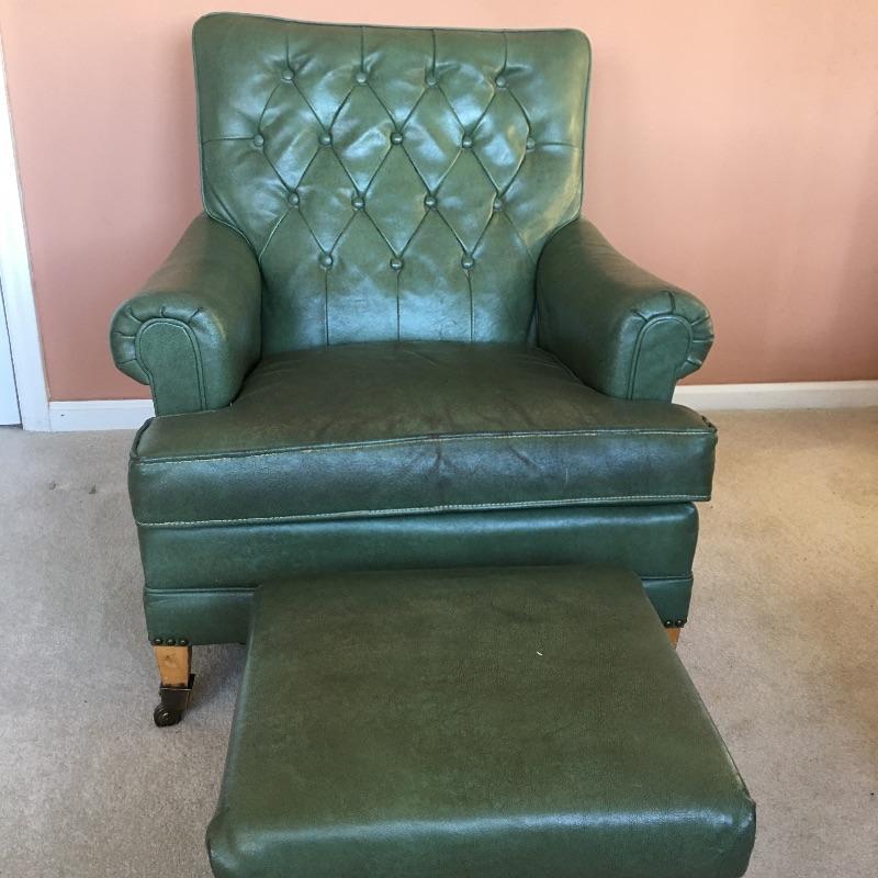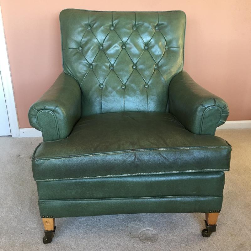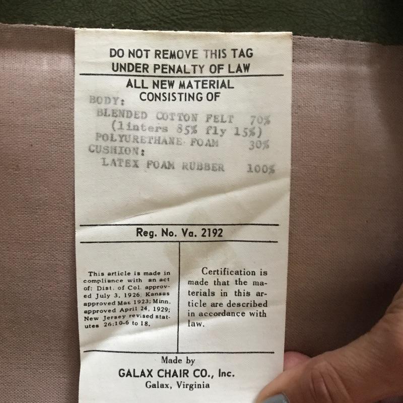 Vintage green chair made by Galax Chair Co out of Virginia. Chair has front casters and includes a matching adjustable stool. Chair has some stitching coming undone on seat cushion but should be able to be restitched without need to reupholster, see pictures. See photo of tag for material info. Chair measures 28” x 37” x 32” with a 16” seat height.