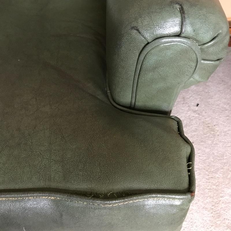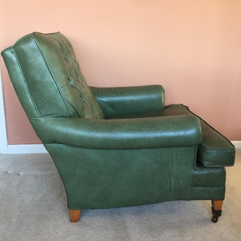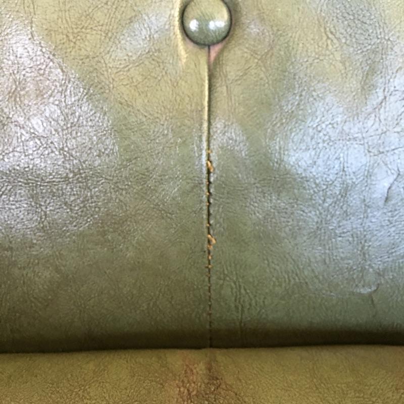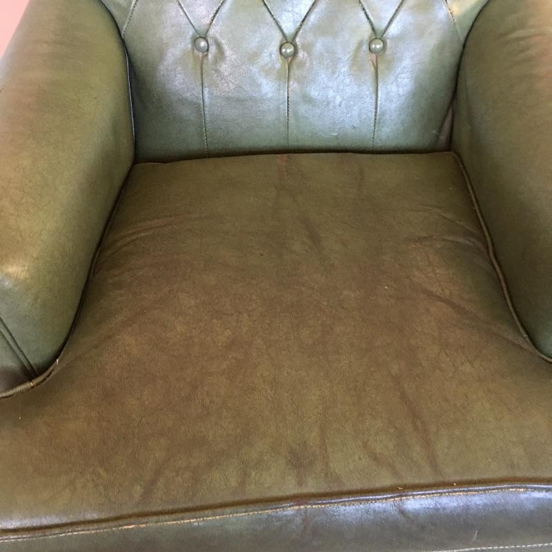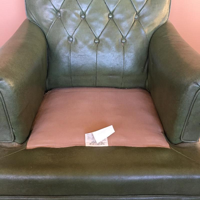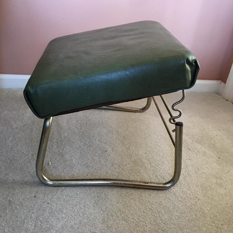 Vintage green chair made by Galax Chair Co out of Virginia. Chair has front casters and includes a matching adjustable stool. Chair has some stitching coming undone on seat cushion but should be able to be restitched without need to reupholster, see pictures. See photo of tag for material info. Chair measures 28” x 37” x 32” with a 16” seat height.