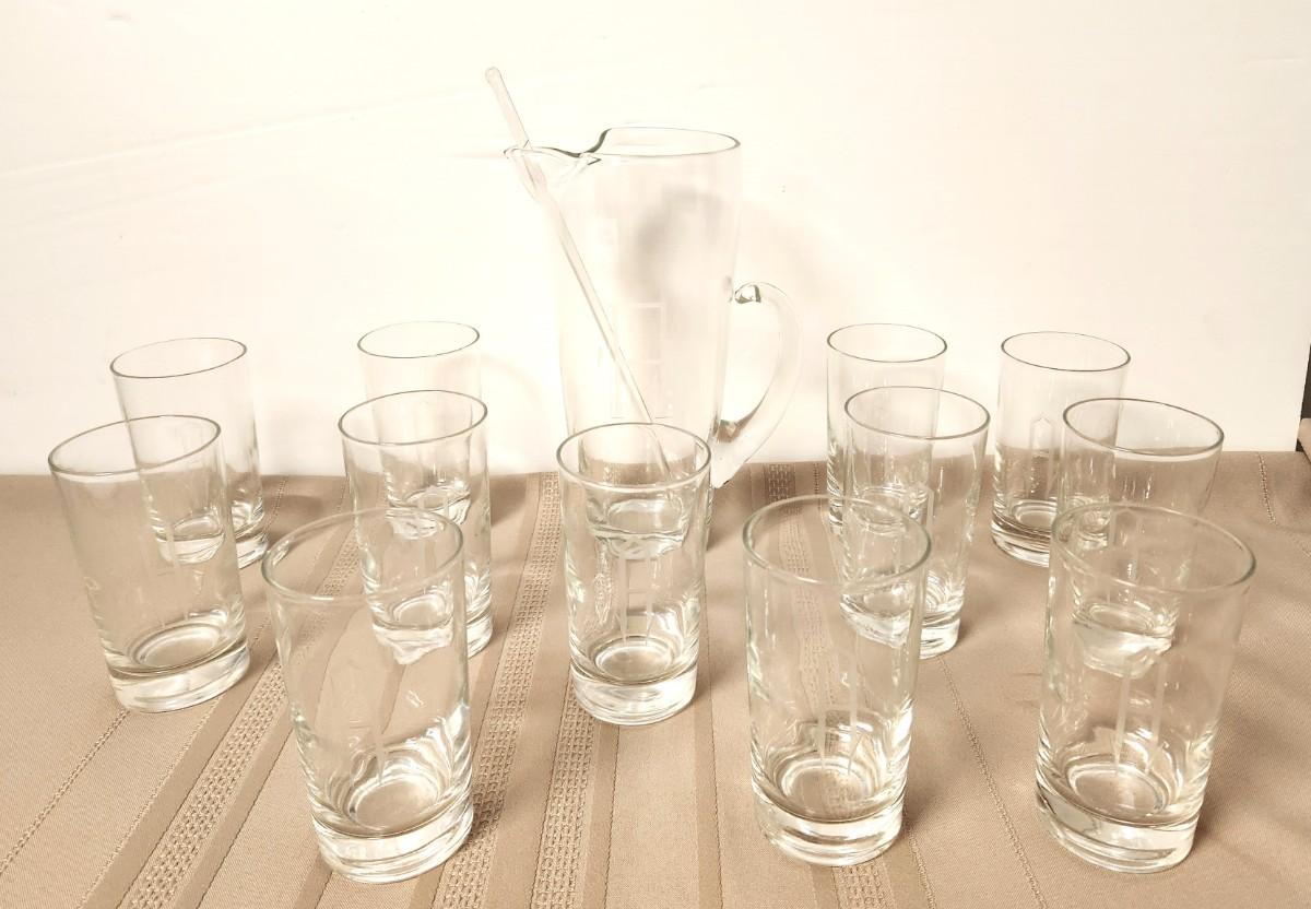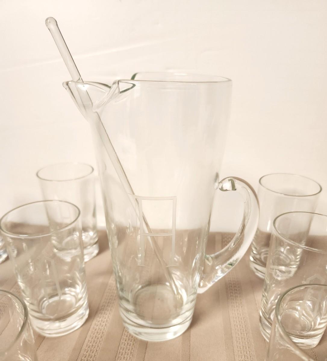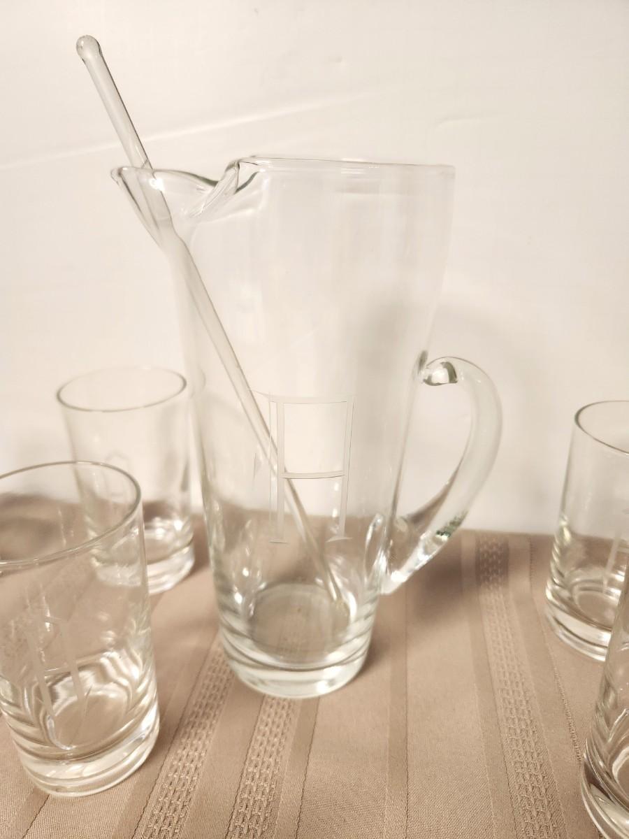 Set of 12 glasses with Cocktail pitcher/stirrer - all etched with initial "A". Pitcher is 8.5" tall, glasses are 4.5" tall. All in good condition.