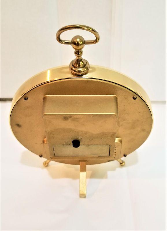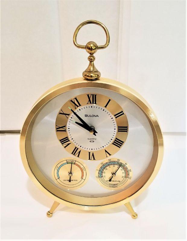 Attractive mid-century piece - Bulova clock with glow in dark (tips) hands (quartz movement), and also a thermometer/hygrometer. Marked "Japan." Has spot in back for AA battery to run the clock. Batteries not present, but compartment not corroded, etc. A good-looking desk accessory. Measures 5.5" across, 8.25" tall.