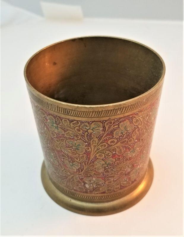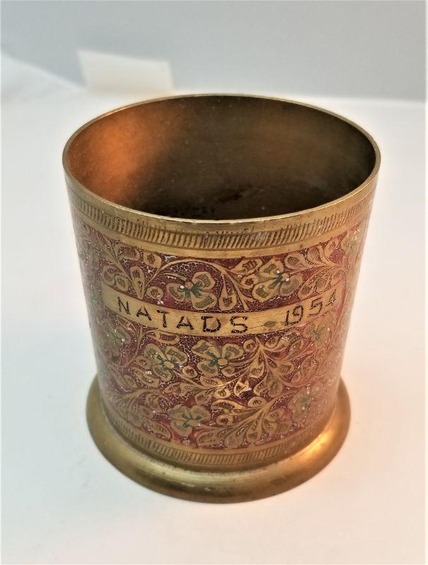 A handsome vintage desk accessory - Krewe favor, makred NAIADS 1954 - brass pencil/pen holder, nicely decorated. 3.25" tall, 3" across. Vintage condition. Naids was a rather short-lived krewe that was active from 1949 until 1956.