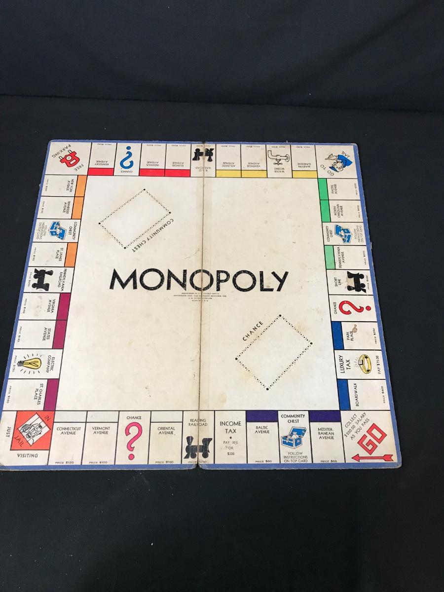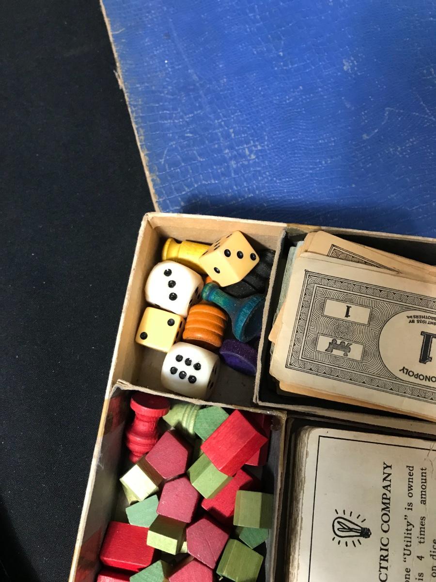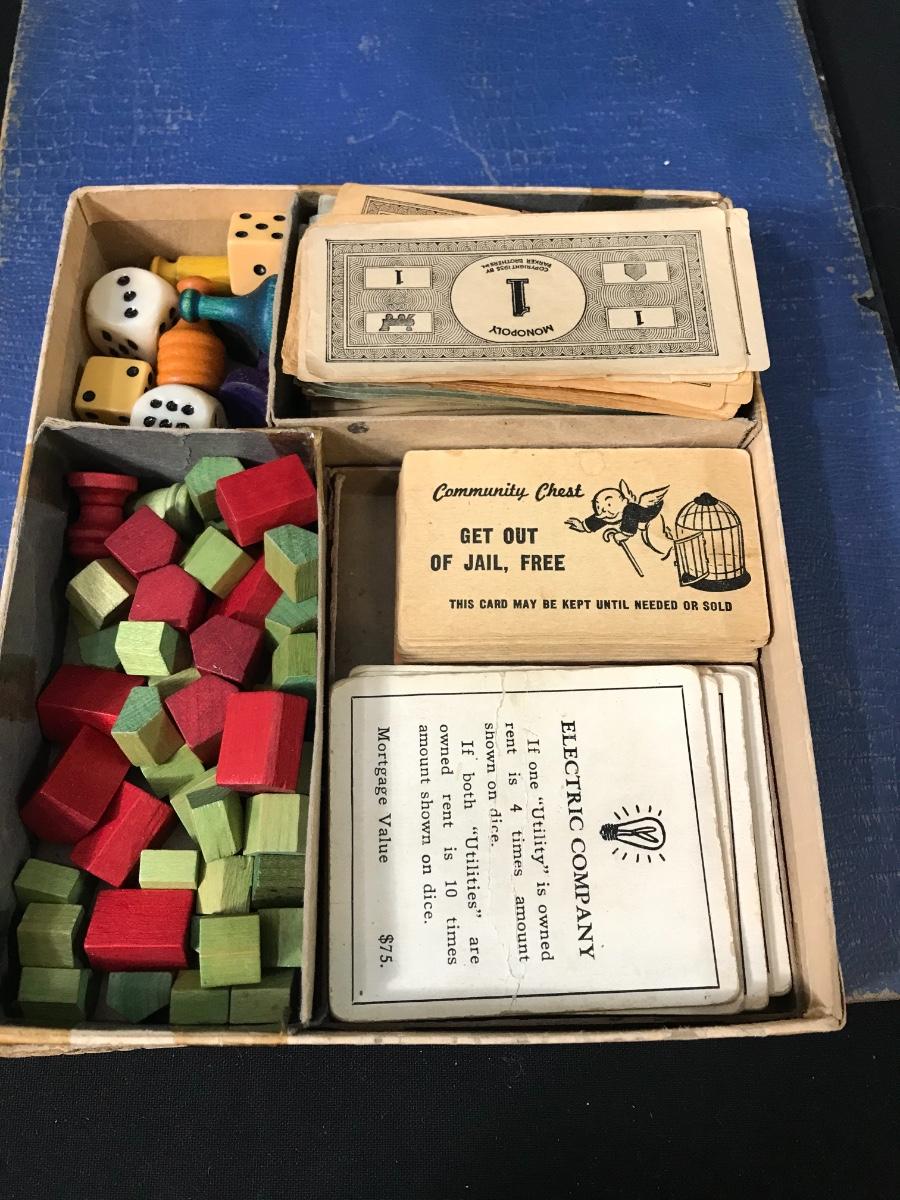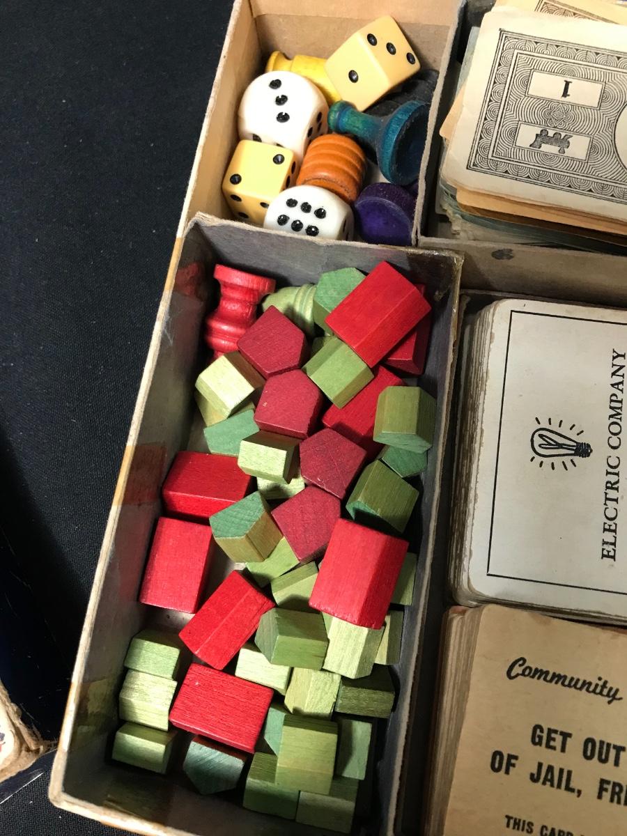 Vintage Monopoly Board Game with Wooden Game Pieces, Houses and Hotels. Believed to be from the 1940s. Uncertain if all pieces are present, but at least a majority of the game's contents are here and in decent condition. Please see all pictures as they are the best representation of the items. The pictures show condition, measurements if taken, and what is included in the lot. Due to the large amount that we photograph and the time frame, we are not always able to take measurements. All items unless noted, are pre-owned and have been used. Please bring packing materials for your items. If you purchased furniture, you must bring help. We do not allow one person to carry large furniture out on their own. Bring help, tools and a truck for your personal safety. Company policy. Thank you.