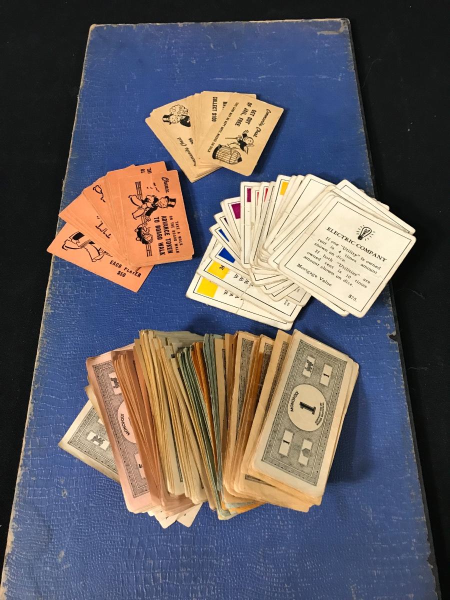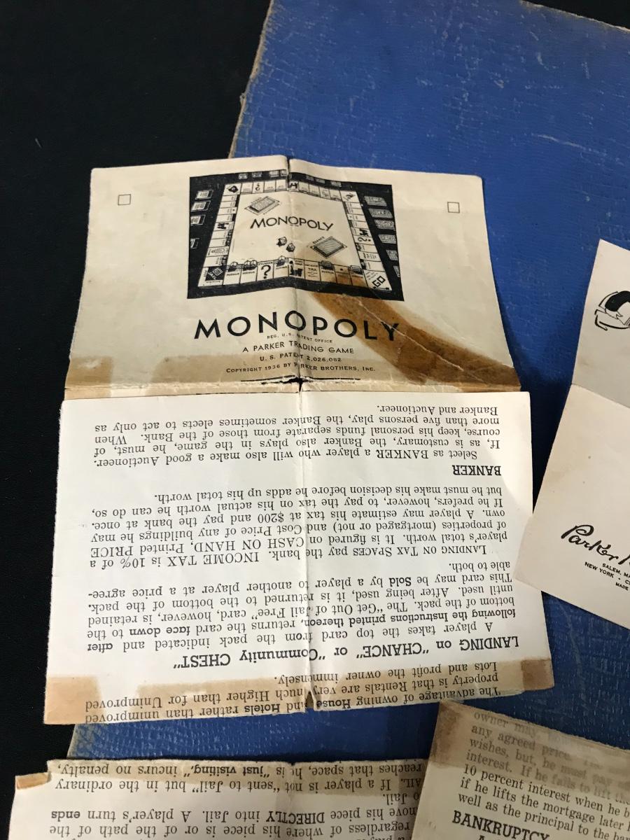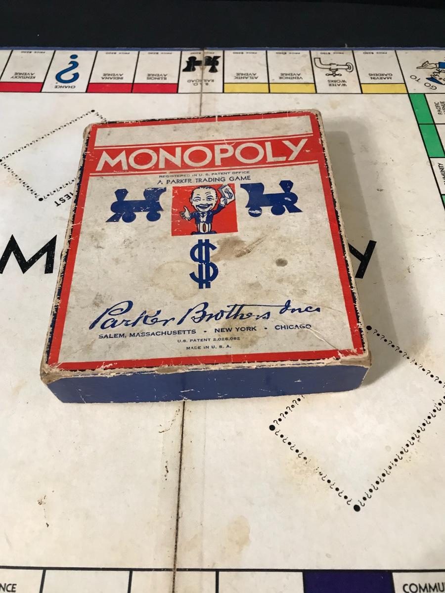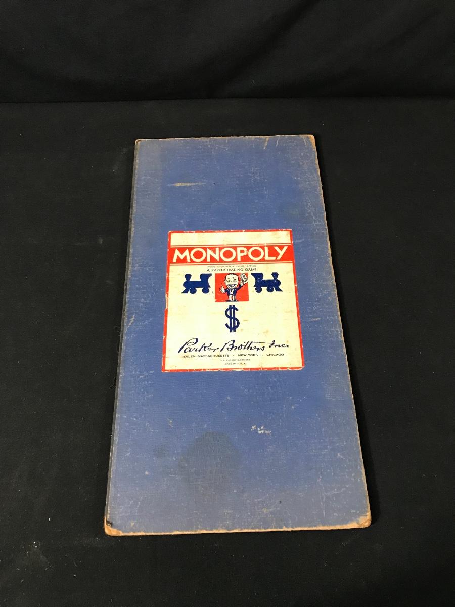 Vintage Monopoly Board Game with Wooden Game Pieces, Houses and Hotels. Believed to be from the 1940s. Uncertain if all pieces are present, but at least a majority of the game's contents are here and in decent condition. Please see all pictures as they are the best representation of the items. The pictures show condition, measurements if taken, and what is included in the lot. Due to the large amount that we photograph and the time frame, we are not always able to take measurements. All items unless noted, are pre-owned and have been used. Please bring packing materials for your items. If you purchased furniture, you must bring help. We do not allow one person to carry large furniture out on their own. Bring help, tools and a truck for your personal safety. Company policy. Thank you.