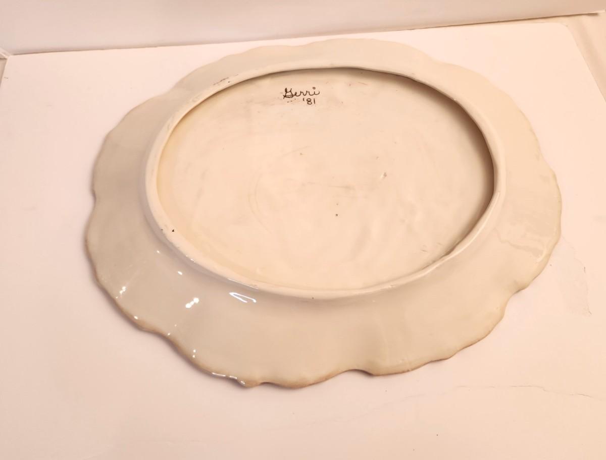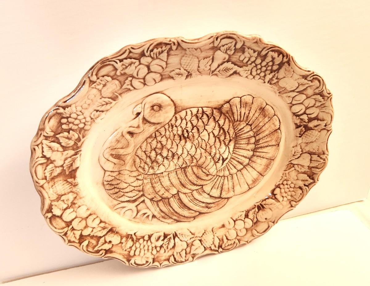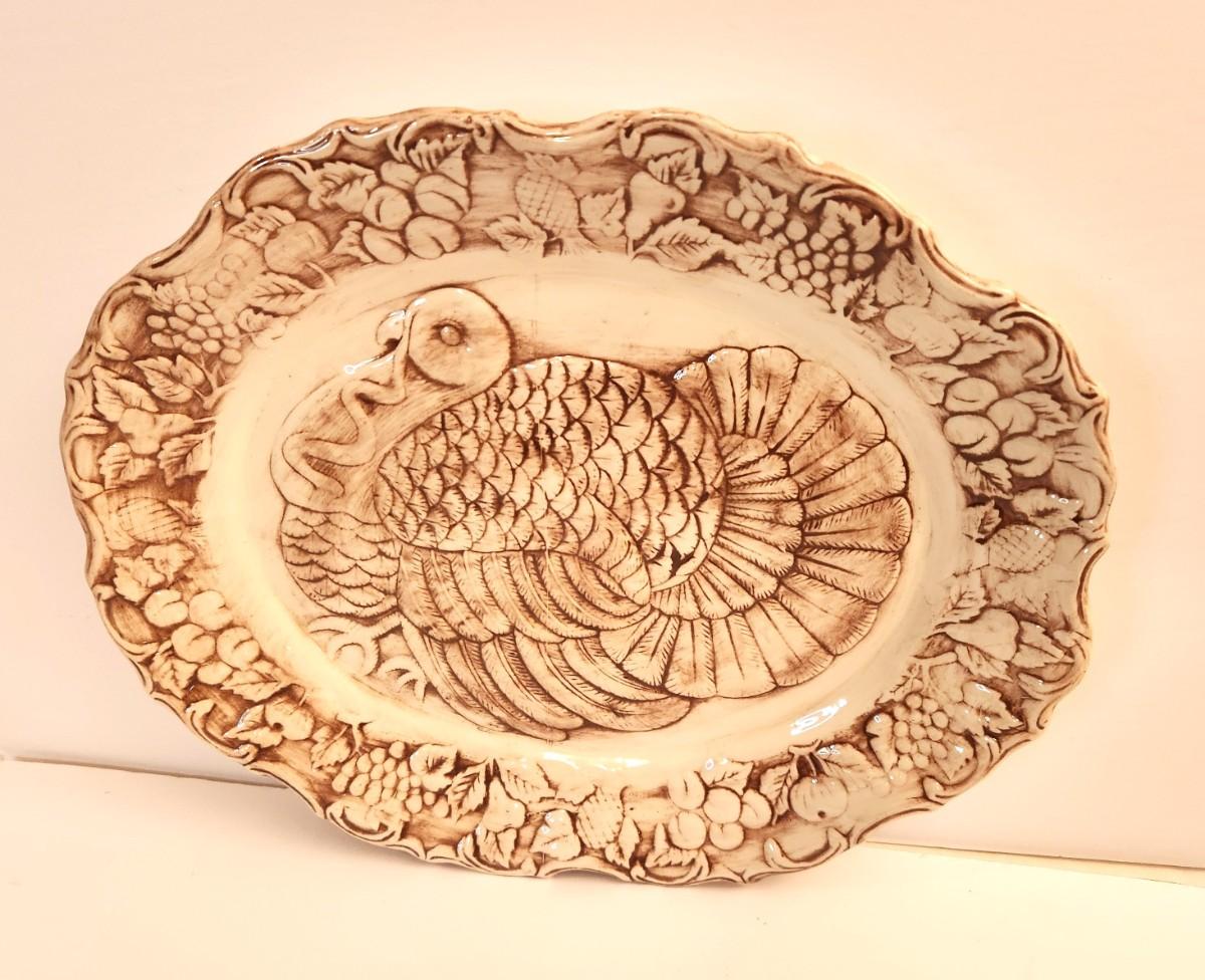 Hobbyist ceramic Turkey Platter, signed Geri "81. Good condition. 18" across, 15" tall.