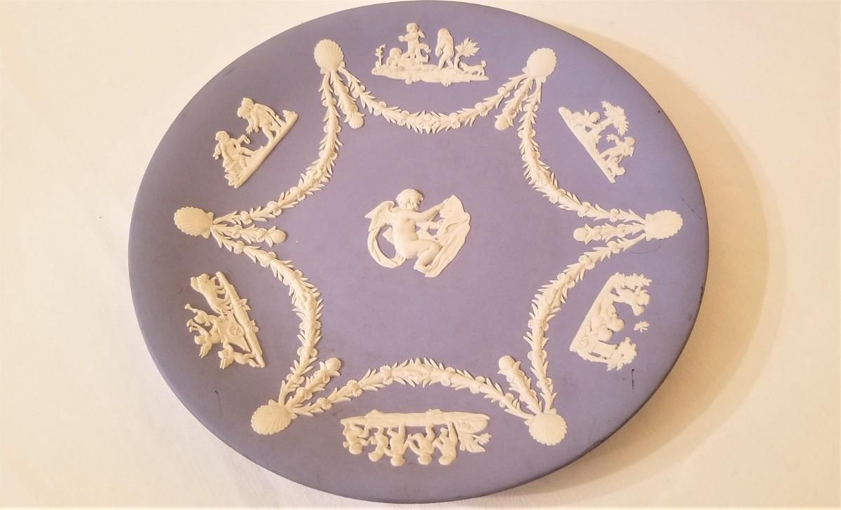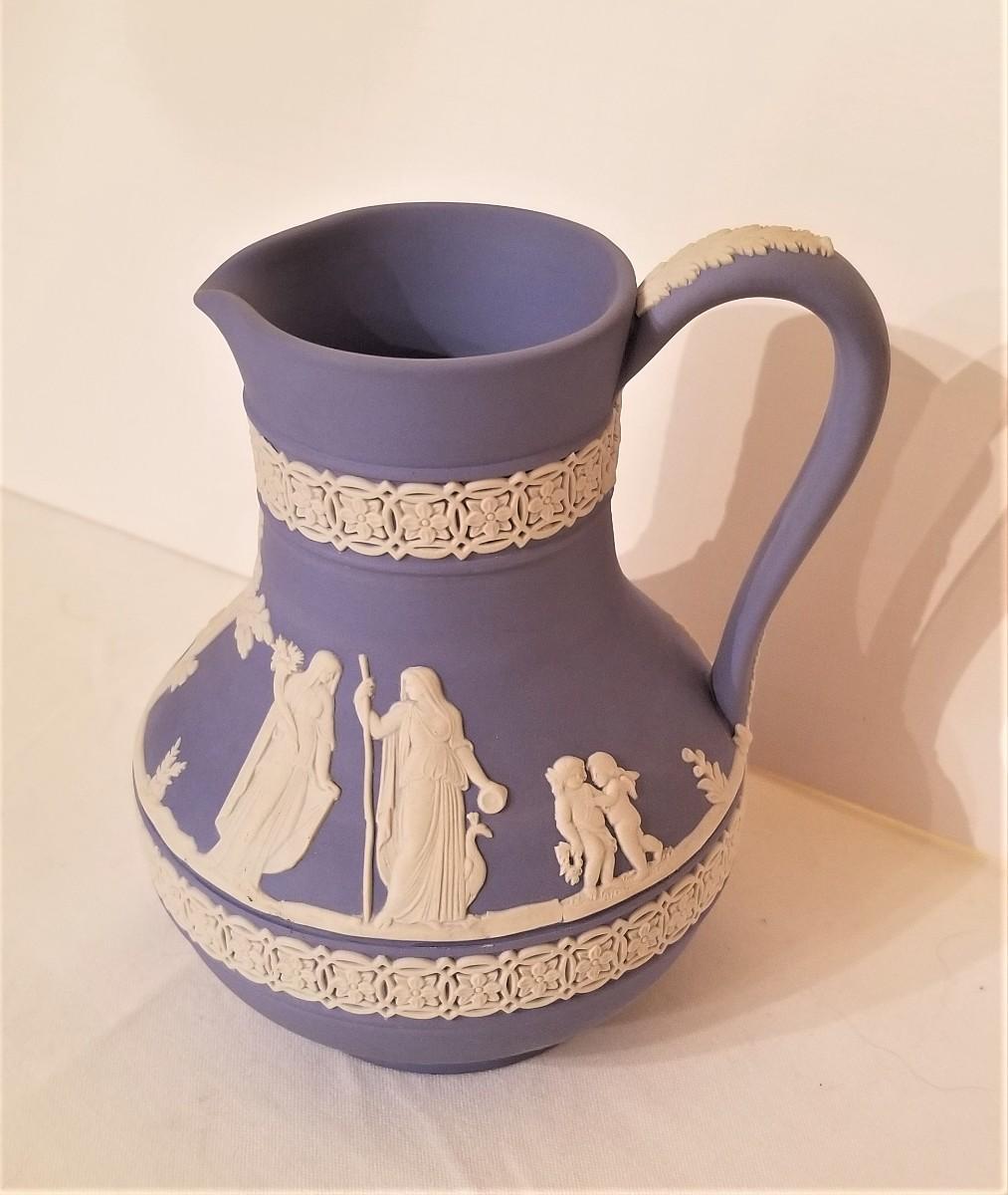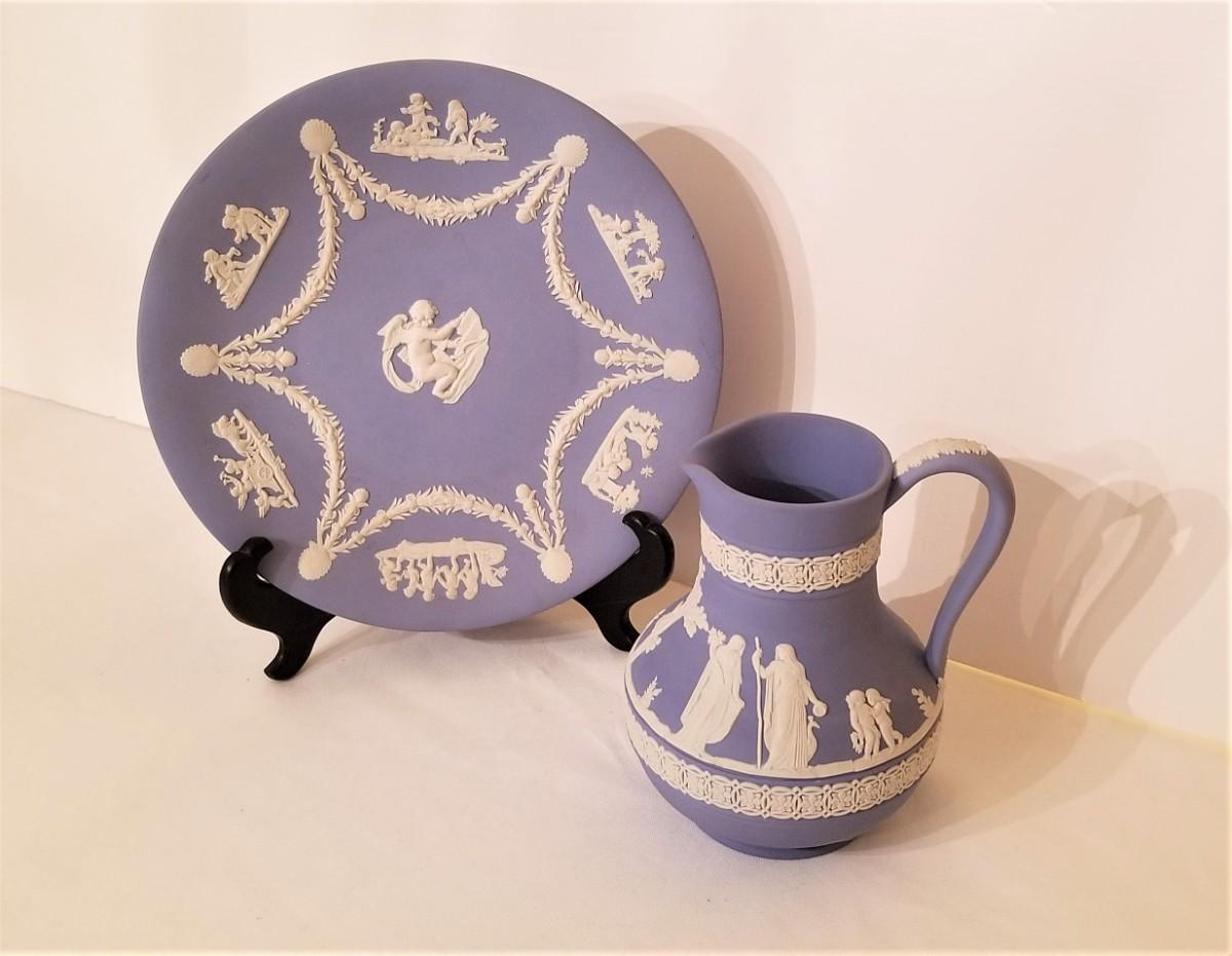 Very pretty Wedgwood (England) Plate and Pitcher. Plate has a Cupid/Cherub motif - pitcher has classic Grecian styling. Both in excellent condition. Pitcher is 6" tall, plate 9" across.