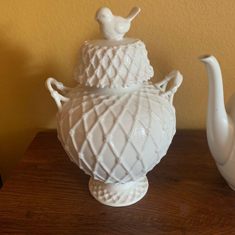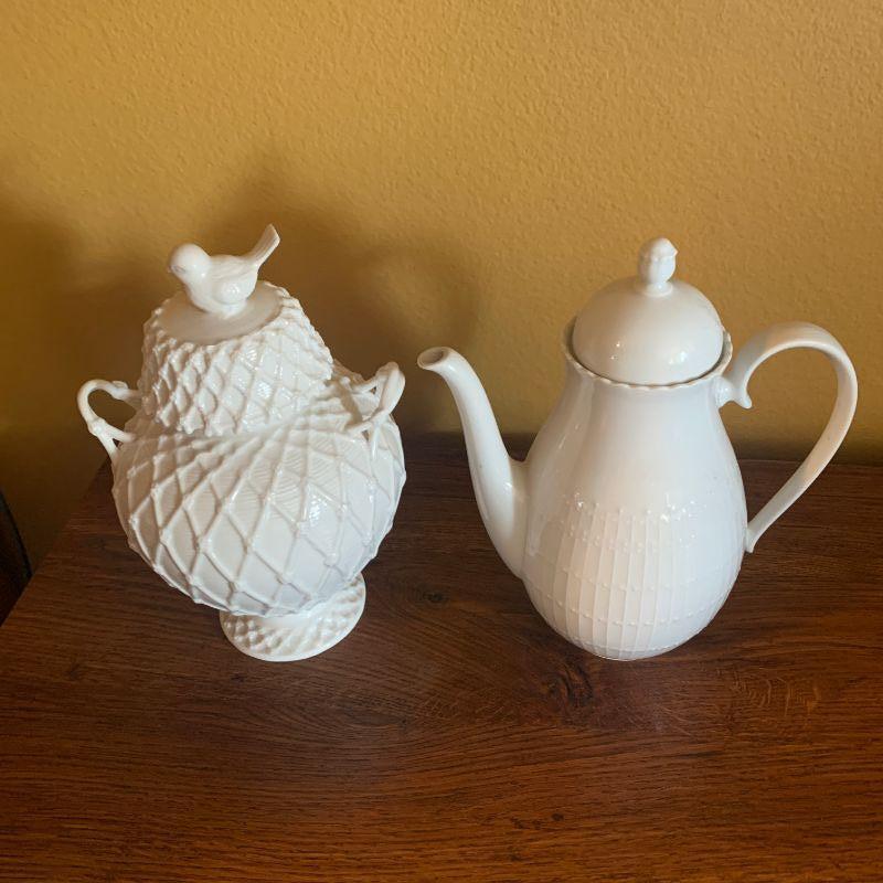 WHITE JAR WITH LID AND COFFEE POT 10"