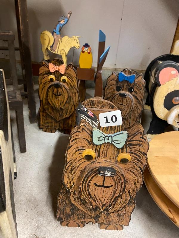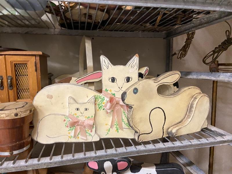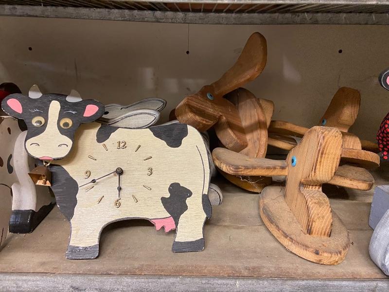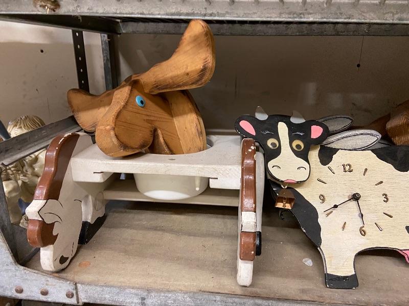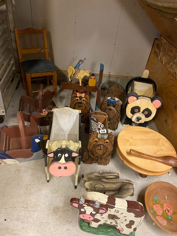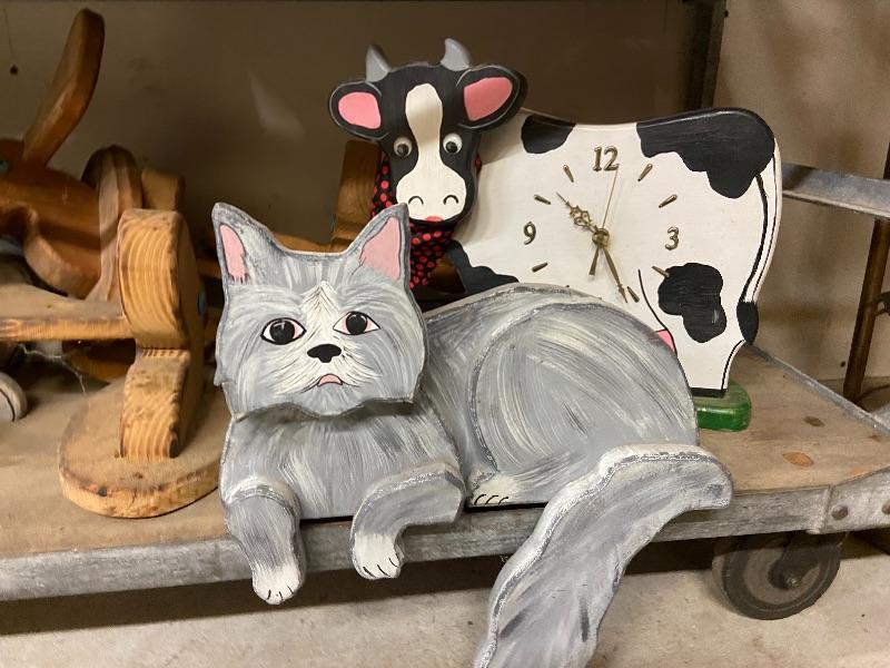 Vintage wooden stools, handcrafted cats, dogs, and more, planters, animal feeders, clocks, and more children’s chairs, jewelry boxes, and. decor. Bring boxes and help to move.