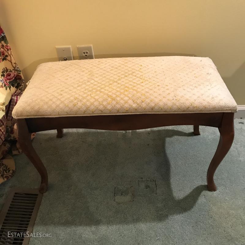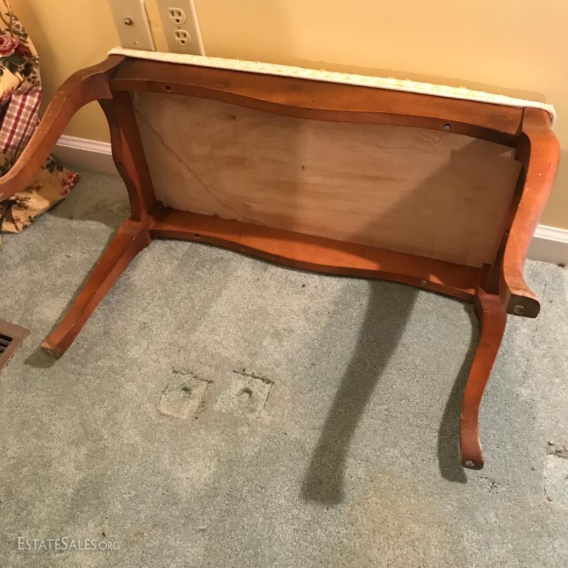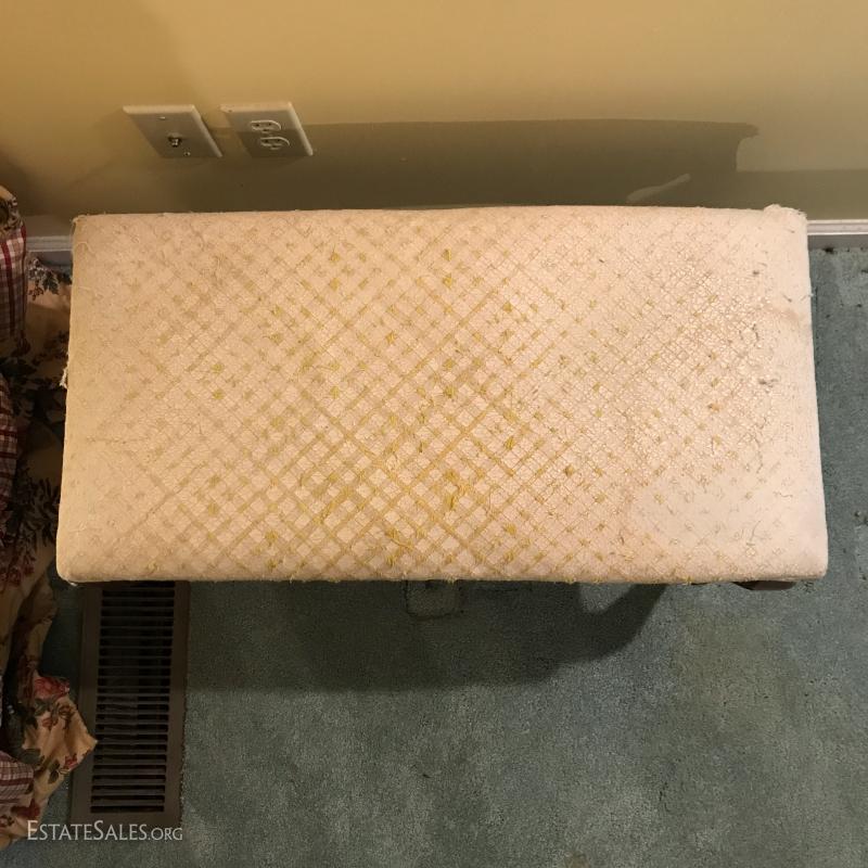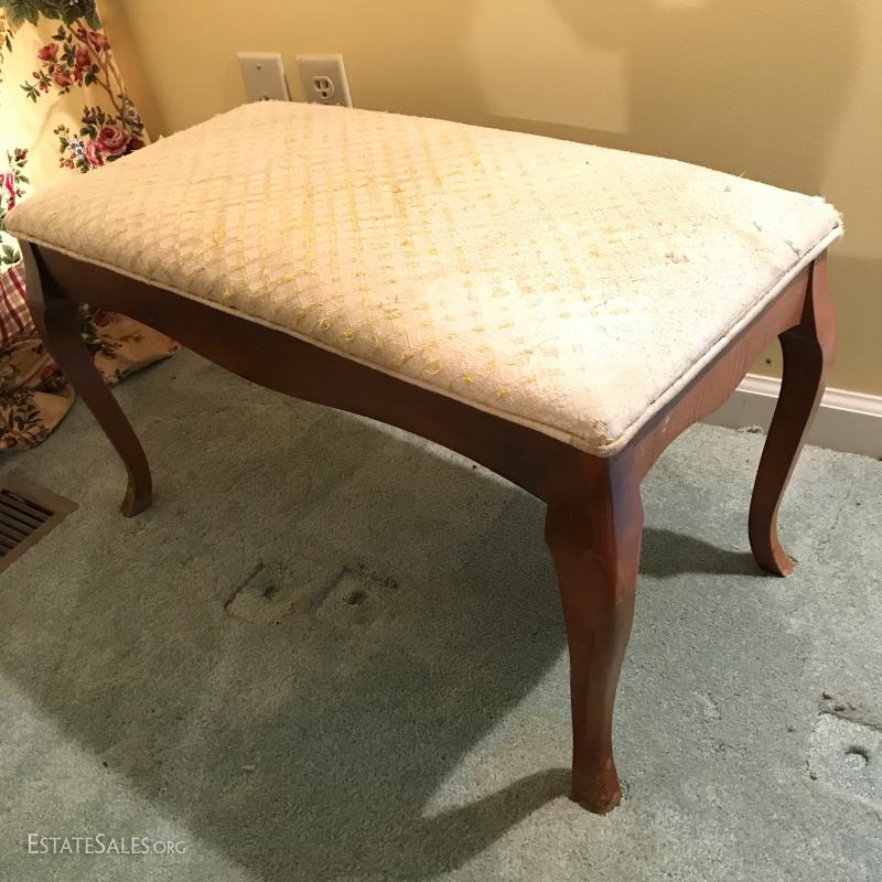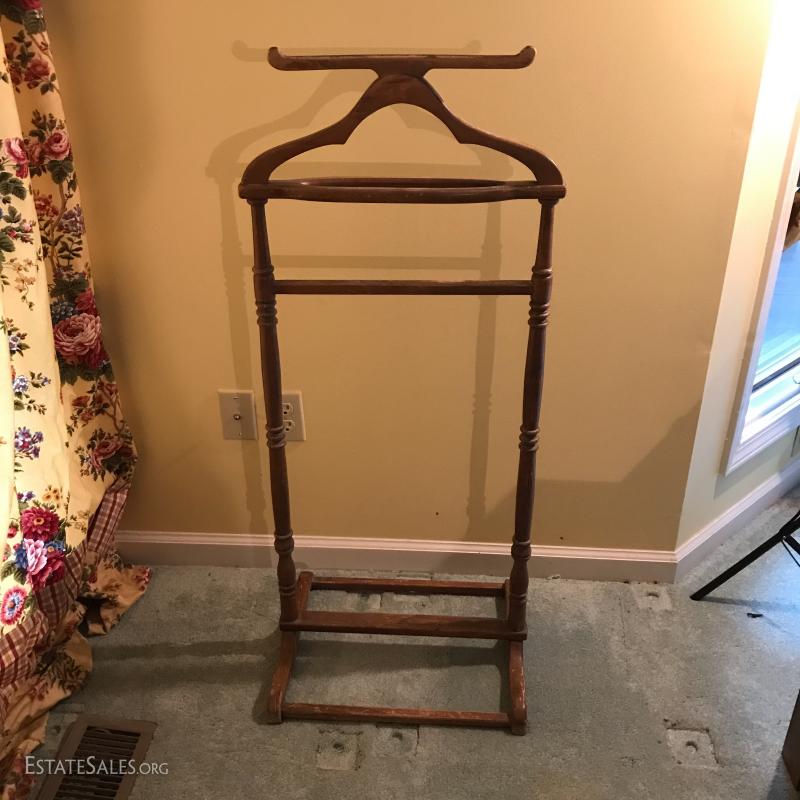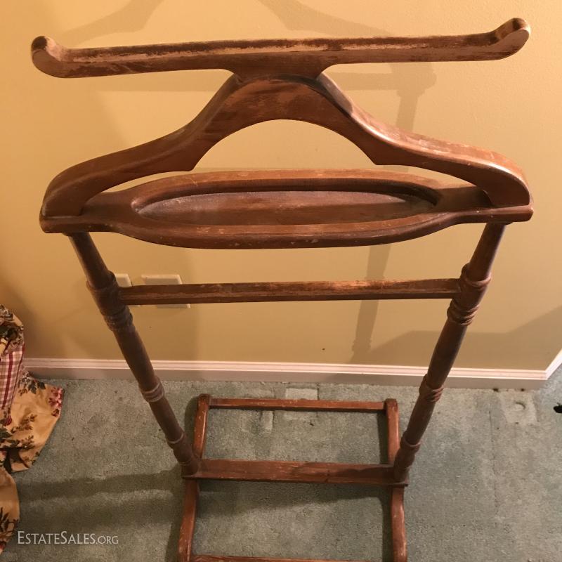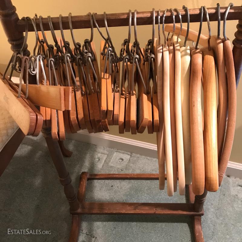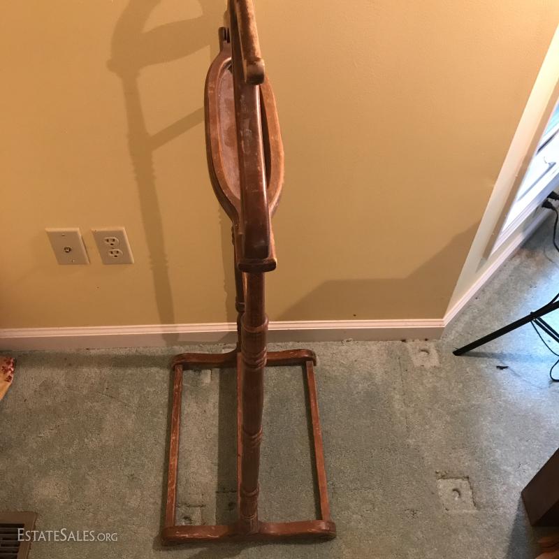 Wooden coat rack. 18.5"l x 15"w x 43"h. Wooden bench with cushion (which needs replacing). Also includes wooden hangers. Bench is 28"l x 14"w x 16"h. No markings on rack or bench. No Shipping. Local pick up only in Flat Rock. NC.