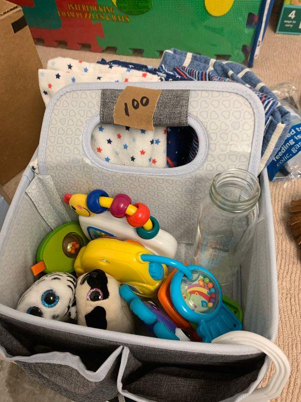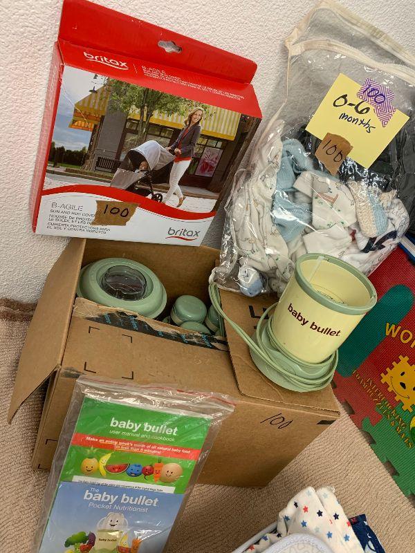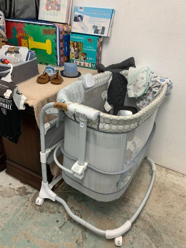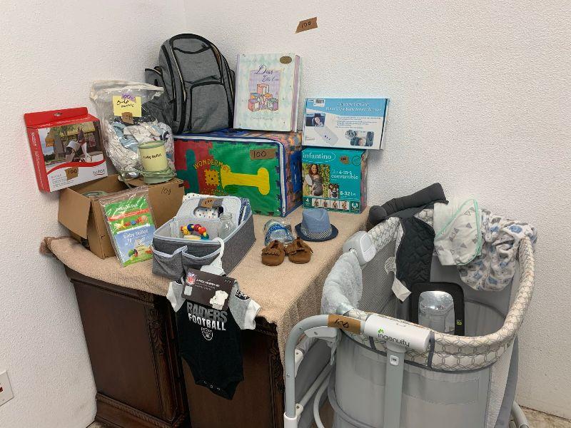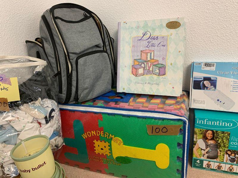Baby Bassinet with many baby items included baby bullet, baby clothes, baby backpack, diaper bag plus
