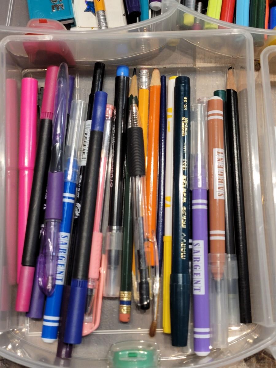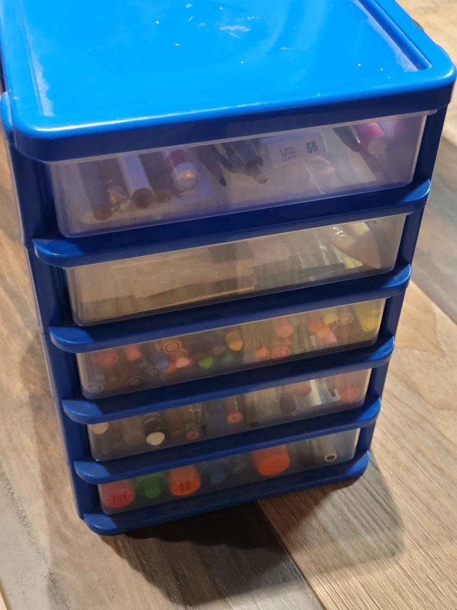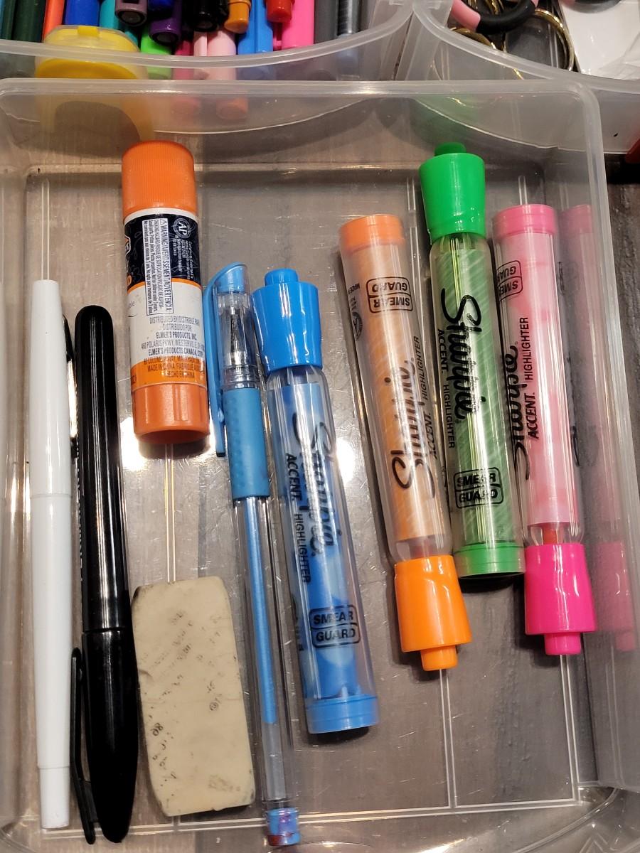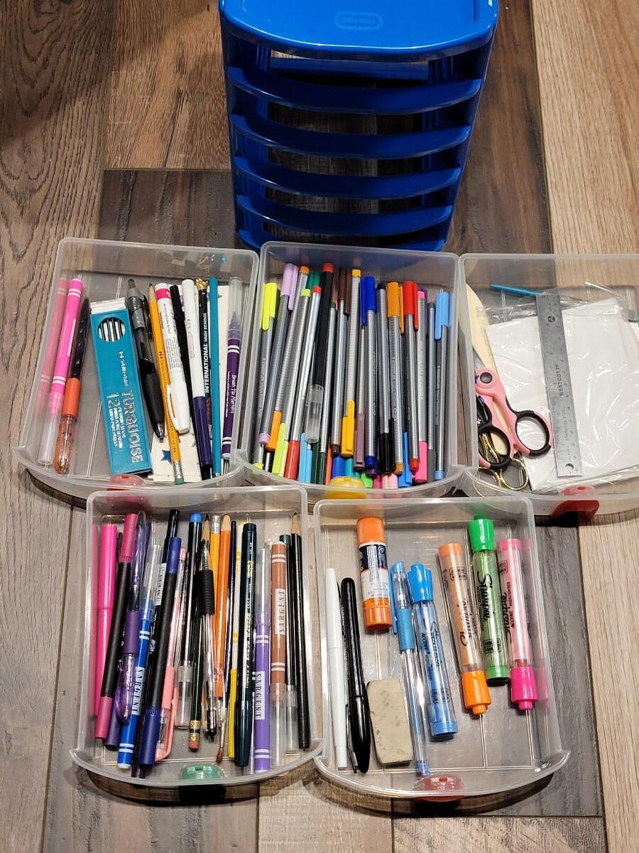 Lot 100: Markers, Pencils, Pens ,Scissors, Glue in a Small Plastic 5 Drawer Organizer