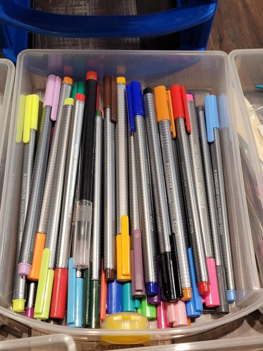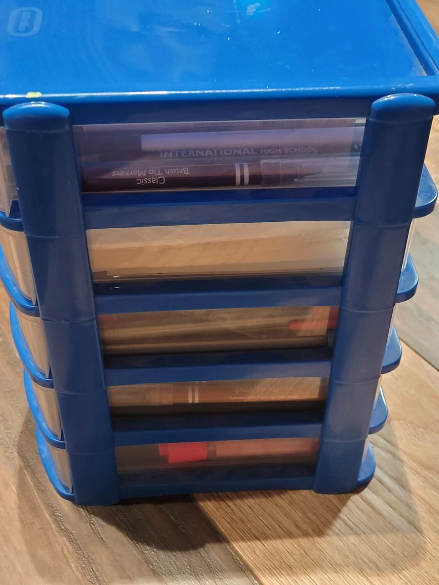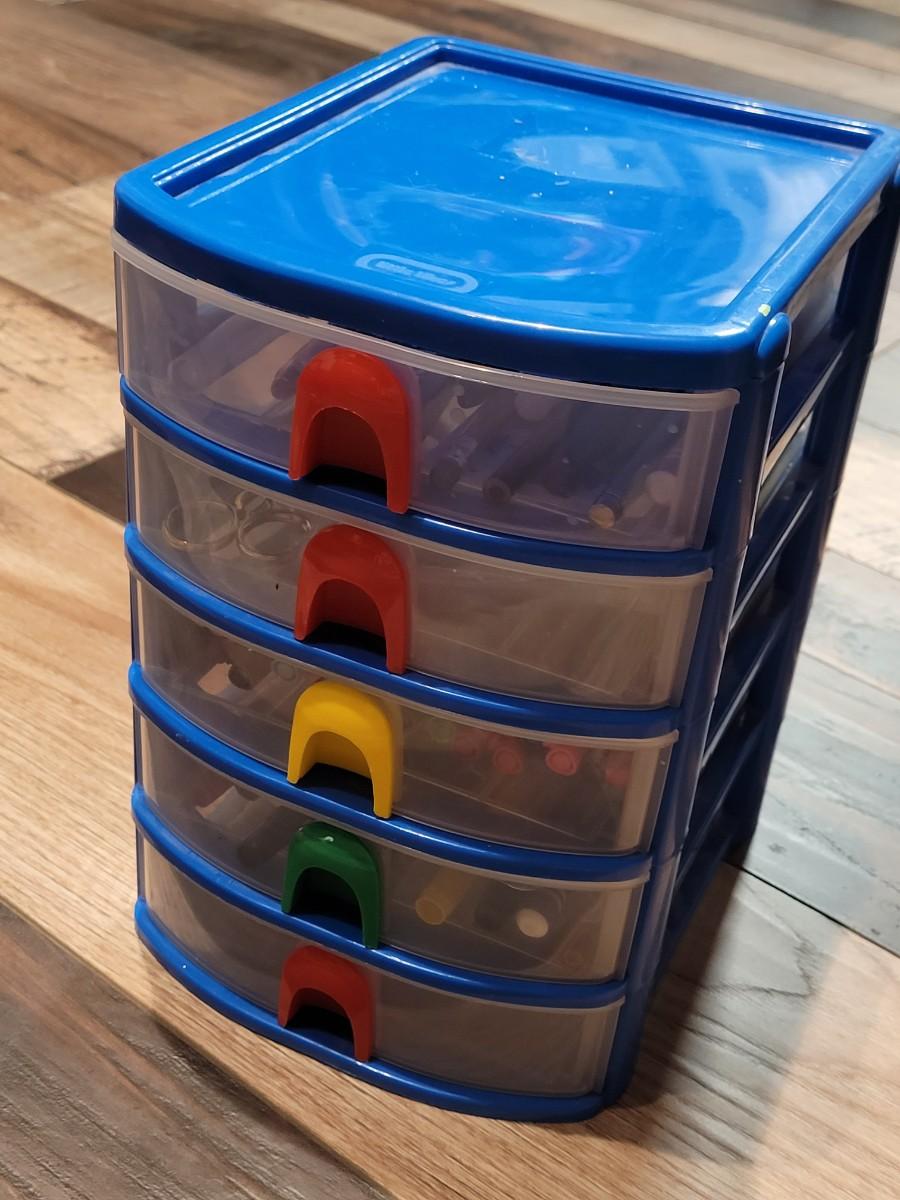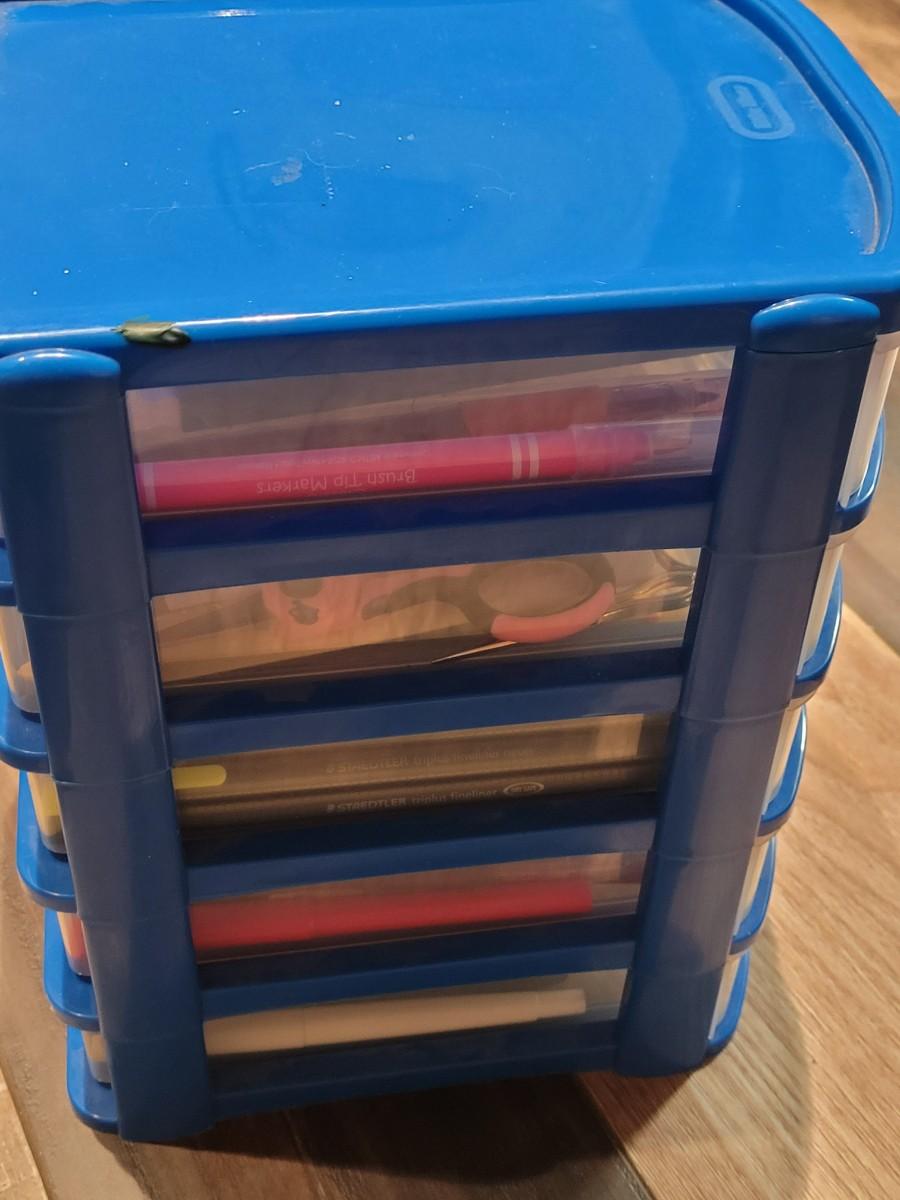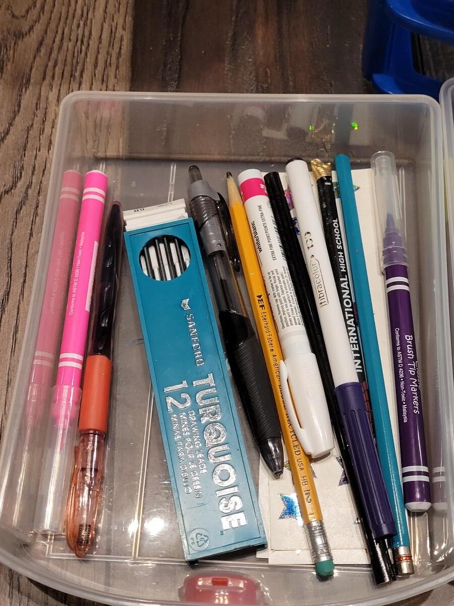 Lot 100: Markers, Pencils, Pens ,Scissors, Glue in a Small Plastic 5 Drawer Organizer