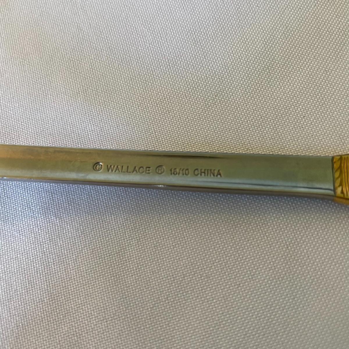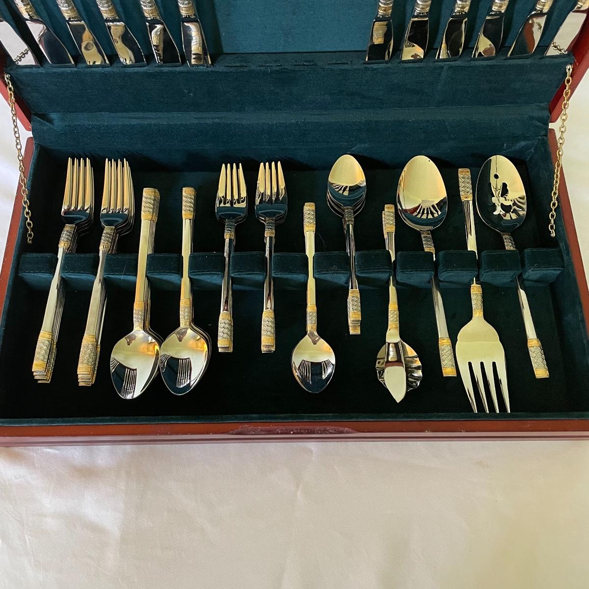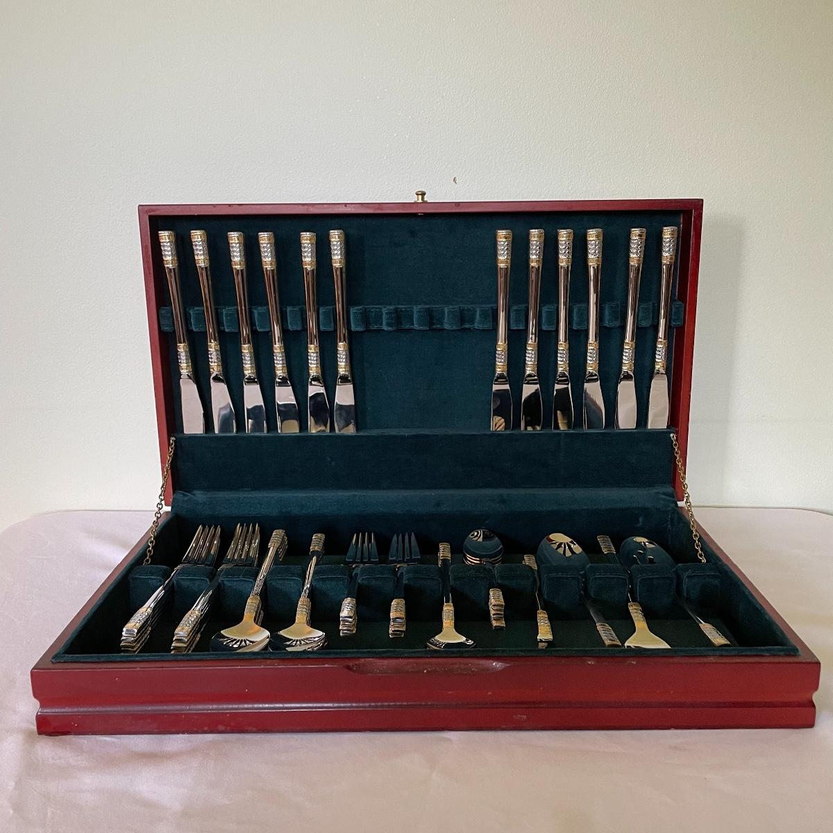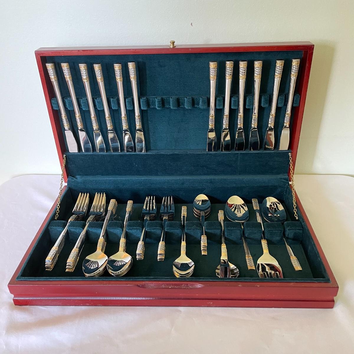 Perfect flatware set for special occasions and everyday meals alike. This sixty piece stainless Wallace flatware set is stunning with ornate silver and gold colored bands. Set includes twelve each: dinner knives, entree forks, salad forks and coffee spoons. Lot also includes thirteen soup spoons and five different serving utensils. This set comes in a nice cherry colored wood case measuring 19” x 10.75” x 3”. See images. Shipping available, but understand this item is heavy. Please call UPS at 828-252-6930 for a quote prior to bidding.
