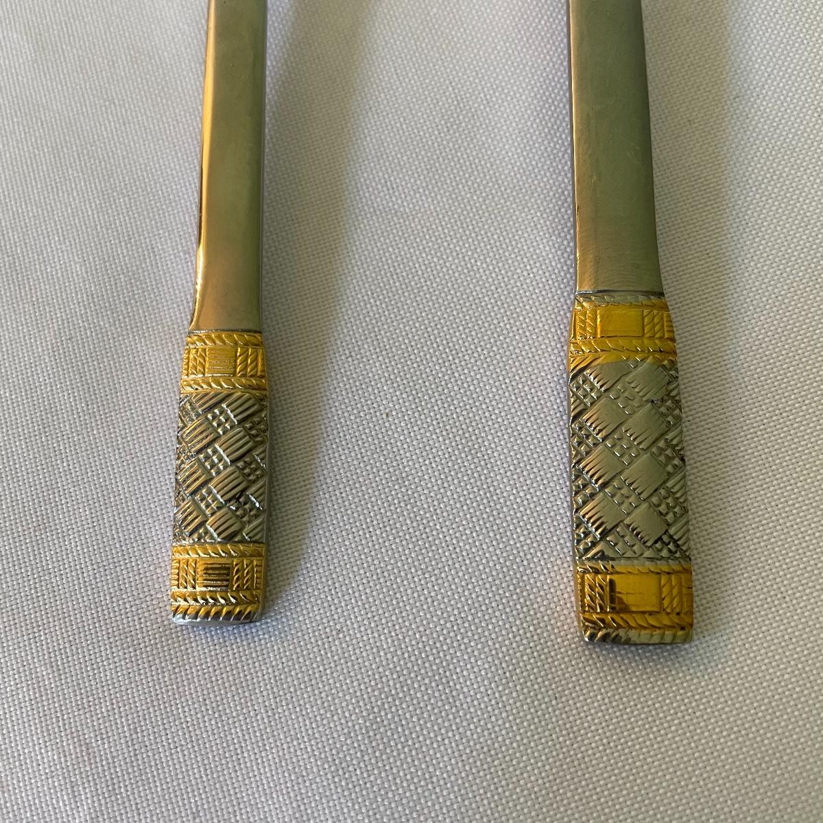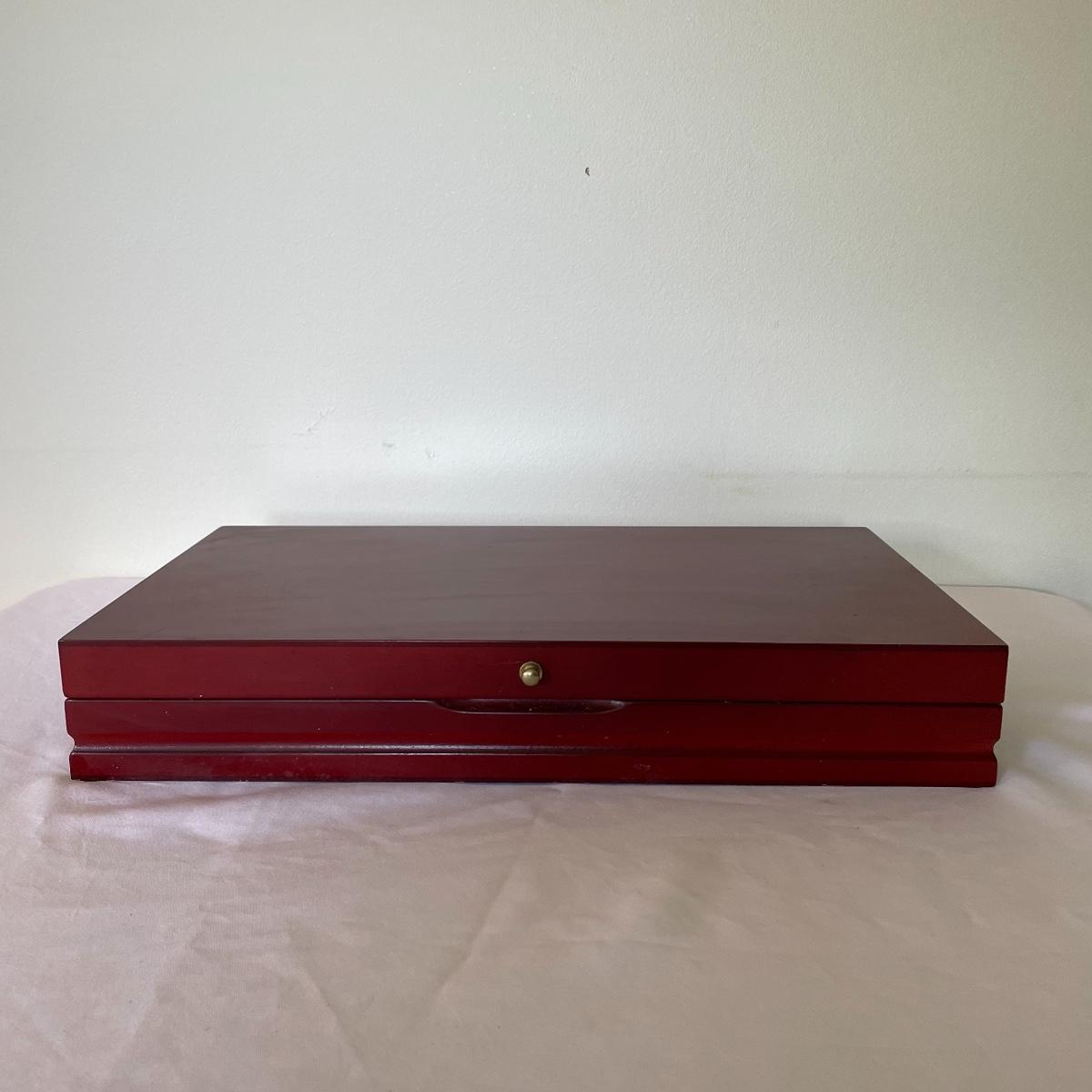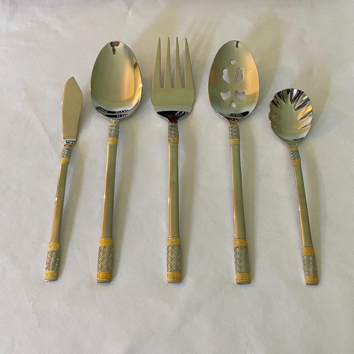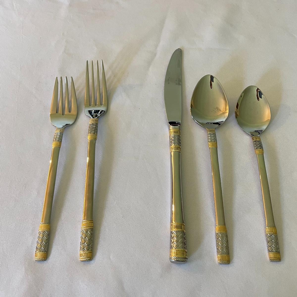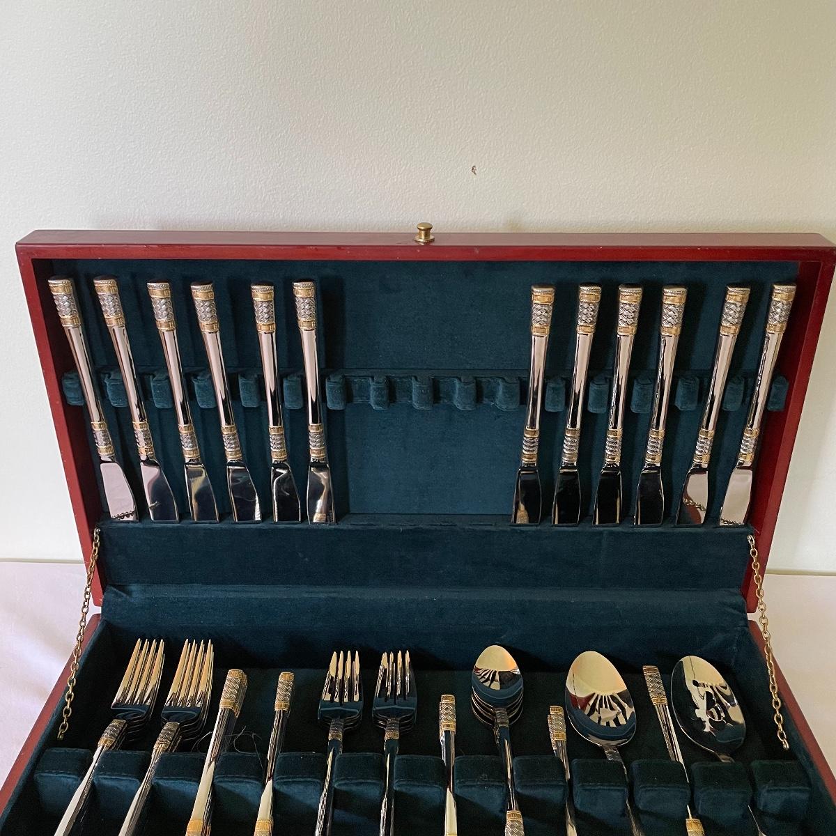 Perfect flatware set for special occasions and everyday meals alike. This sixty piece stainless Wallace flatware set is stunning with ornate silver and gold colored bands. Set includes twelve each: dinner knives, entree forks, salad forks and coffee spoons. Lot also includes thirteen soup spoons and five different serving utensils. This set comes in a nice cherry colored wood case measuring 19” x 10.75” x 3”. See images. Shipping available, but understand this item is heavy. Please call UPS at 828-252-6930 for a quote prior to bidding.