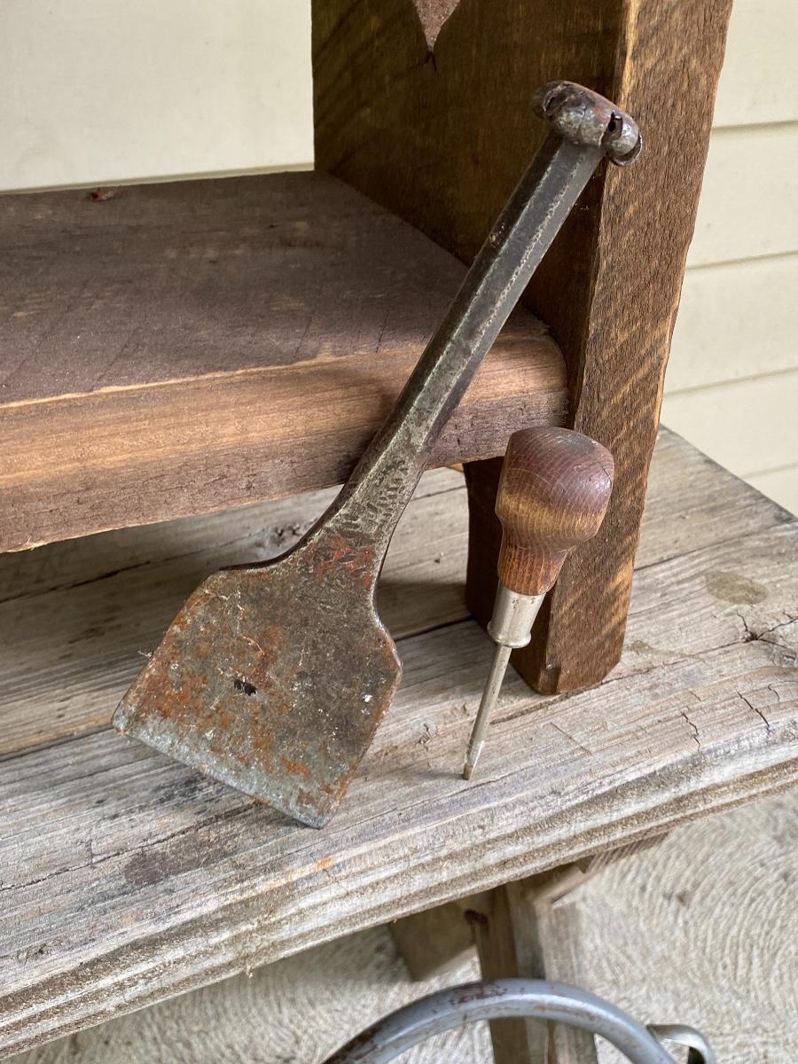 Patio/Garden Tile, Terra Cotta Candle Holder, Bow Saw & tools, Cast Iron Fire Poker