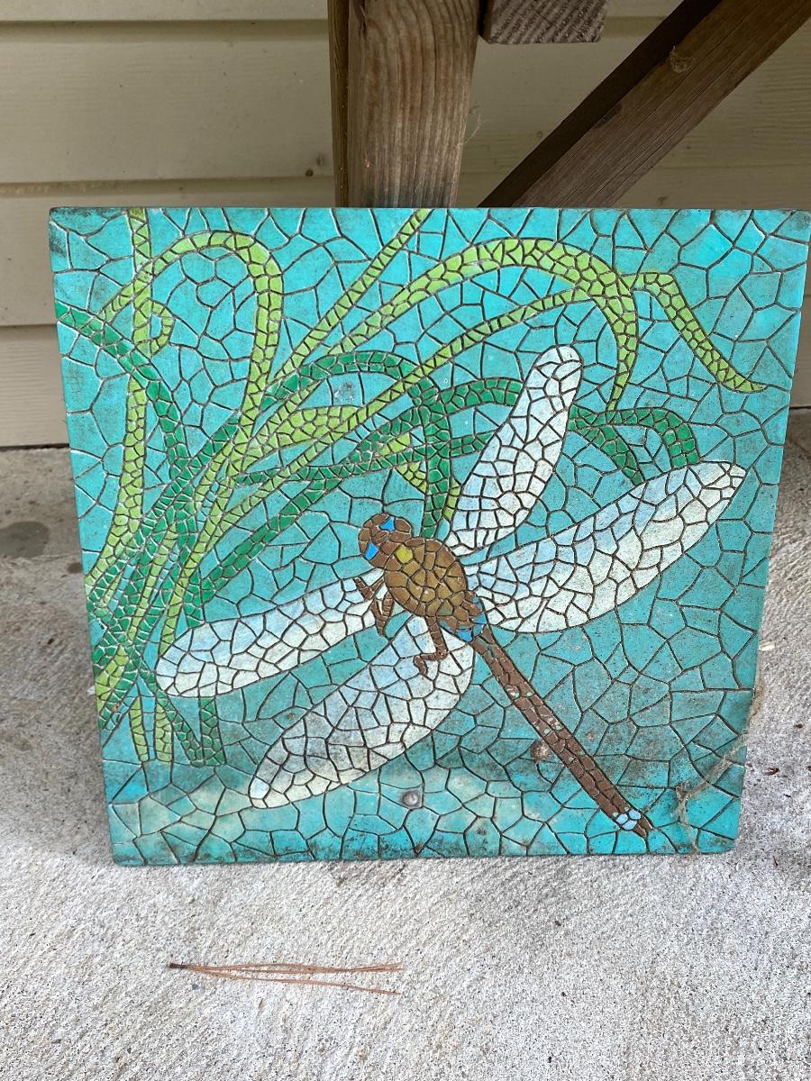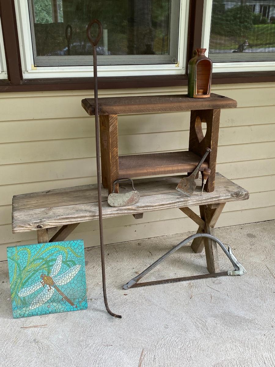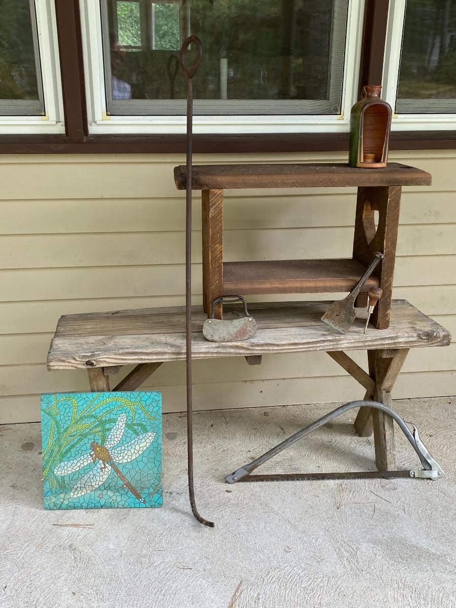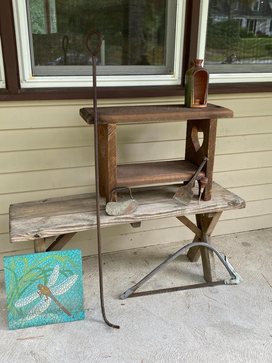Lot 100: Dragonfly Tile, Handmade Barnwood Bench, Porch/ Patio Décor Lot