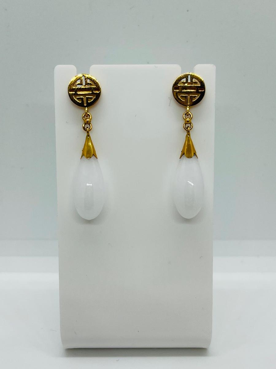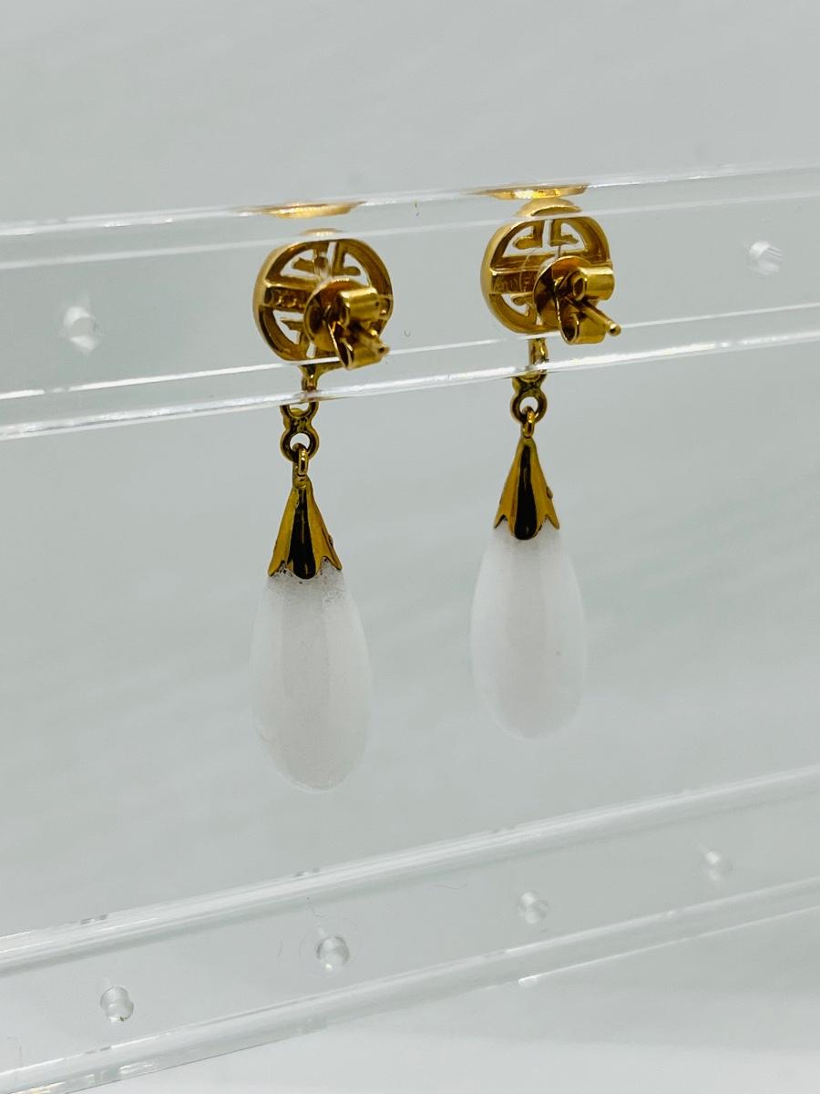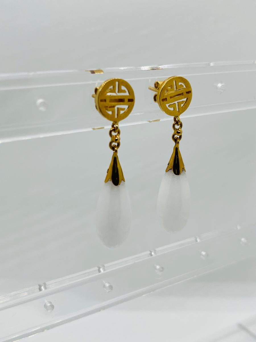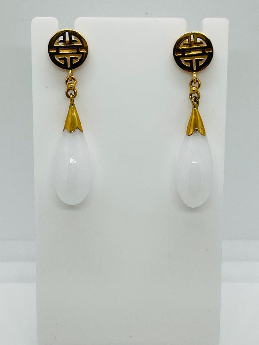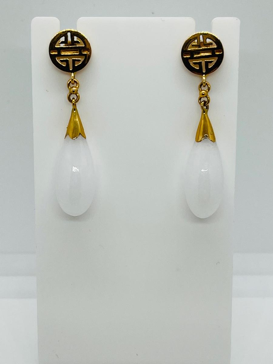 Lot 100: Gumps 14k White Jade Good Luck teardrop pierced earrings