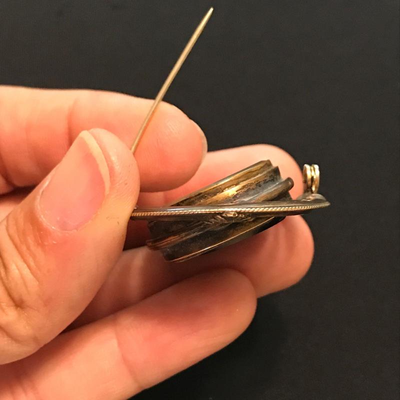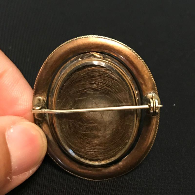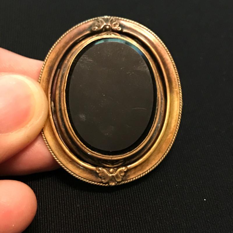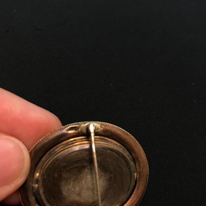 Pin has real hair inside. Hair was placed inside for sentimental reasons or for mourning. Black stone on front swivels to the side that has the hair inside. Illegible stamp on metal. See pix. Pin measures 1.75” x 1.5” Shipping Available.