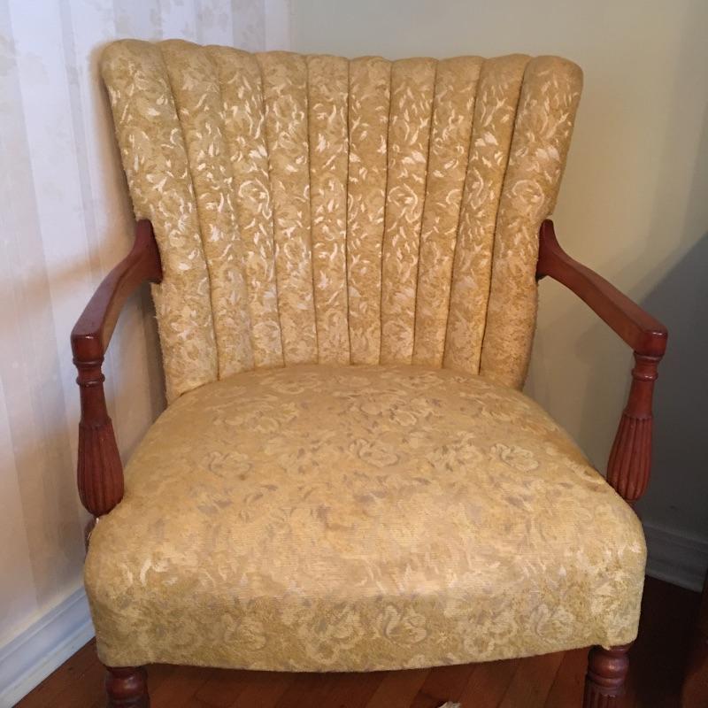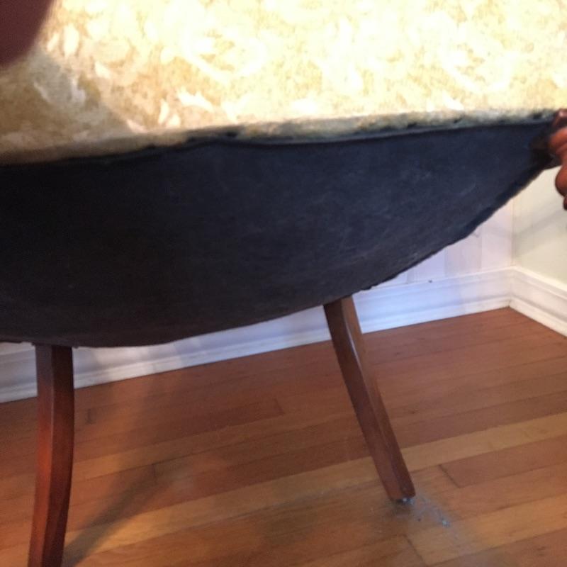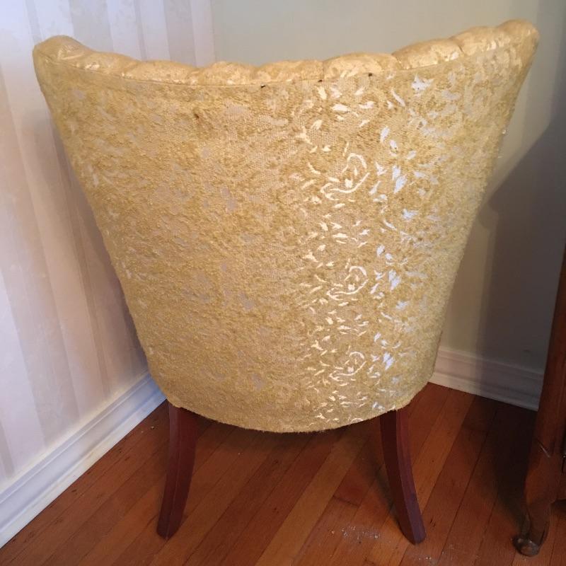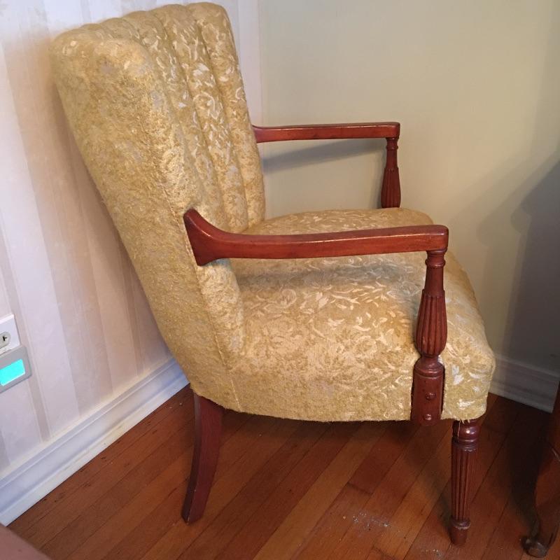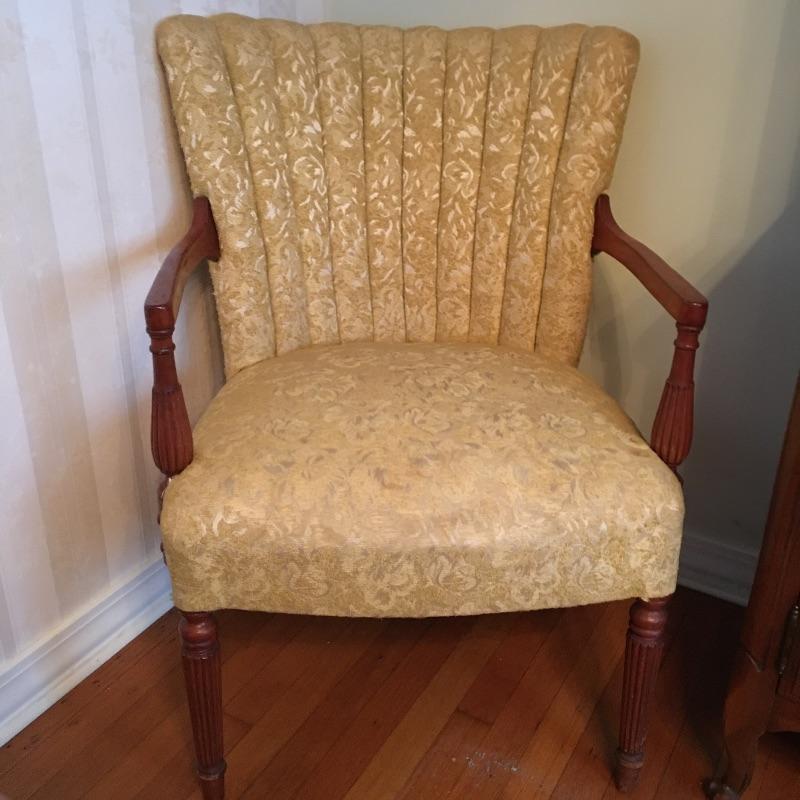 Tulip style back on this beautiful accent chair. Lovely armchair with a golden colored fabric and wooden arms and legs. Fabric has a few marks, see pictures. Chair measures 25.5” x 27” x 34” with a 18.5” seat height.