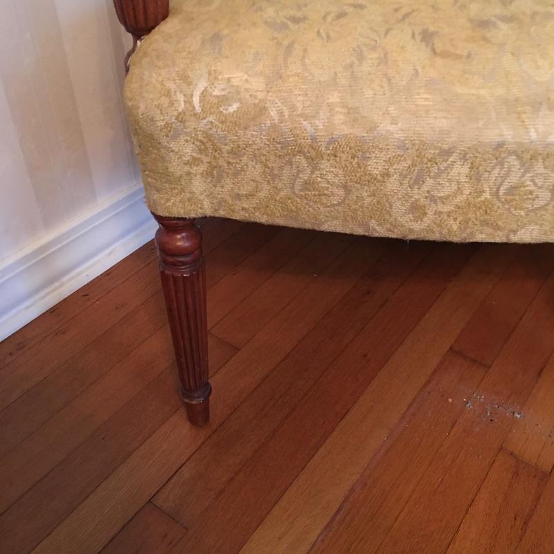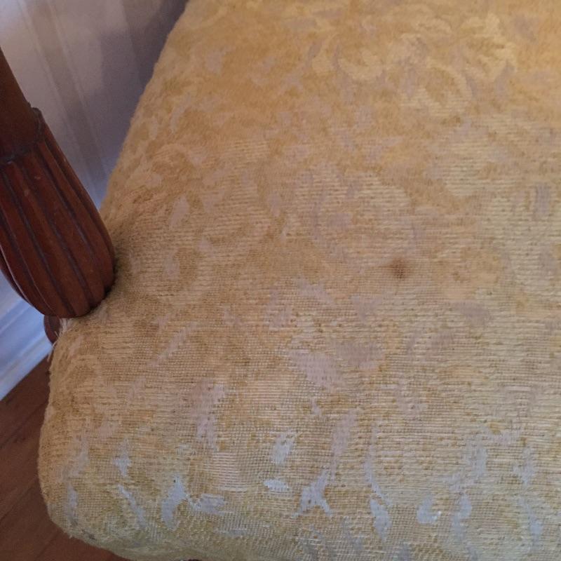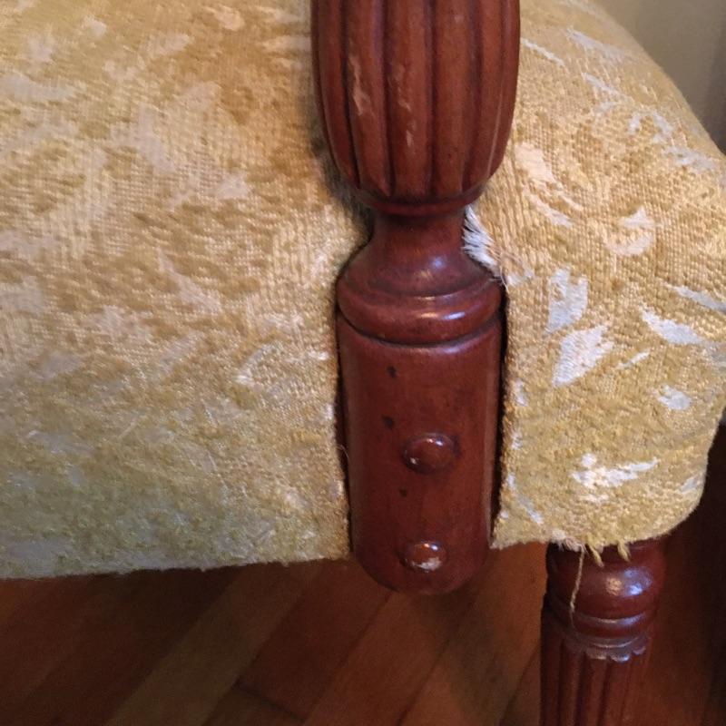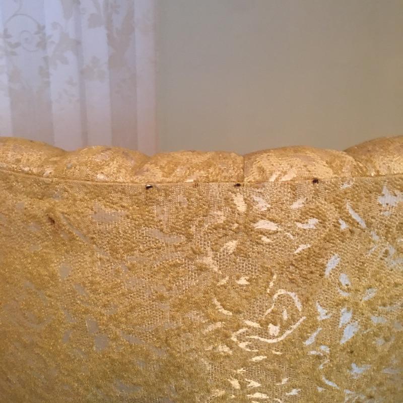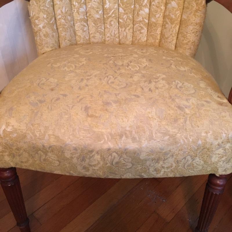 Tulip style back on this beautiful accent chair. Lovely armchair with a golden colored fabric and wooden arms and legs. Fabric has a few marks, see pictures. Chair measures 25.5” x 27” x 34” with a 18.5” seat height.
