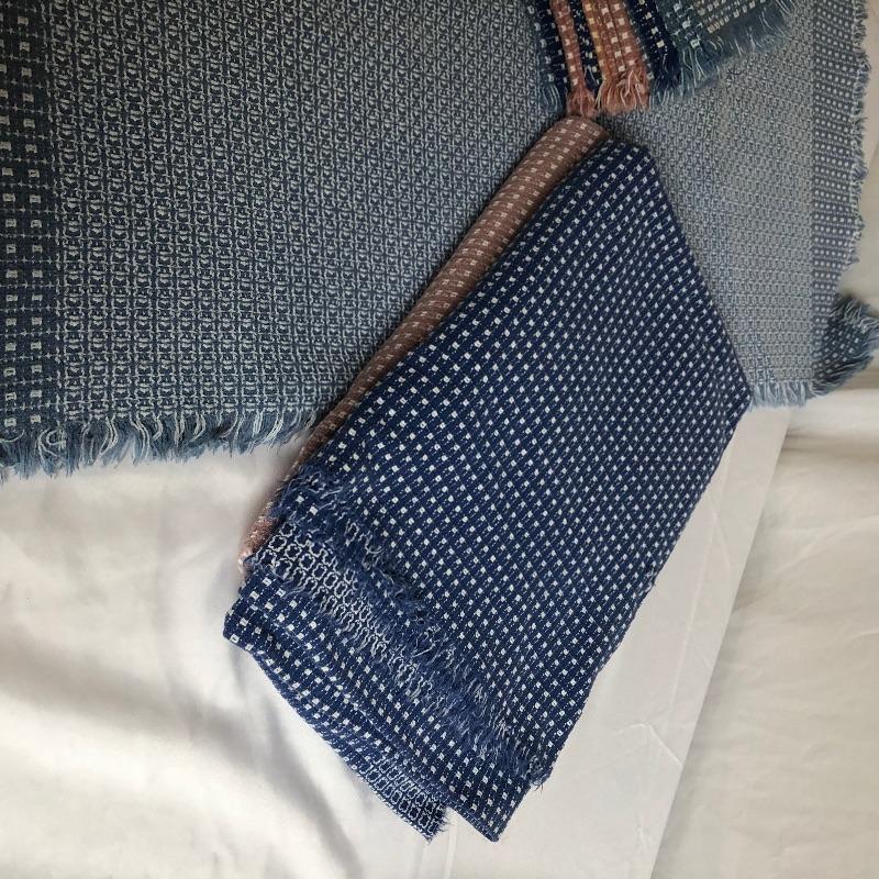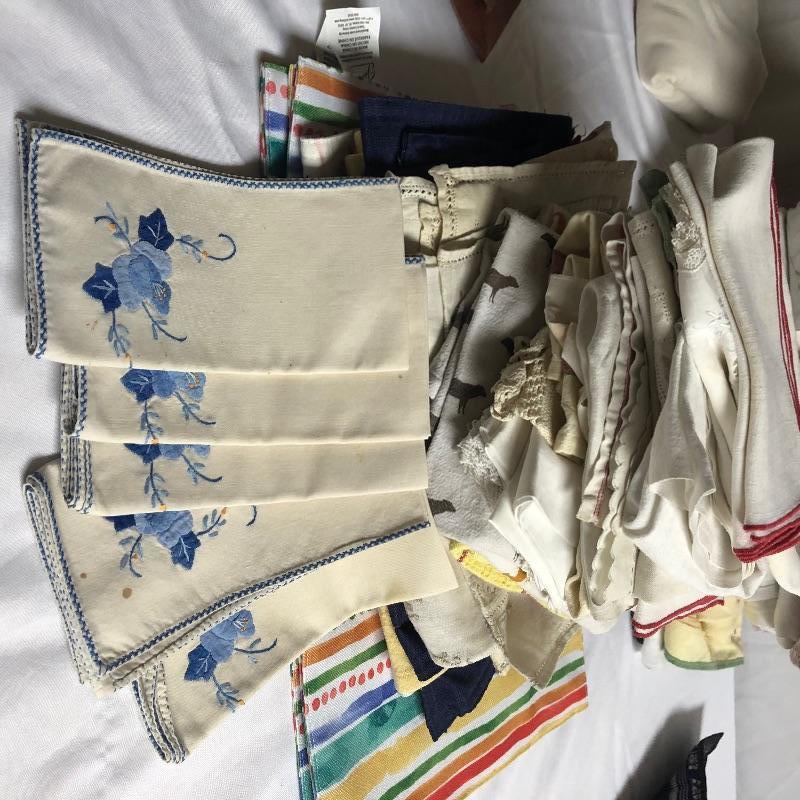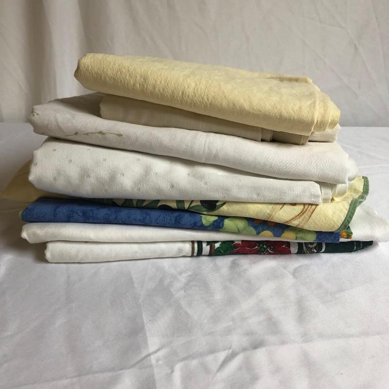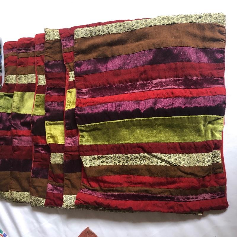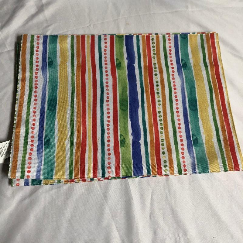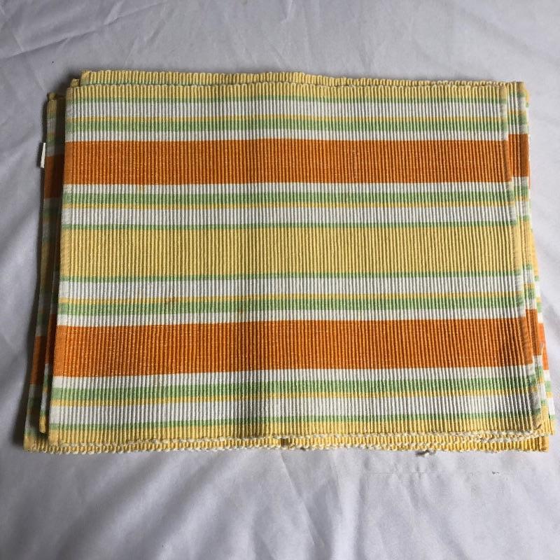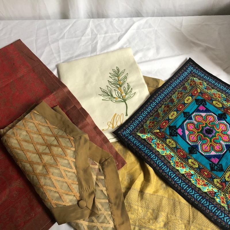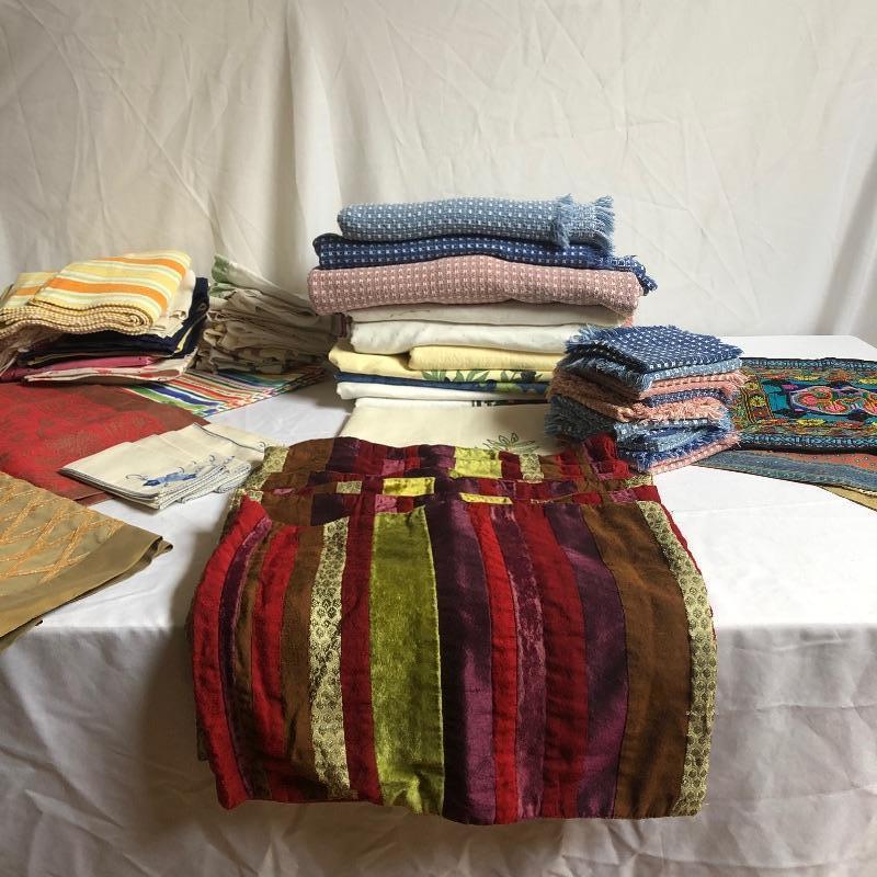 Large assortment of table linens. There are some sets and some not in sets. The sets of placemats include six “˜velvet’ stripped, 8 yellow orange and green, four with primary colored stripes. Also included are a good number of mix matched placemats and napkins. There are five eclectic table runners and centerpiece mats. For reference, the very colorful woven piece measures 18” x 18”. There are also three thicker woven tablecloths with a matching set of twelve napkins. There is some staining on the napkins. There are also eight other assorted tablecloths. All items are in good condition with some minor staining on some. The would be a great lot for someone who likes to entertain with some style. Shipping Available.