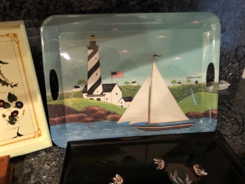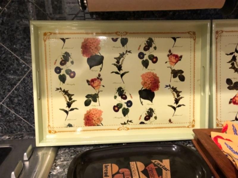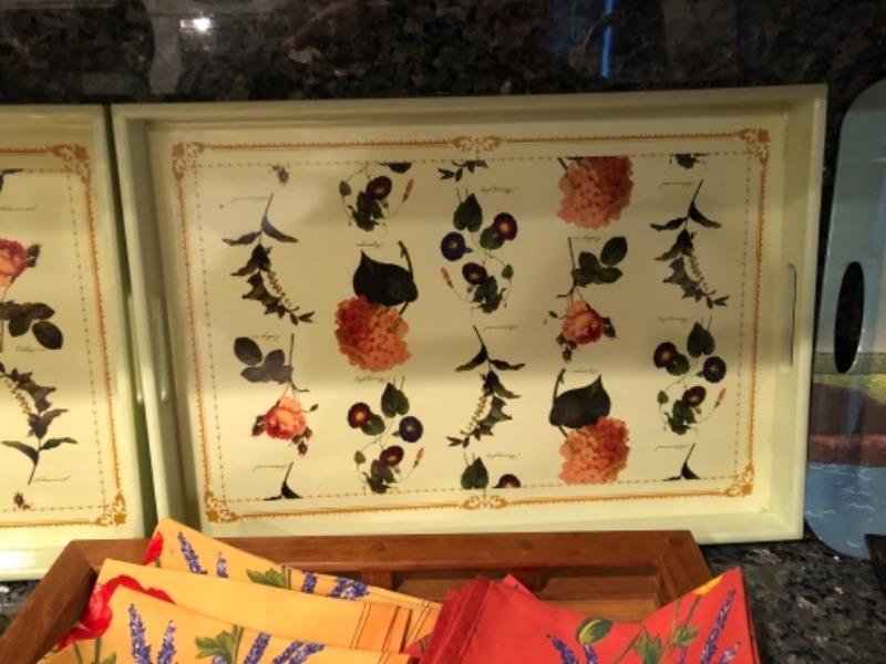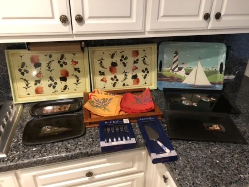 Lot 100. Assorted trays, cloth napkins, Spode cake server and dessert forks--WAS $55““NOW $27.50