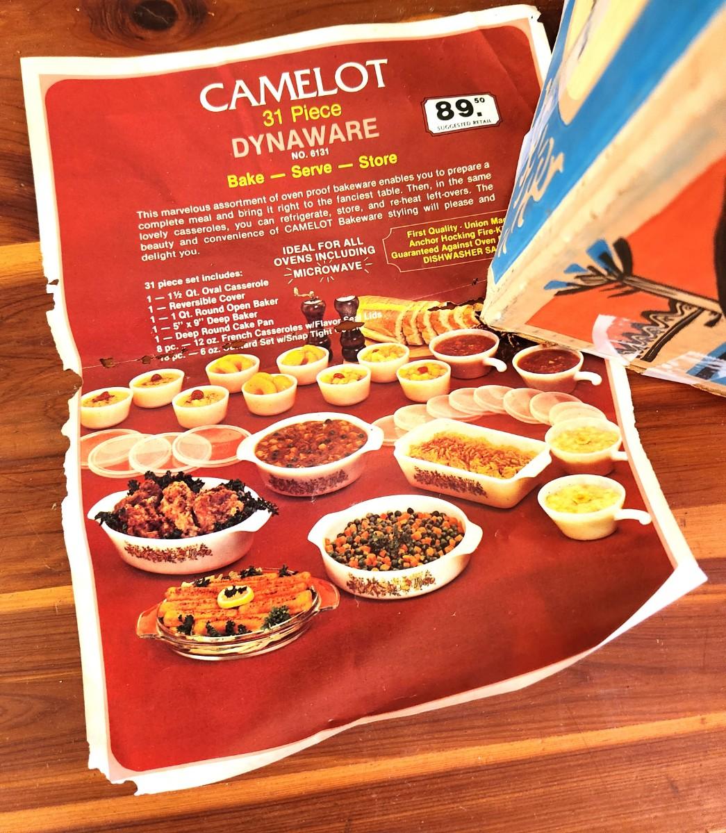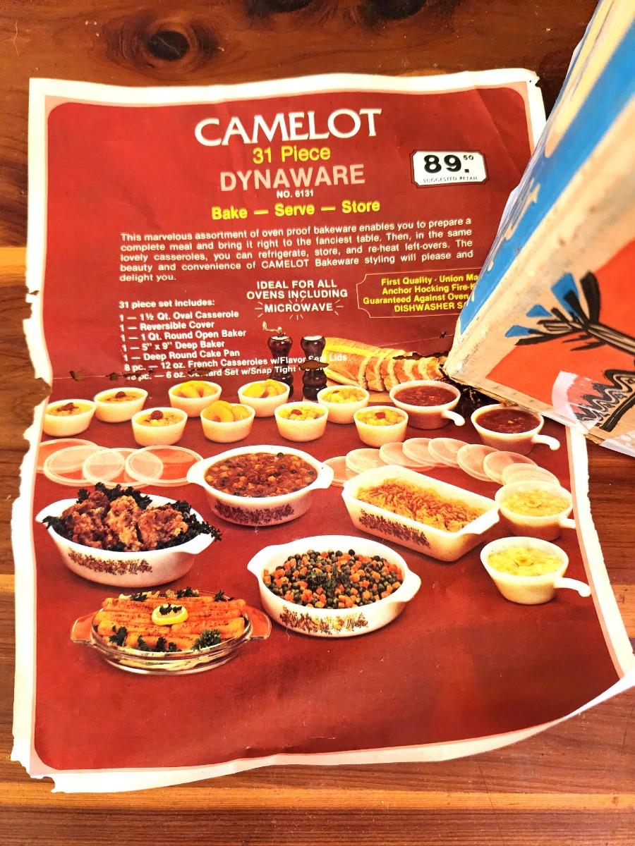 Unused in box! Vintage 31 piece Camelot Dynaware Bake-Serve-Store set - never removed from box. The flyer shows you what's inside. Early 80's - many pieces made by Anchor Hocking Fire King it was $89.50 suggested Retail back in the day.