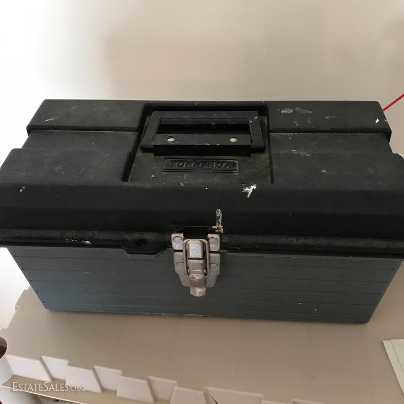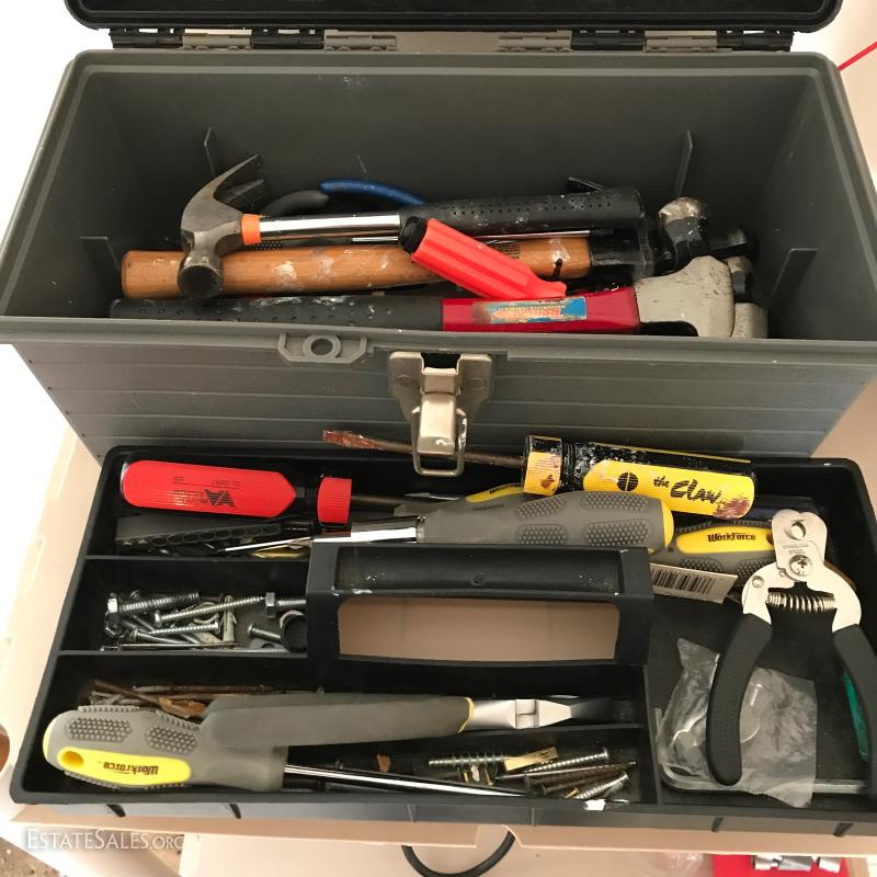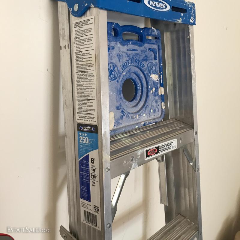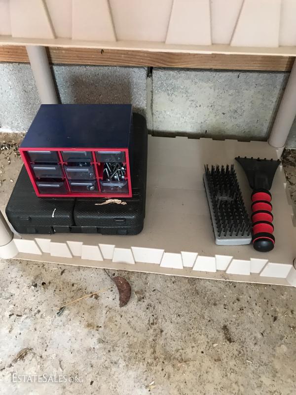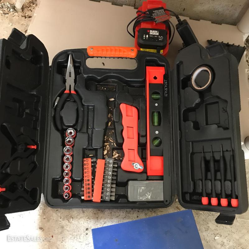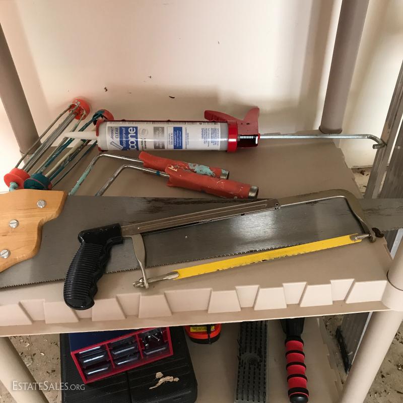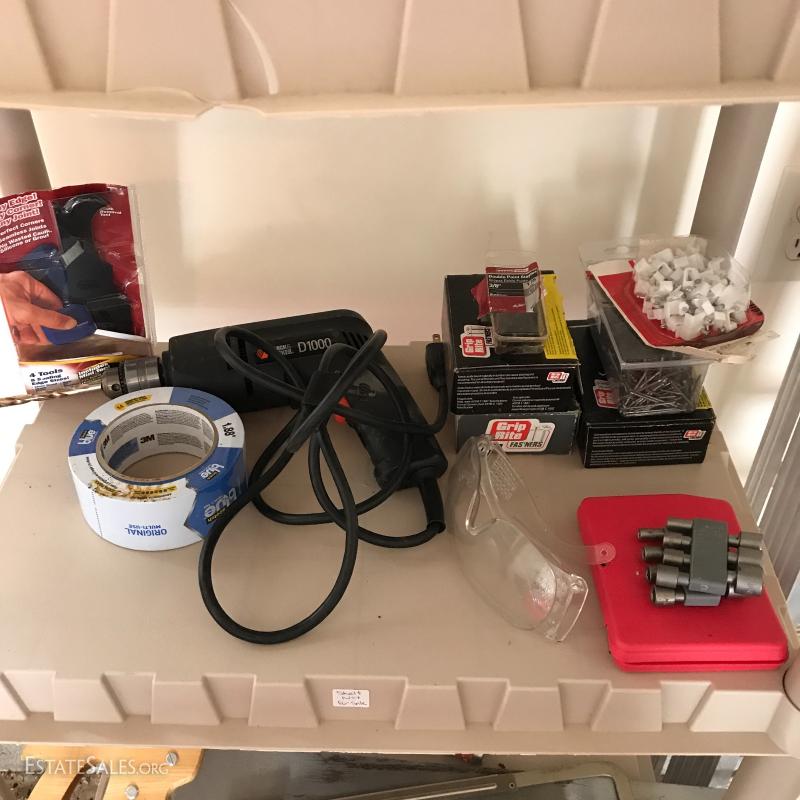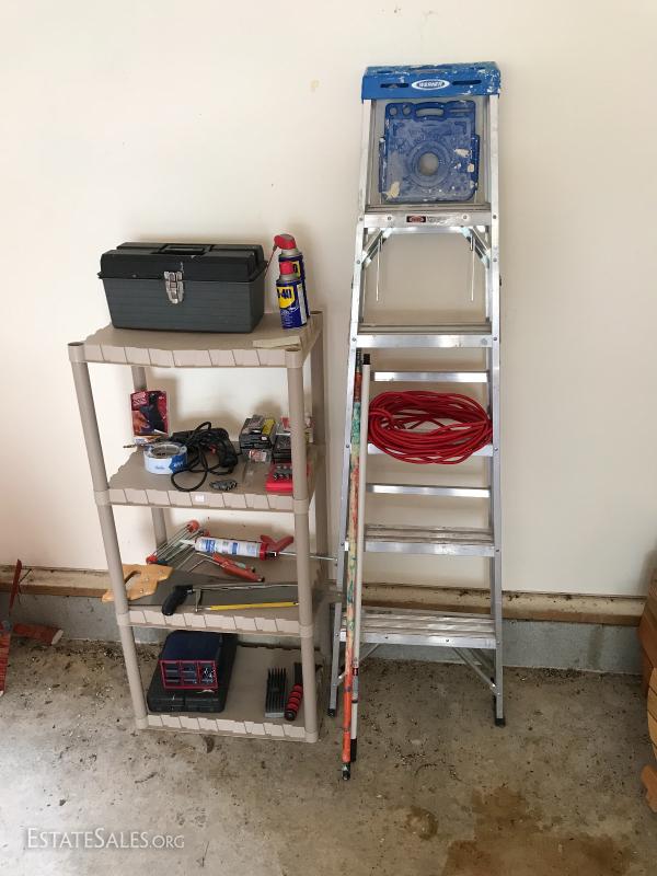 Nice lot for new homeowner with basic tools for the home. 6' Werner ladder, drop cord, paint rollers with extension rods, travel tool kit, two saws, safety goggles, tool box with basic hammer, screw drivers etc. B&B D1000 drill with drill bits and sockets. Misc screws, tacks etc. and more. Shelf not included. This lot is available for local pick up in Mills River, NC only.