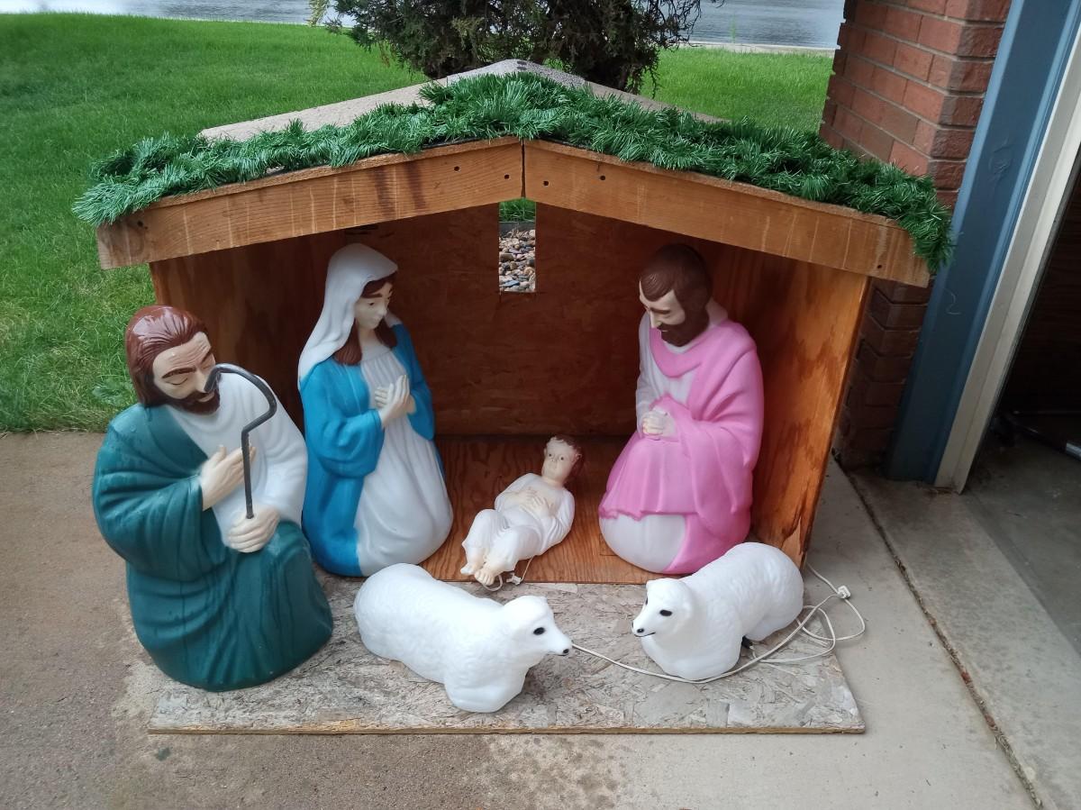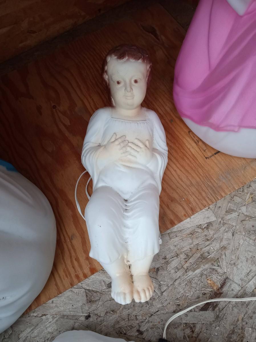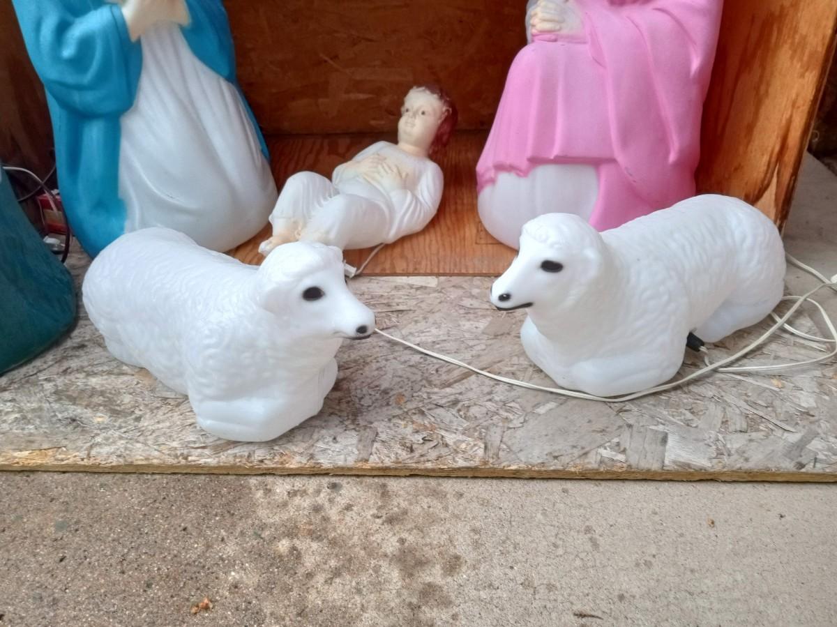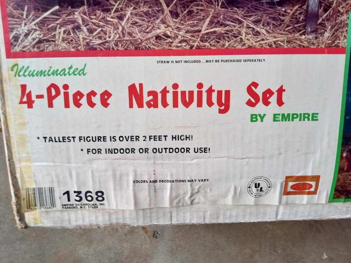 THERE IS NO MANGER FOR THE BABY JESUS BUT ALL BLOW MOLDS ARE LIGHTED AND IN VERY GOOD SHAPE
