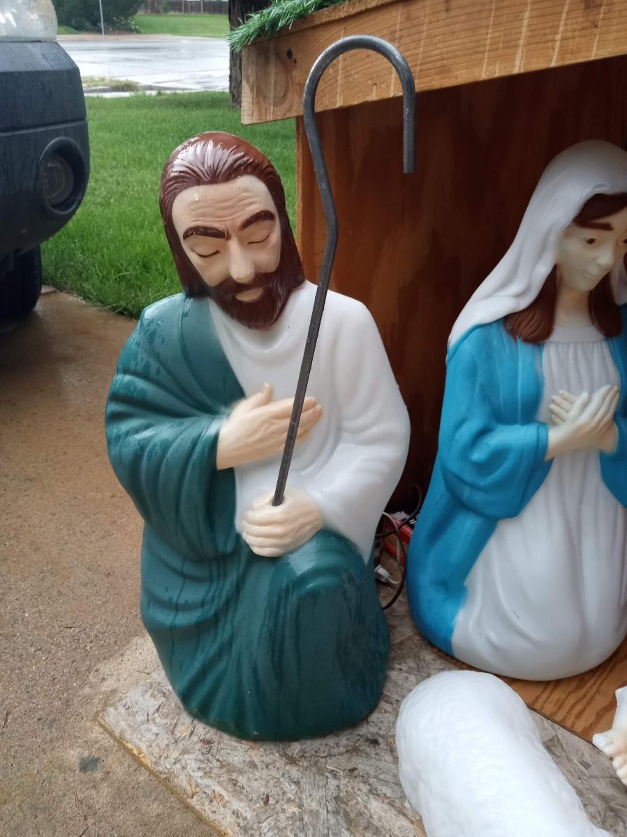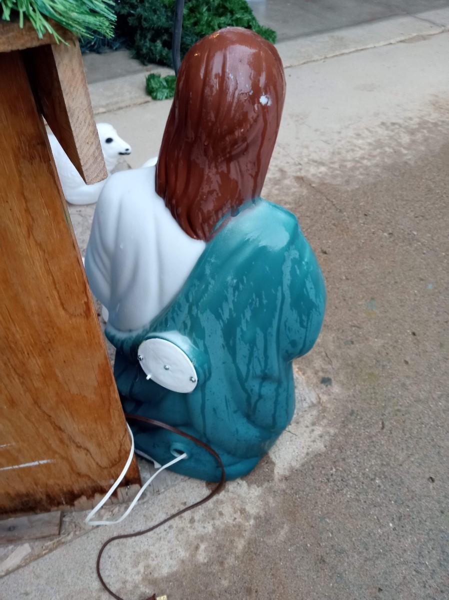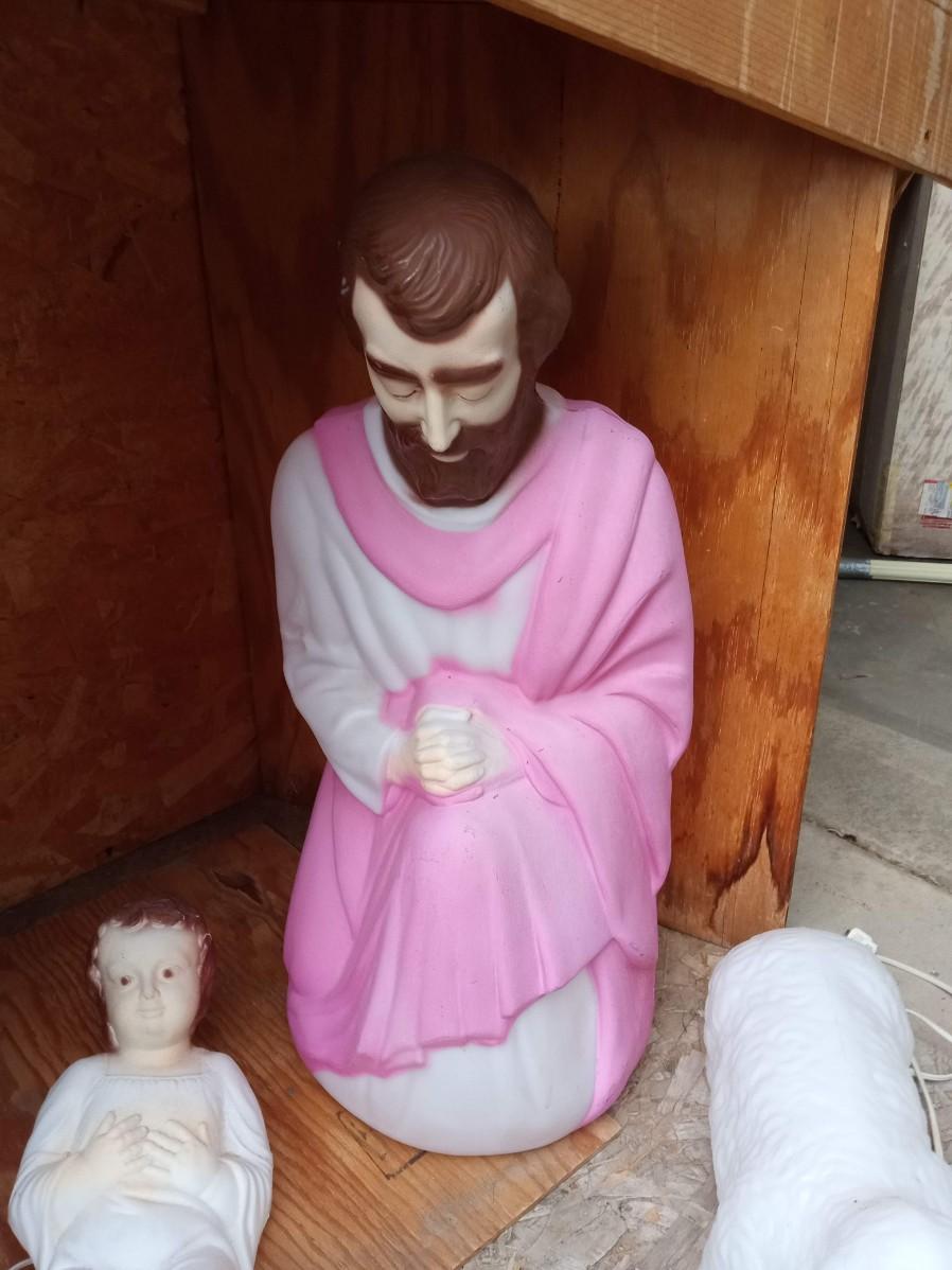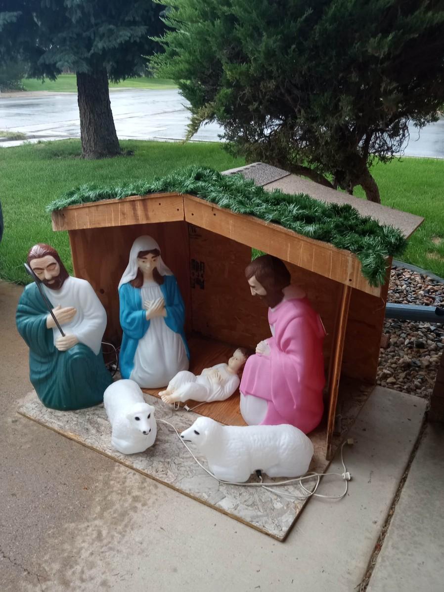 THERE IS NO MANGER FOR THE BABY JESUS BUT ALL BLOW MOLDS ARE LIGHTED AND IN VERY GOOD SHAPE