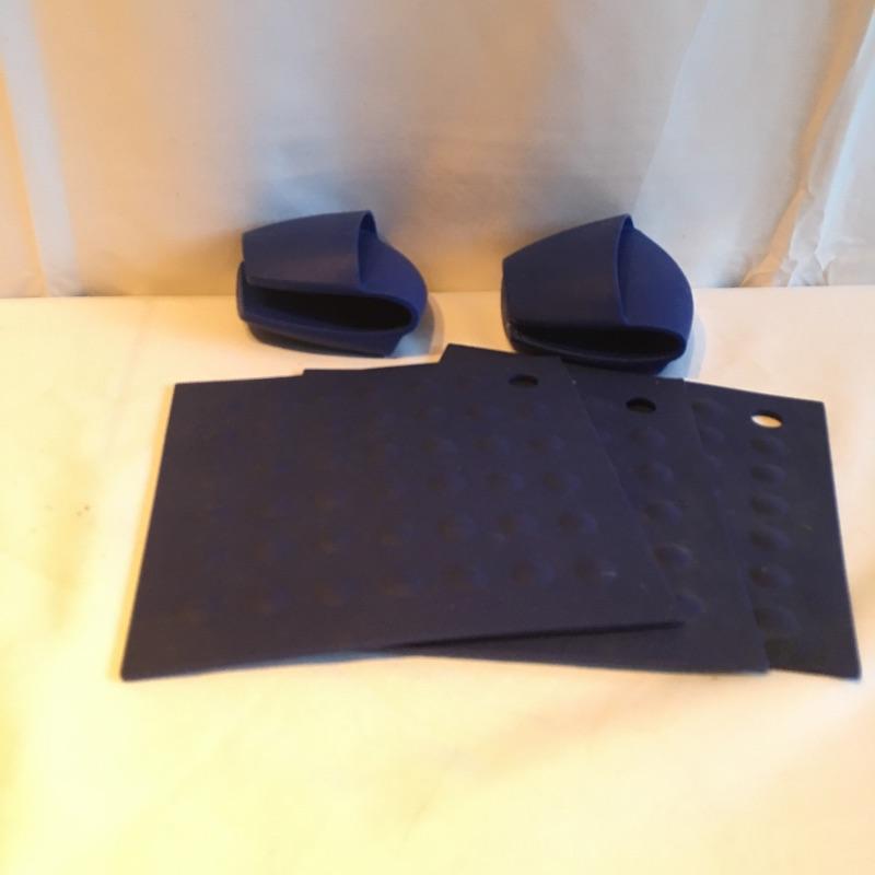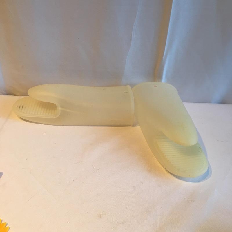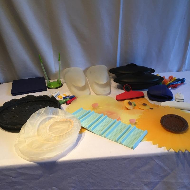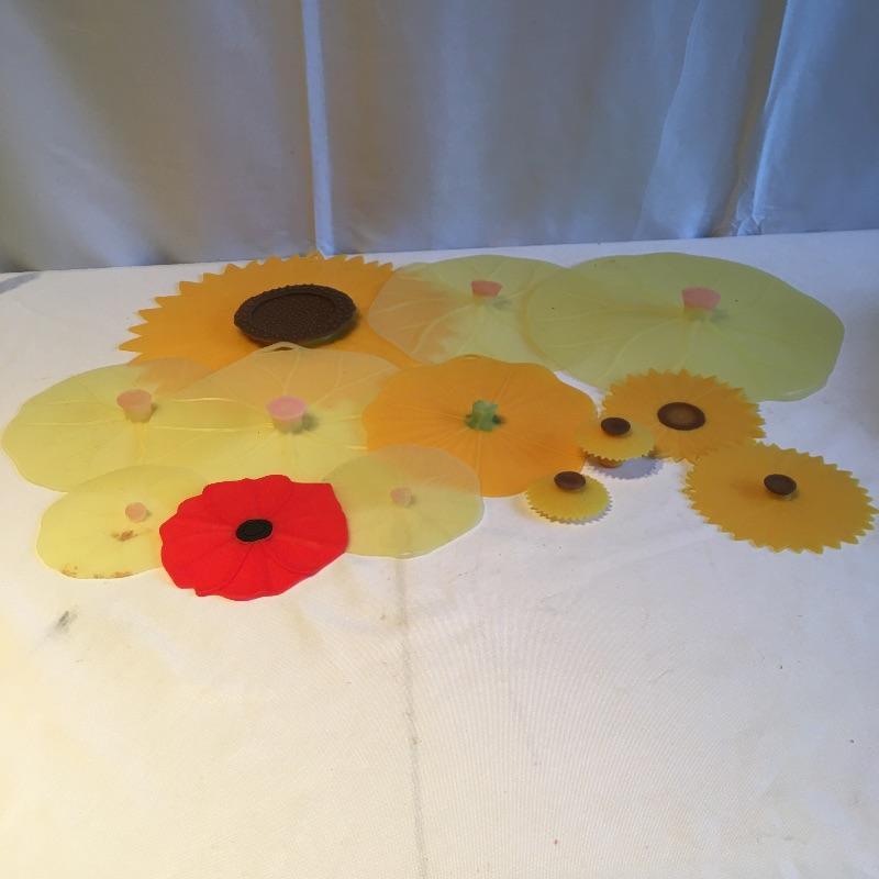 A great way to keep your food warm with these unique lily pad and sunflower covers by Charles Viancin. Lot also includes silicone dishes, cooling trays, gloves, pot holders and a array of bag closers. Largest cover measures 11”D.