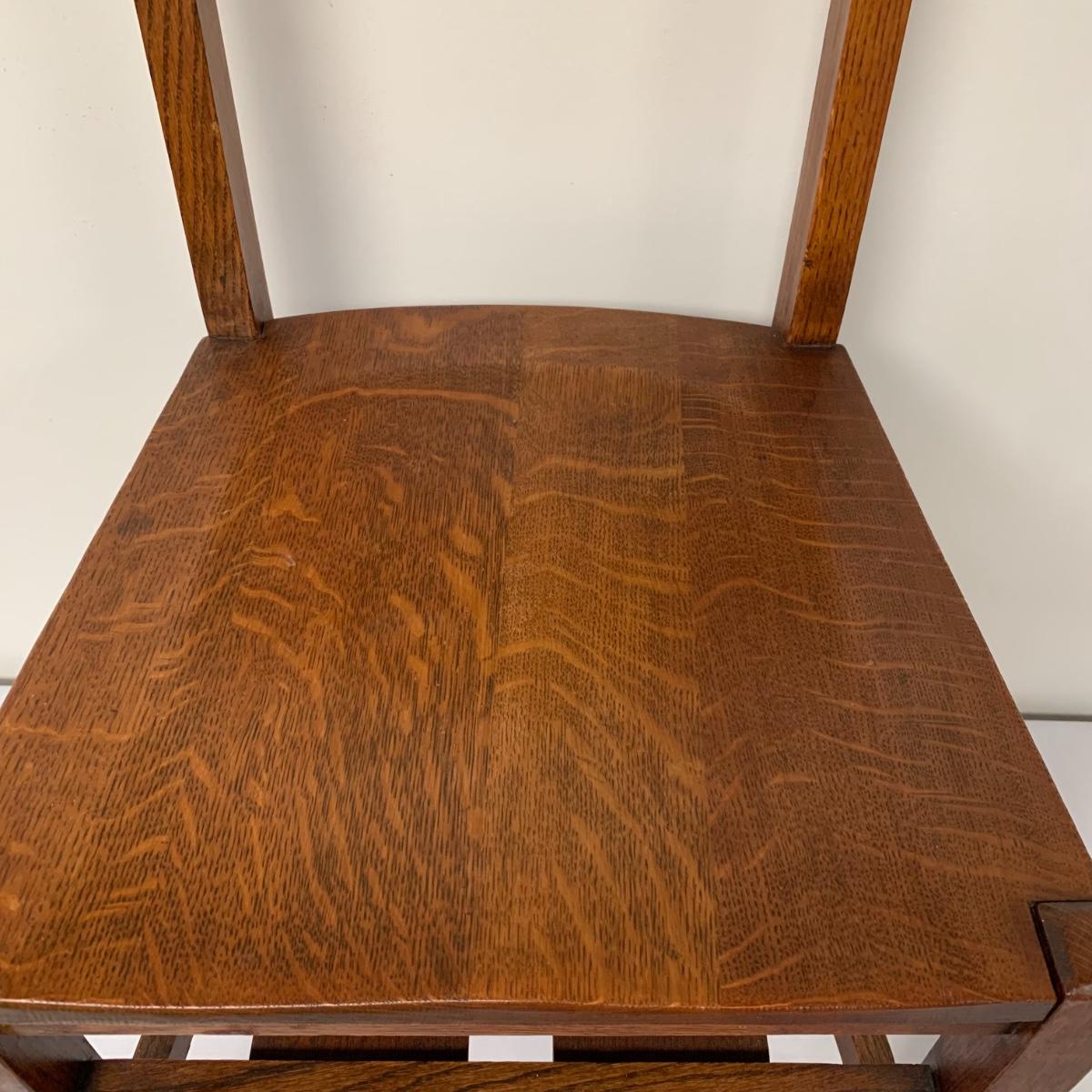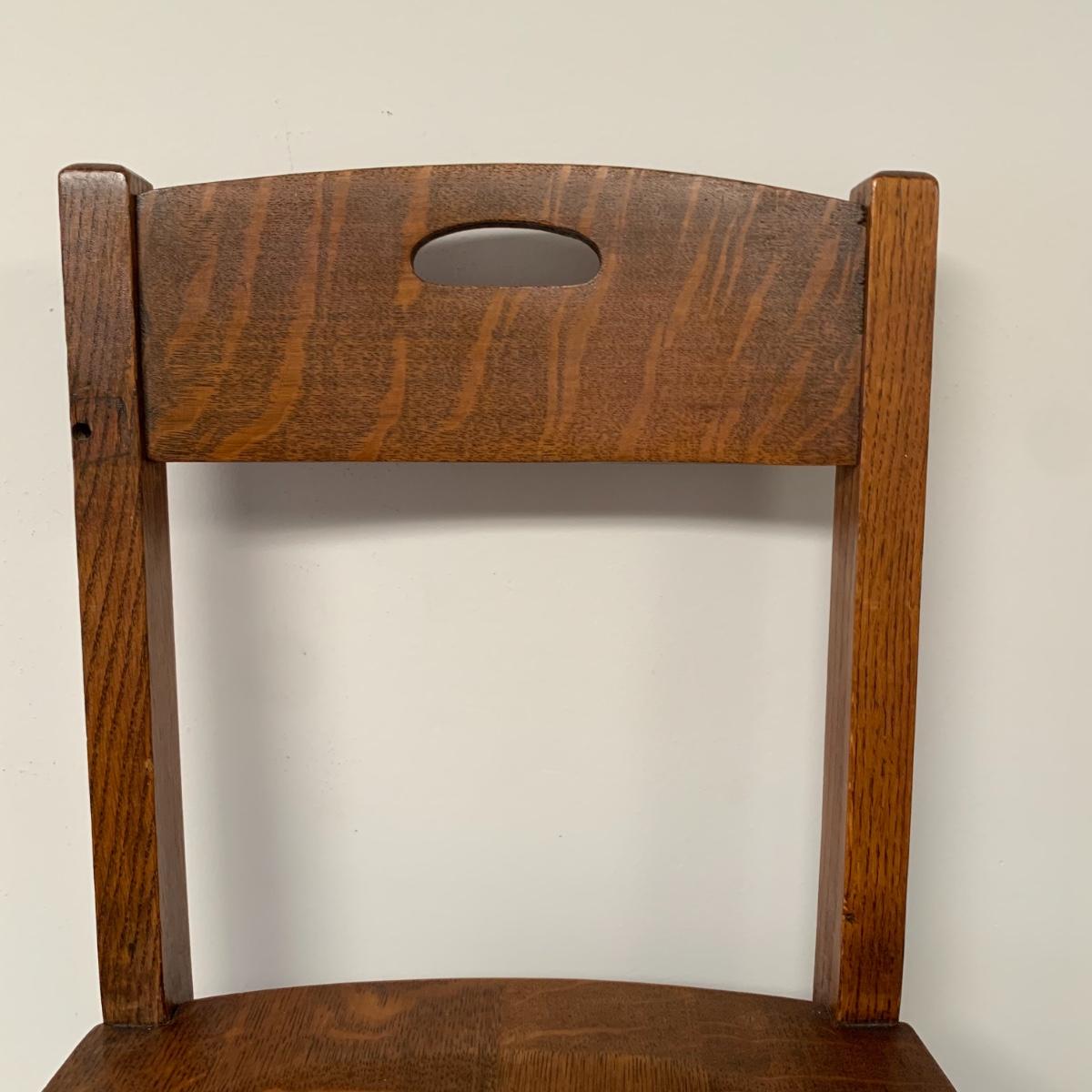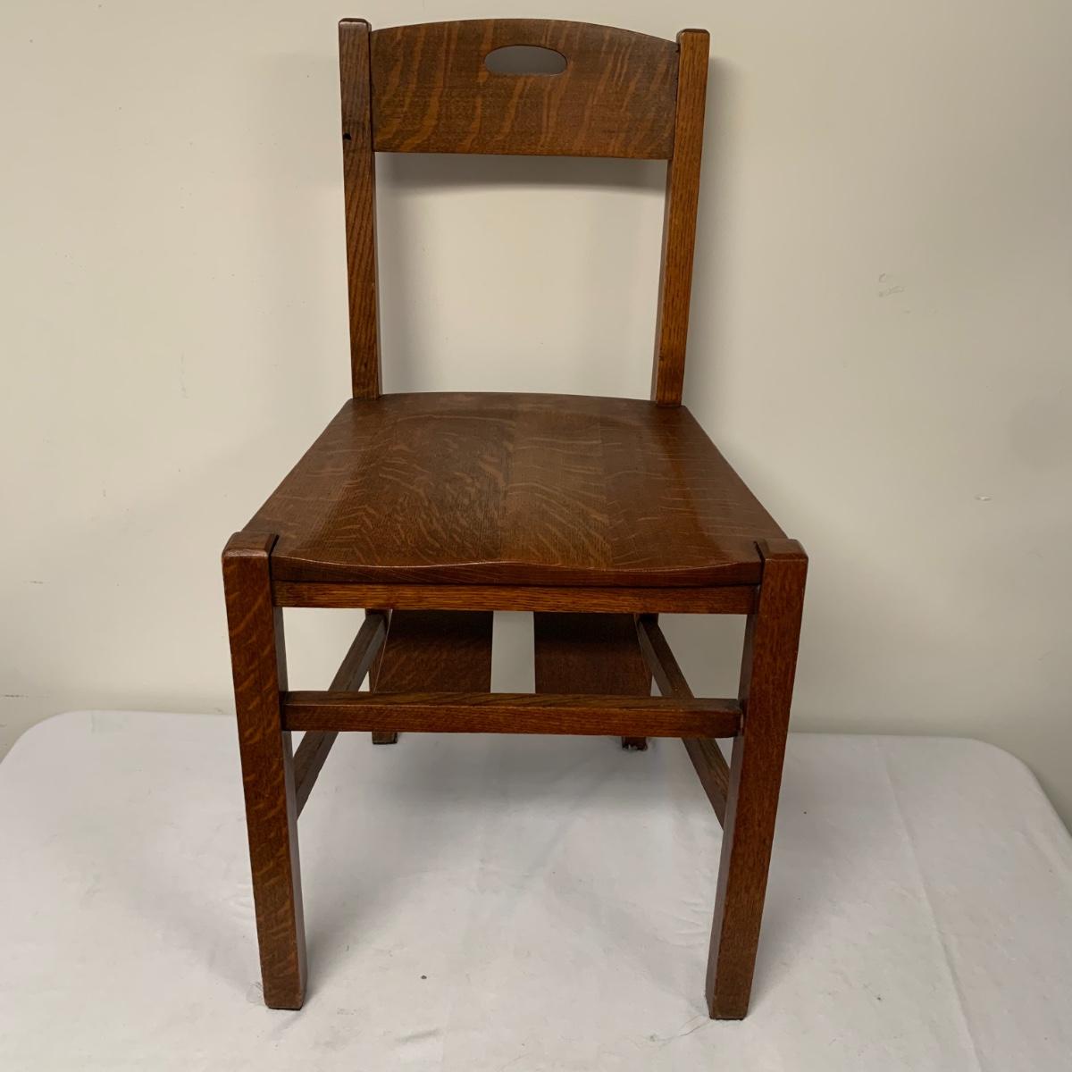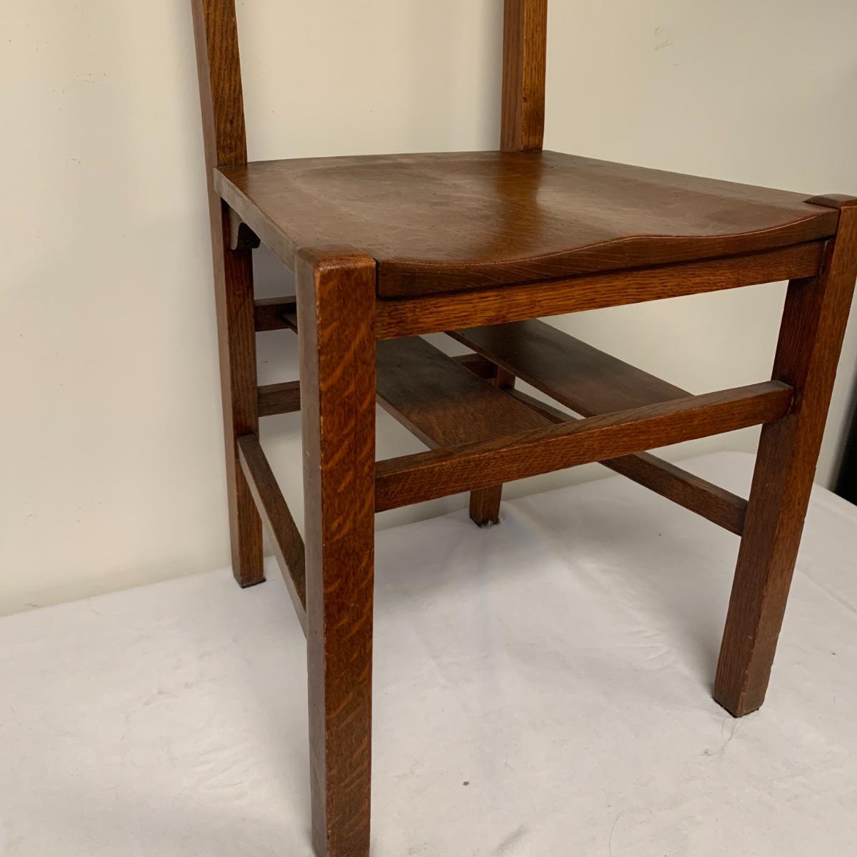This lot includes one darker wood quarter sawn chair. The chair is made of a thicker wood and has a small shelf under the seat. The chair measures about 16" x 17" x 31". Shipping not available.